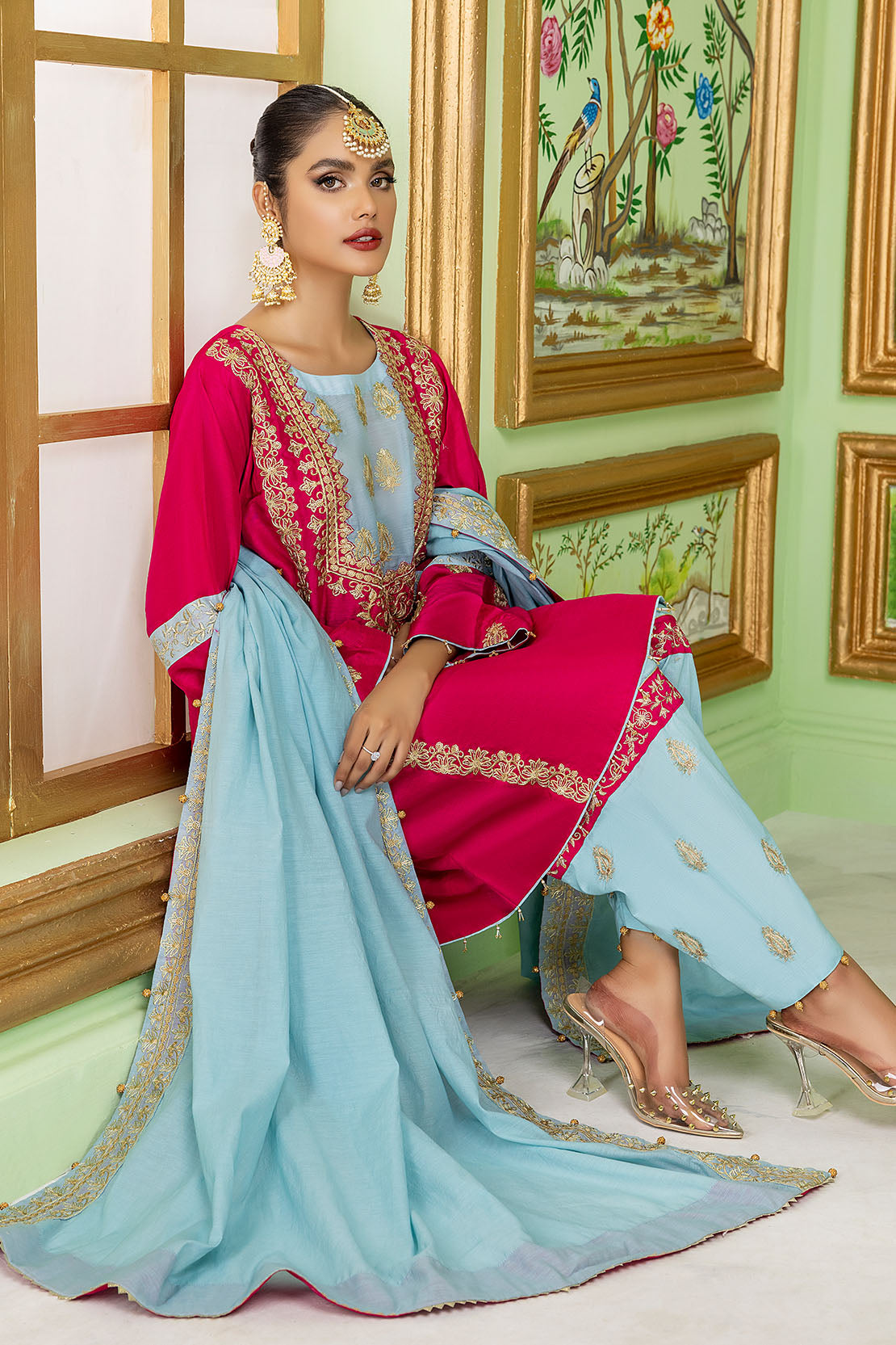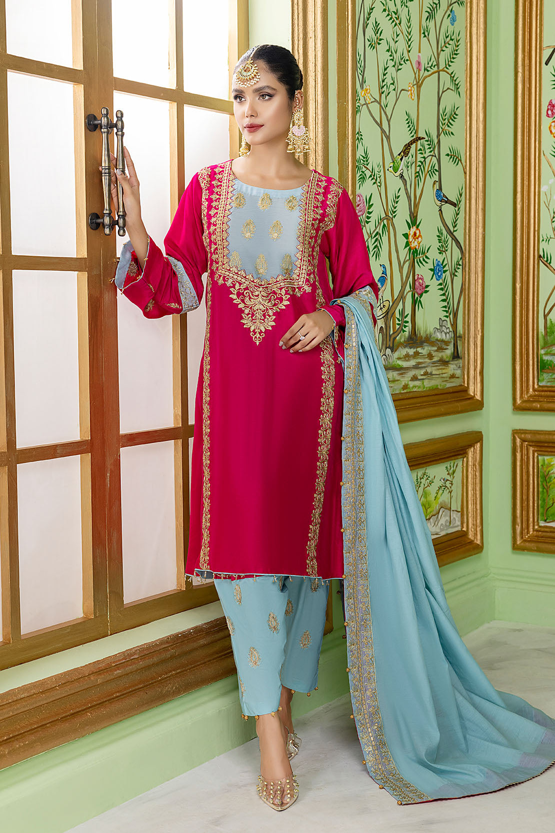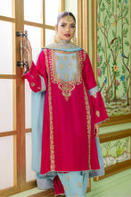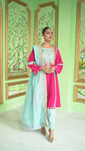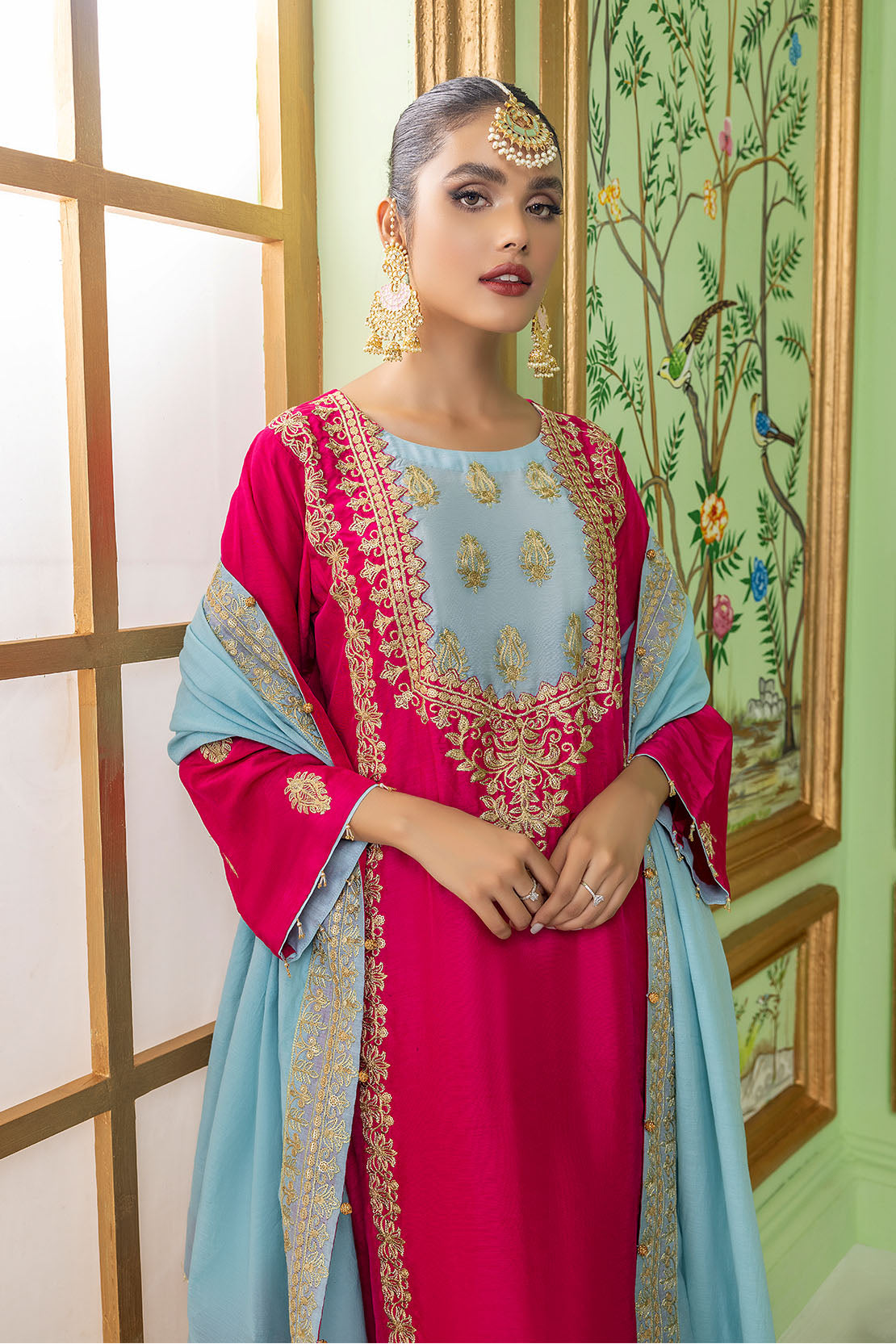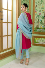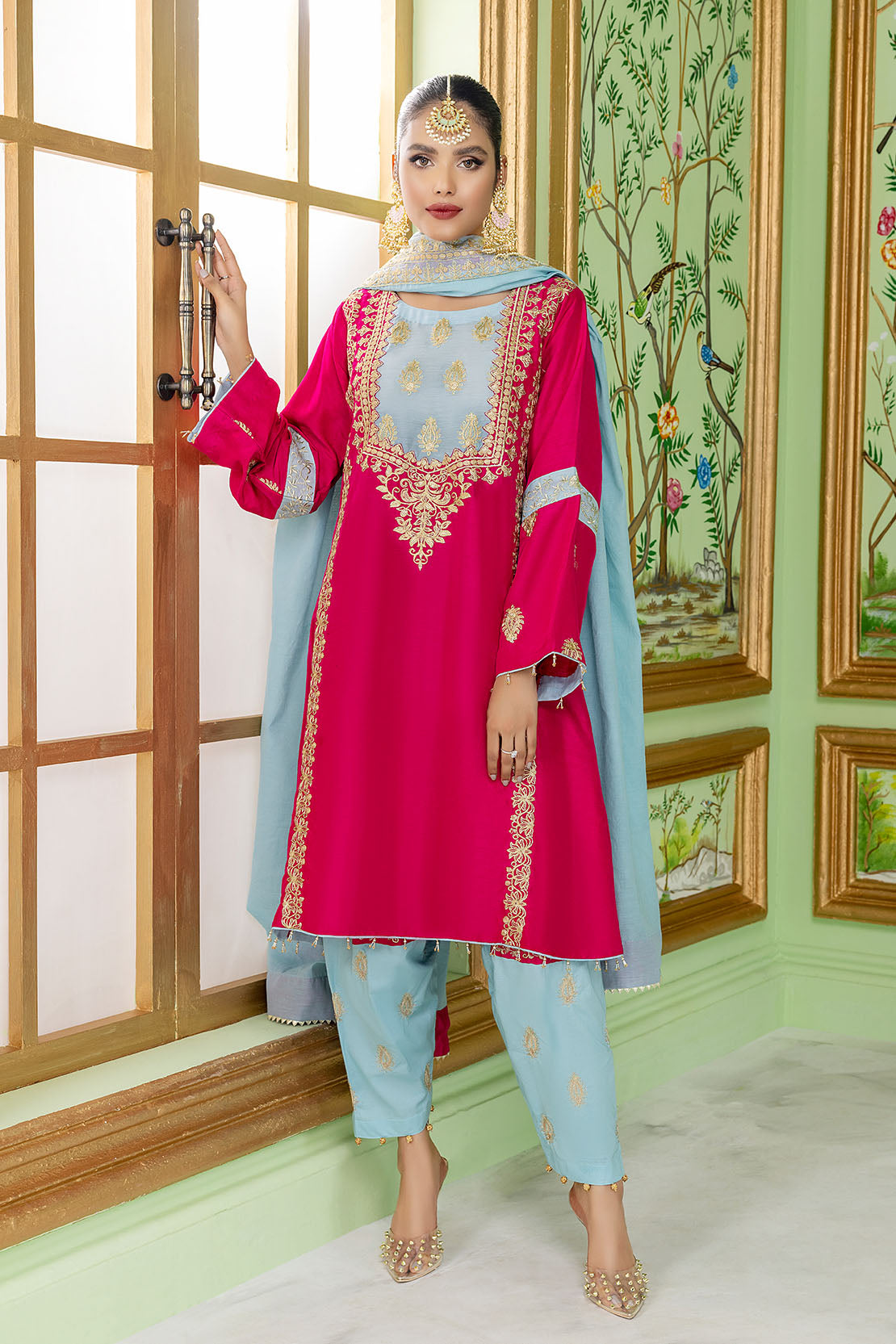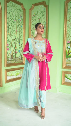 This relaxed rani pink pure raw silk kurta has ari embroidered floral imagery on the panels with heavy detailed embroidery on the neckline with inner patch, sleeves and borders in beige and gold threadwork along with tilla. The ensemble projects femininity. Paired with paper cotton dupatta with embroidered borders.