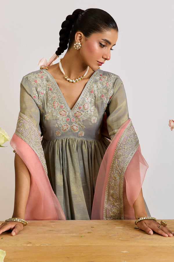PRODUCT DETAILS SHIRTSTYLE PEPLUM (ZARI)Embroidered and zardozi embellished bodice Fitted sleeves with embroidered and hand embellished borderEmbroidered necklineEmbellished neckline with zari workGotta details on hem SHARARAZari with gotta details shararaDUPATTAOrganza dupatta...