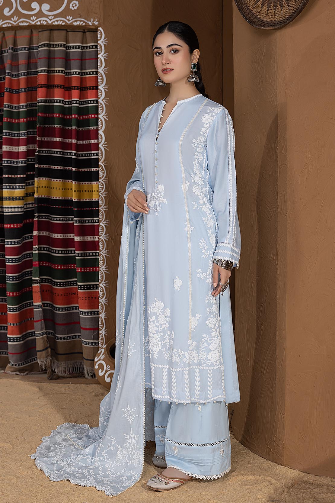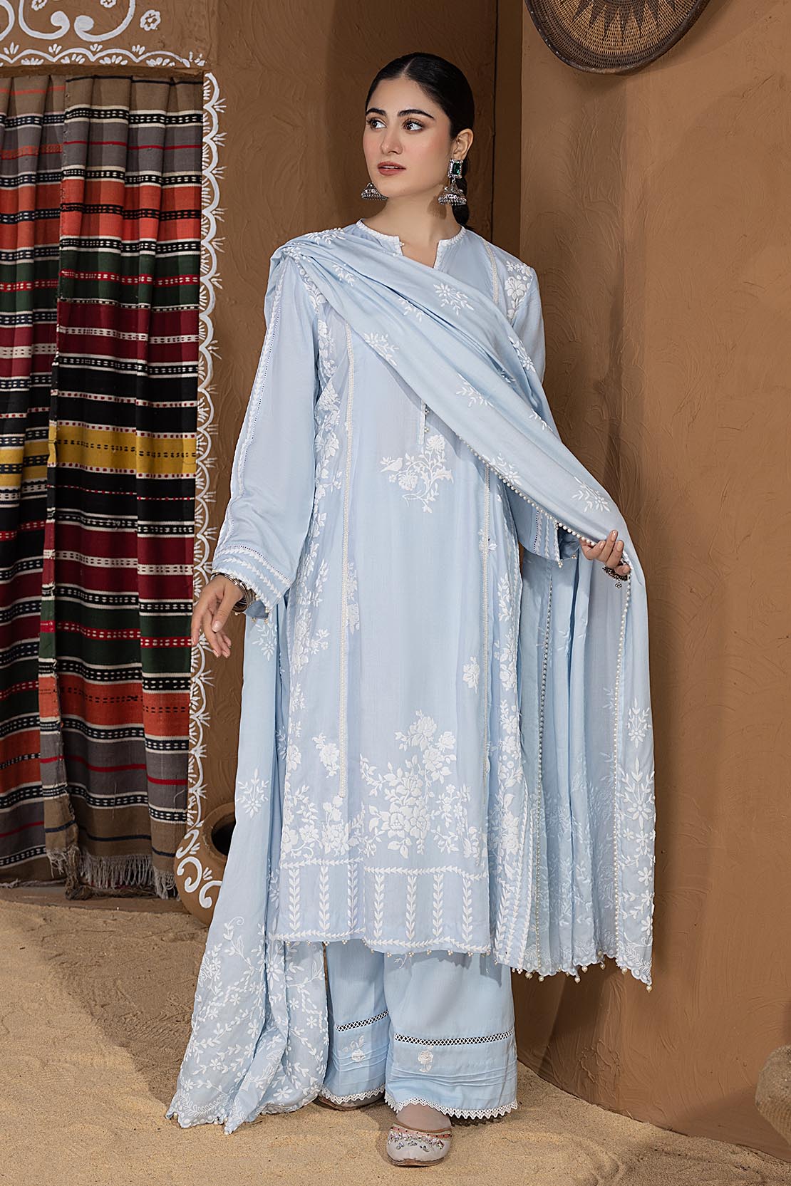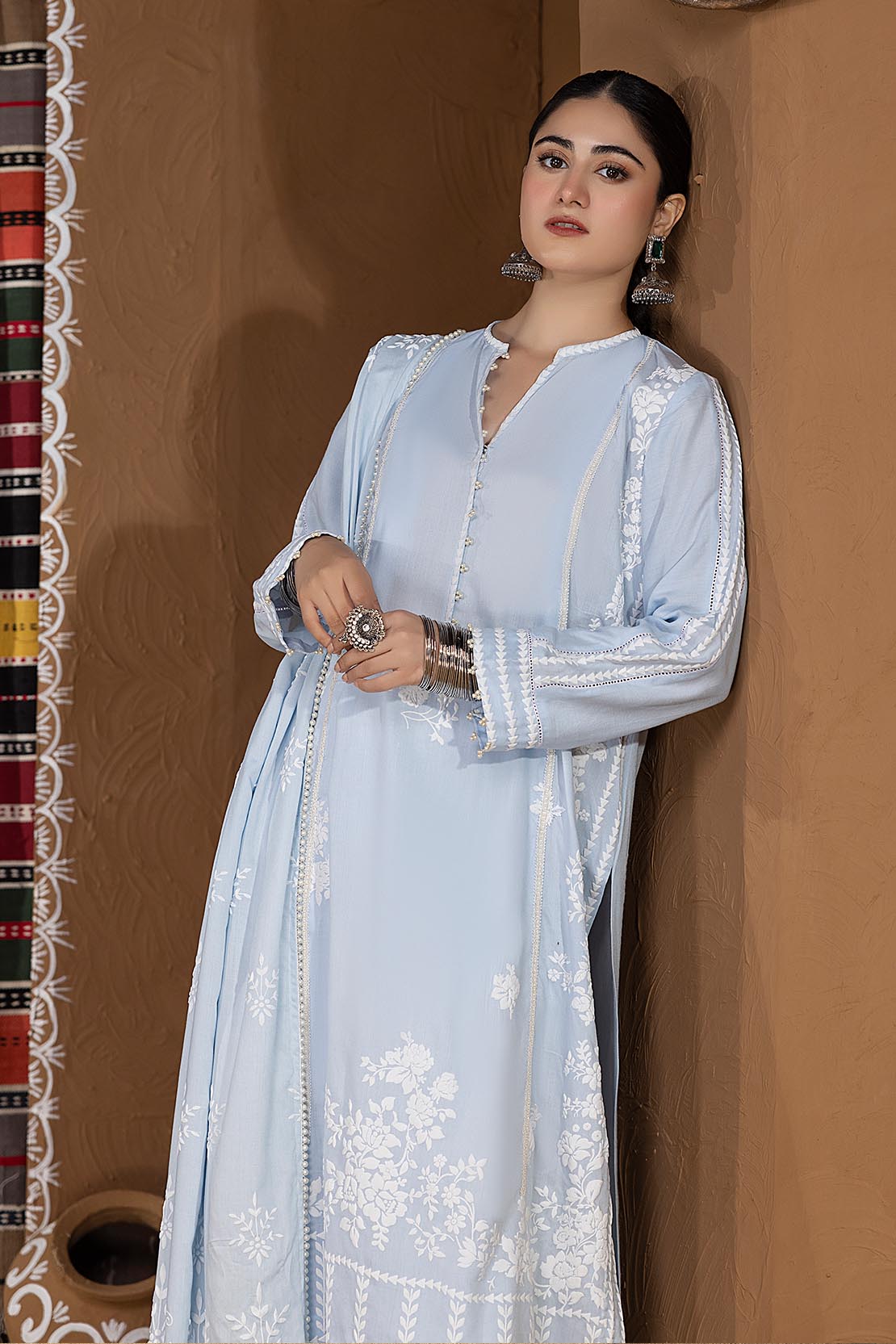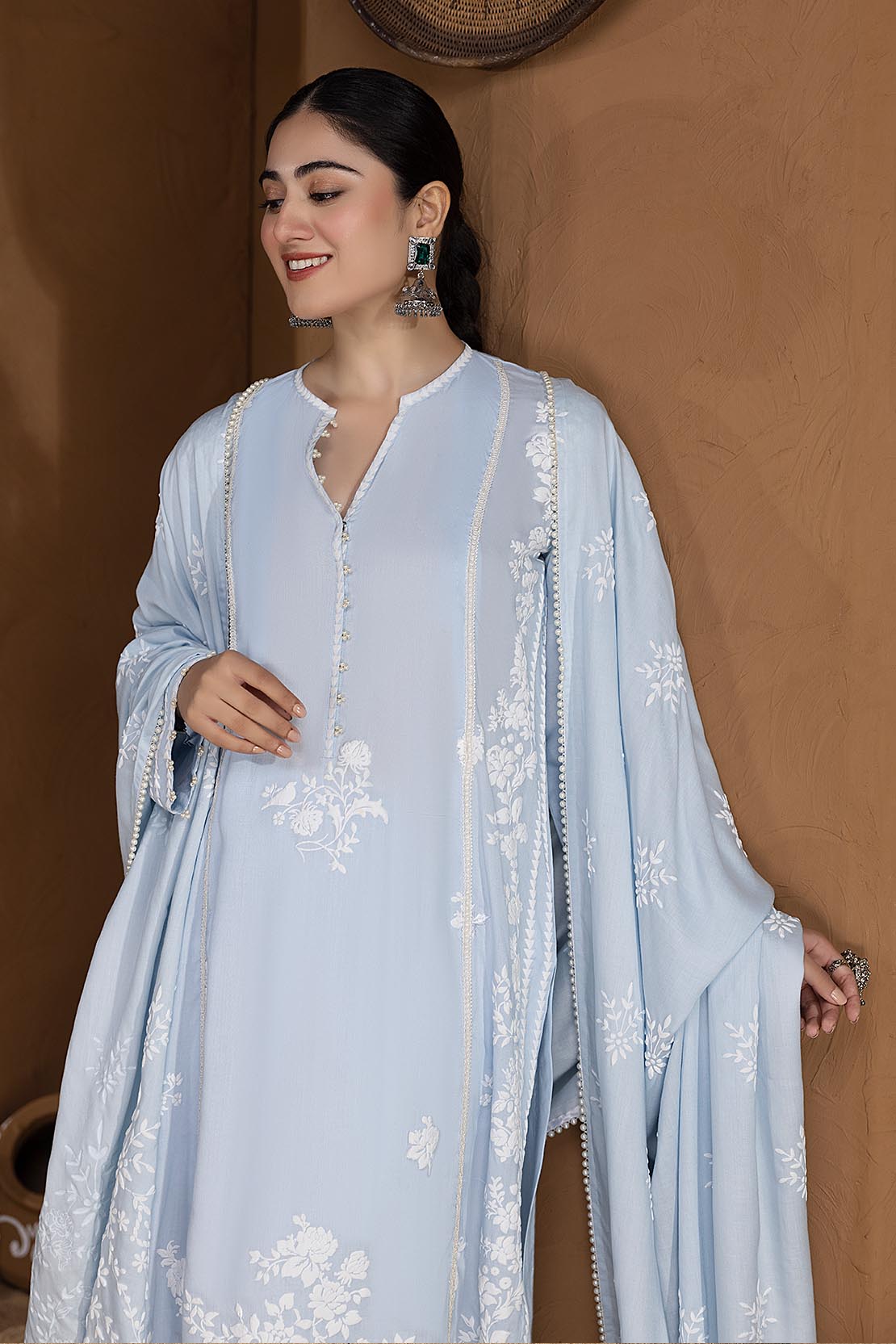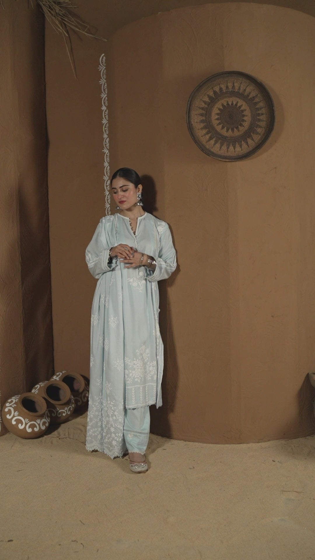 This ensemble comes in a winter friendly pure linen fabric dupatta with same off-white emboss-printing technique. This kurta is further enhanced with pearls details on neck hem and sleeves.