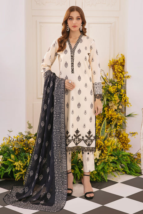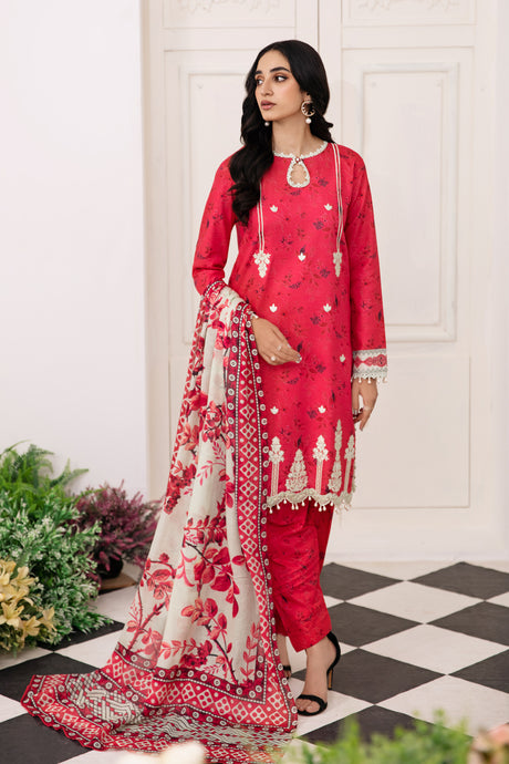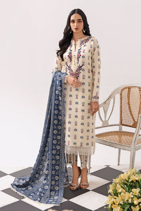 Curate the perfect winter outfit with our three-piece printed khaddar suit.