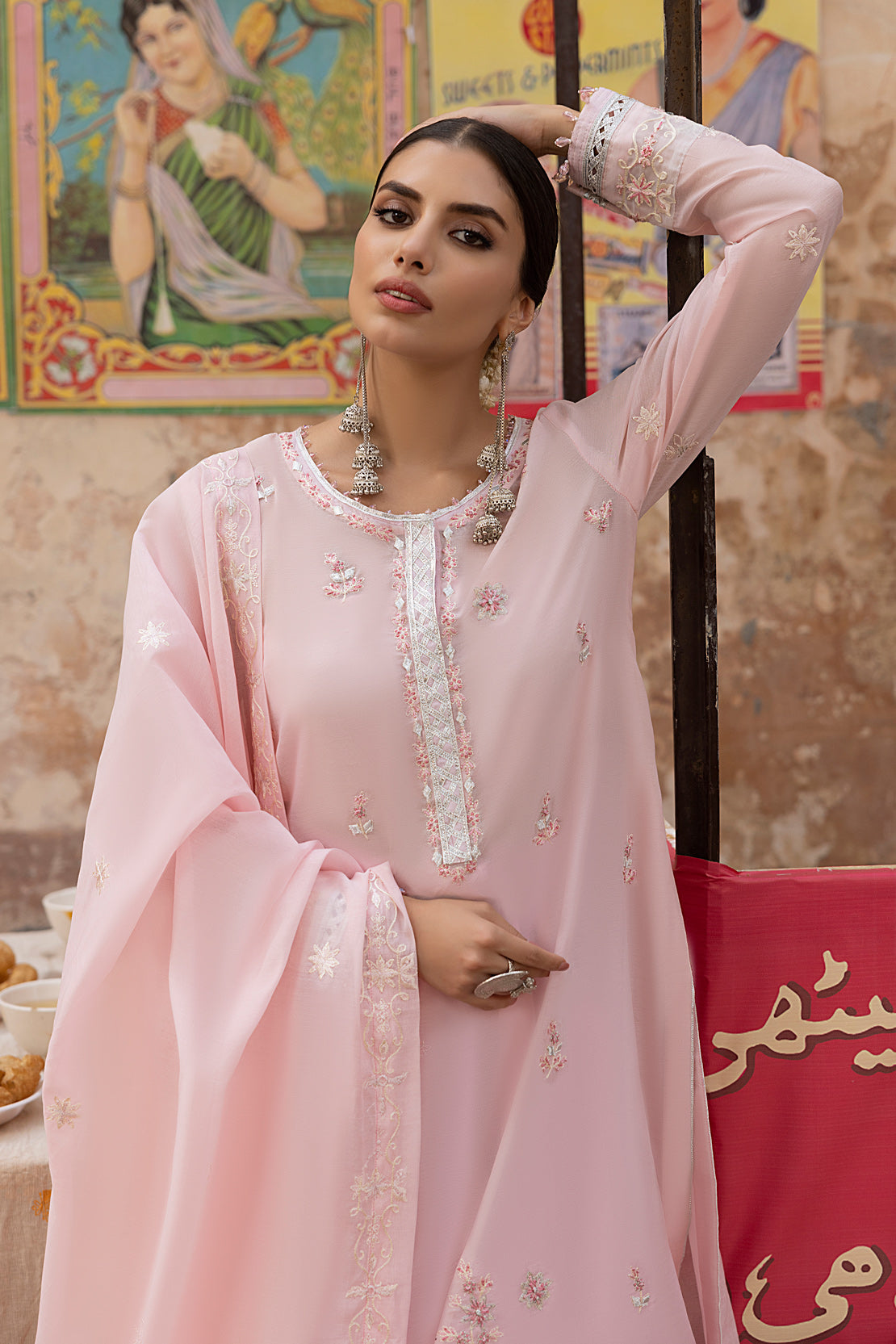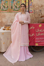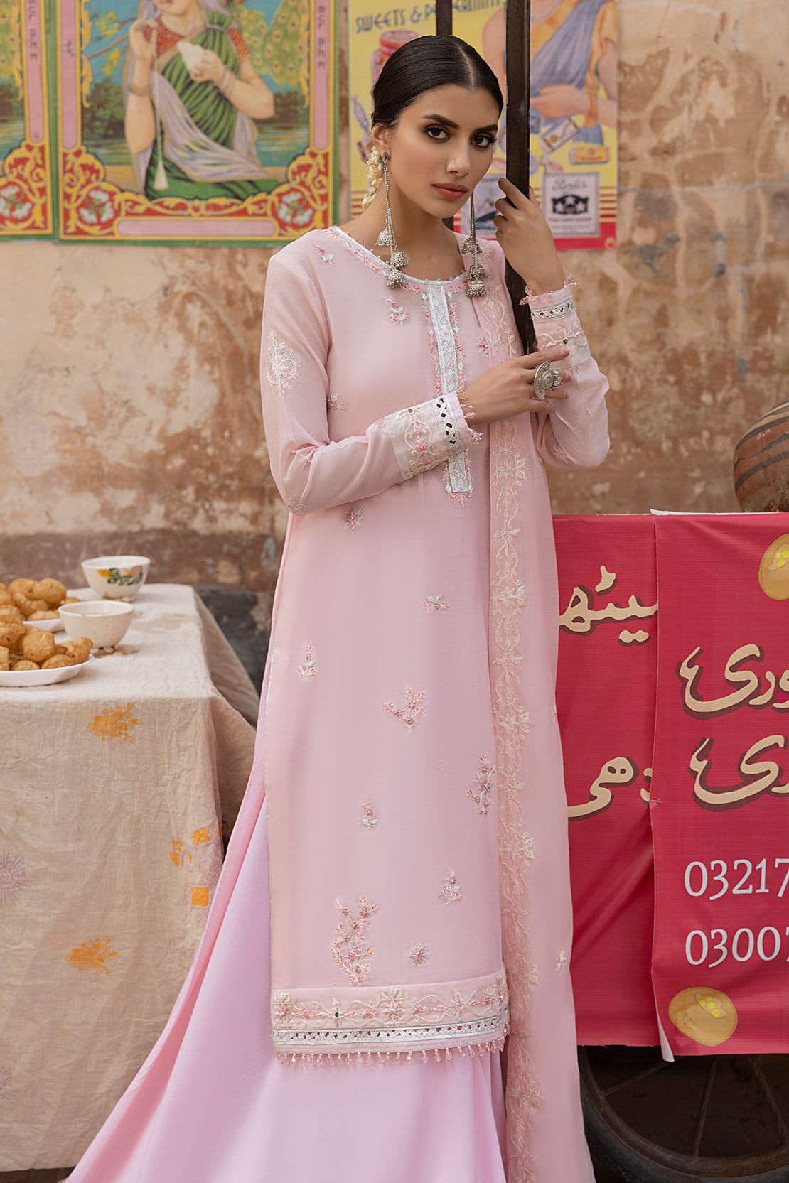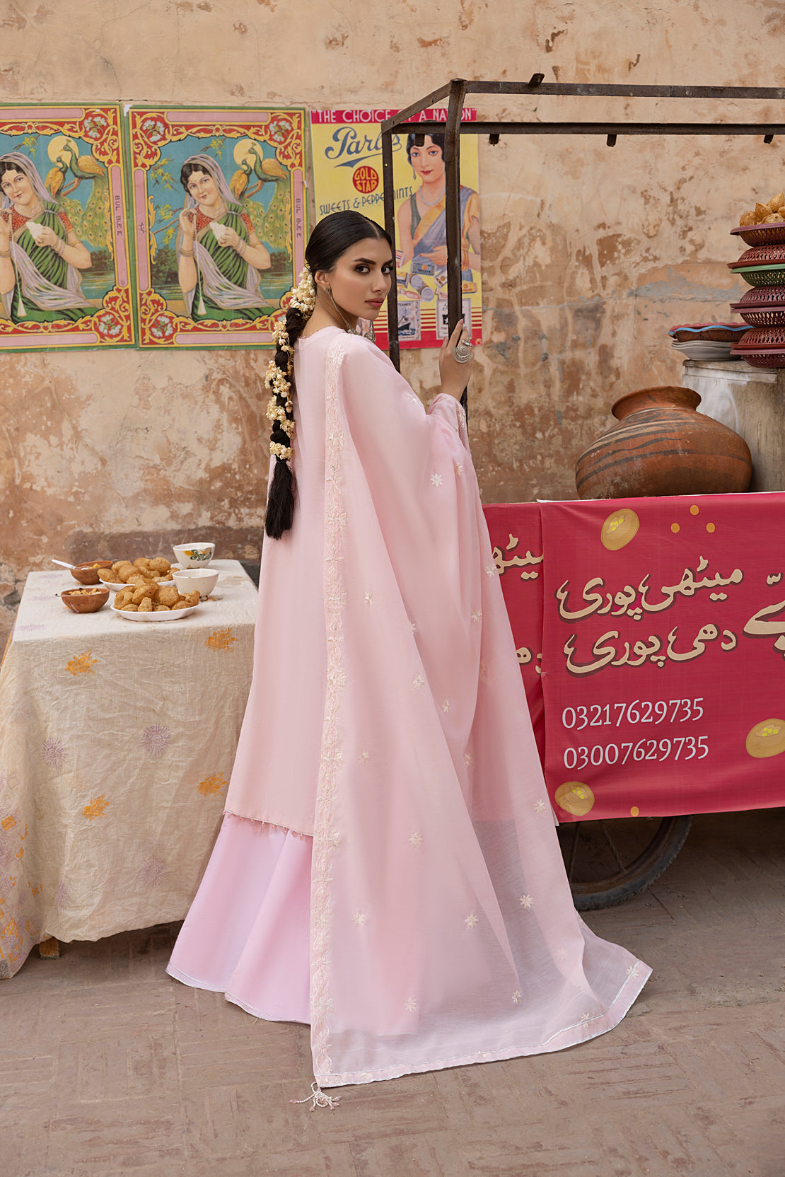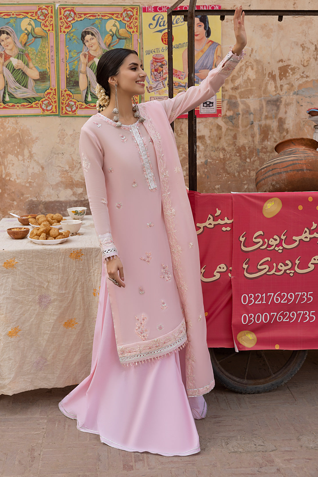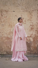 Create a regal vision in a pastel shade of pink on a paper cotton base. The set is artfully machine embroidered and hand embellished in silver tilla, gotta patti and heightened with gorgeous details of French knots. This beauty comes with a paper cotton base fully embroidered dupatta., paired with the same pink-colored khadi lawn sharara. Which Is surely going to be a regal statement this season.