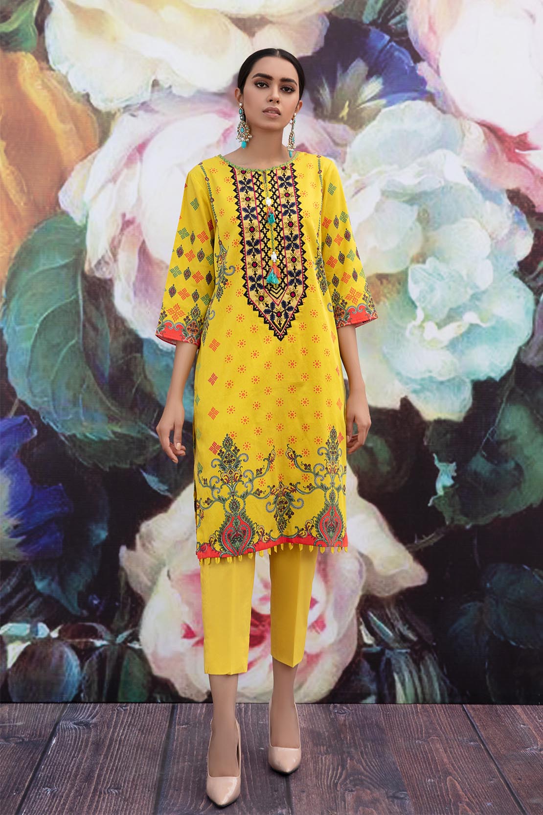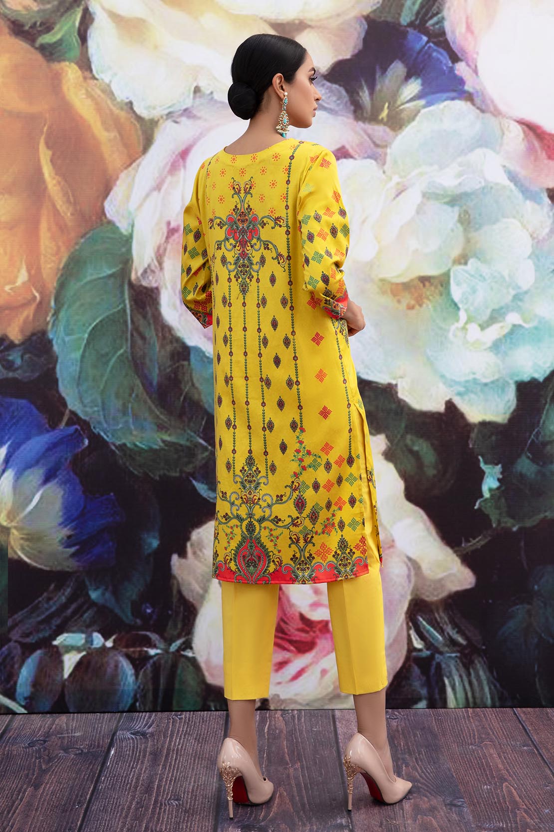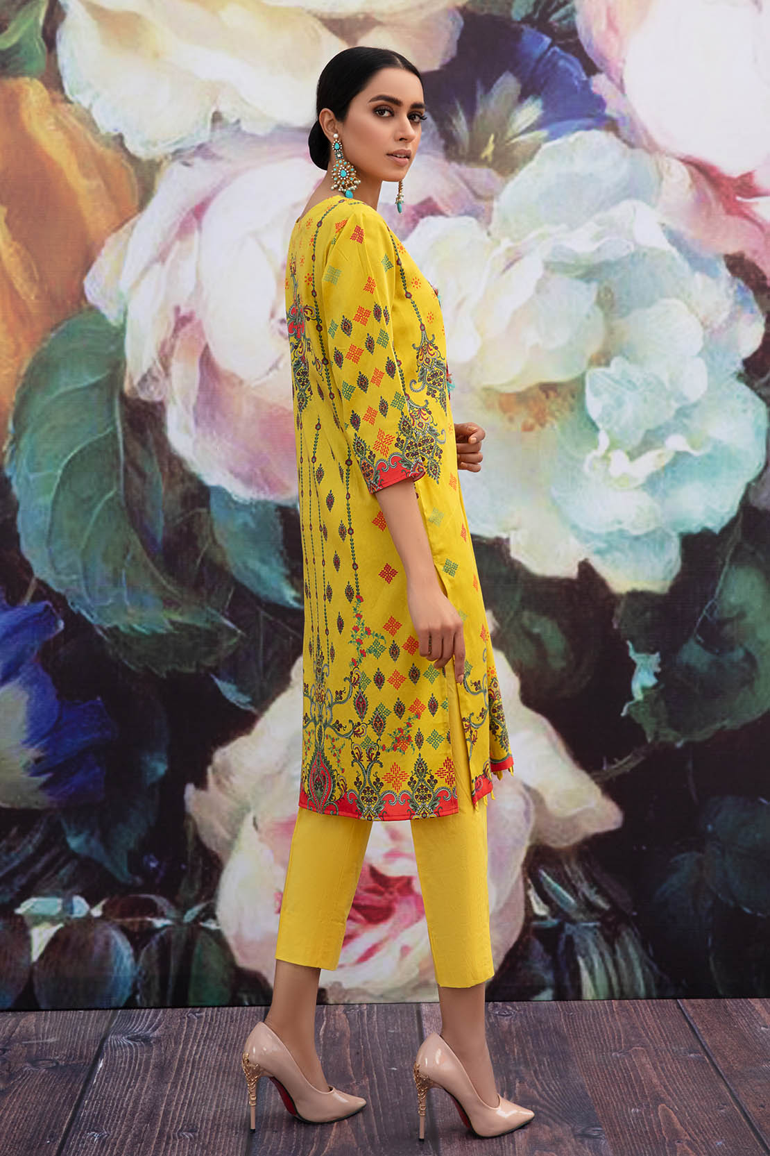 A vivacious design beautifully rendered using colorful motifs styled as a long flowing silhouette.