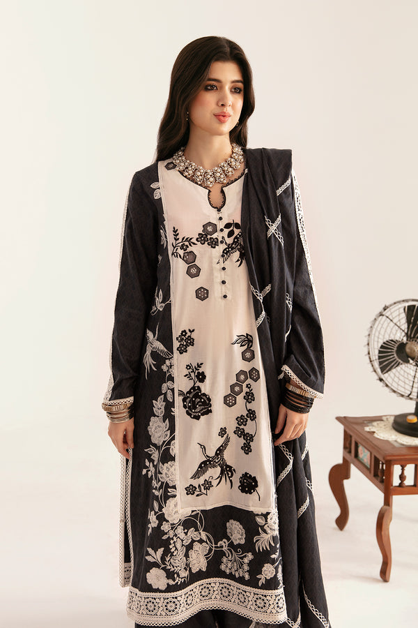 3 Piece: Shirt, Dupatta, and Pants Spring into summer in this contrasting white and black lawn kurta, adorned with embroidered florals and ornamental imagery on a digital print base -...
