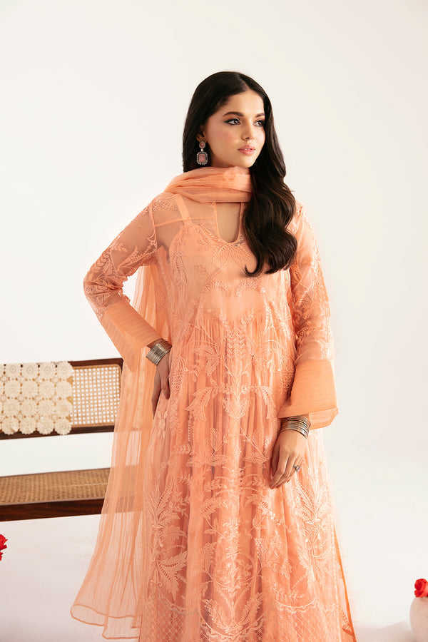 3 piece: Shirt, Inner, and Dupatta Angaan, from the So Kamal Eid Collection 2024 is a refreshing peach flared shirt on an organza base. This Eid dress design is beautifully...