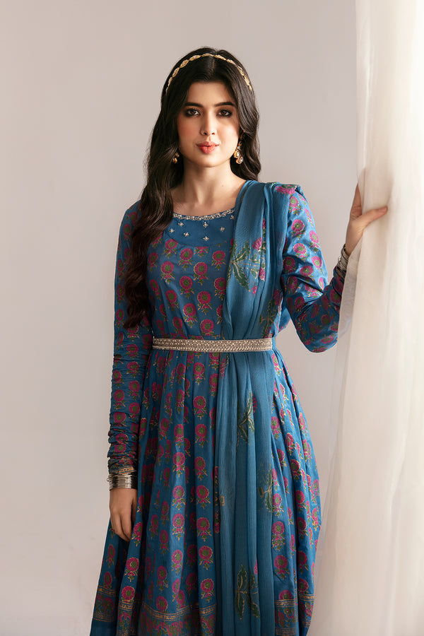 2 Piece: Peshwas and Dupatta Colors that express your personality; prints that hum to the senses. This gorgeous Anarkali set on a stone blue lawn base, block printed with Mughal-inspired...