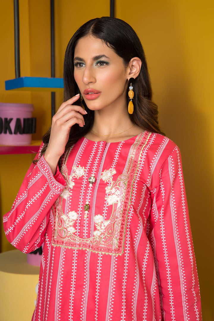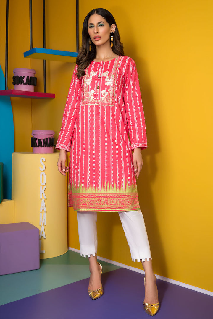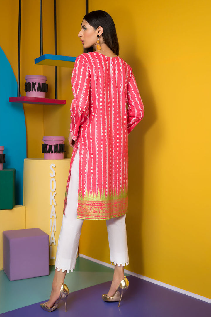 Combining the warmth of hot pink shade with the delicacy of lime green glittered paste in this alluring one piece with the contemporary neckline.
