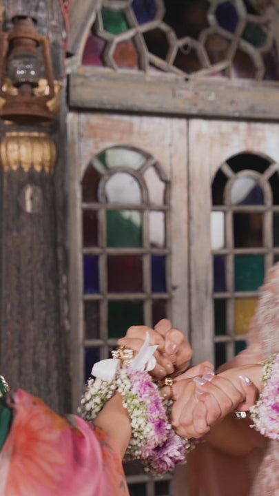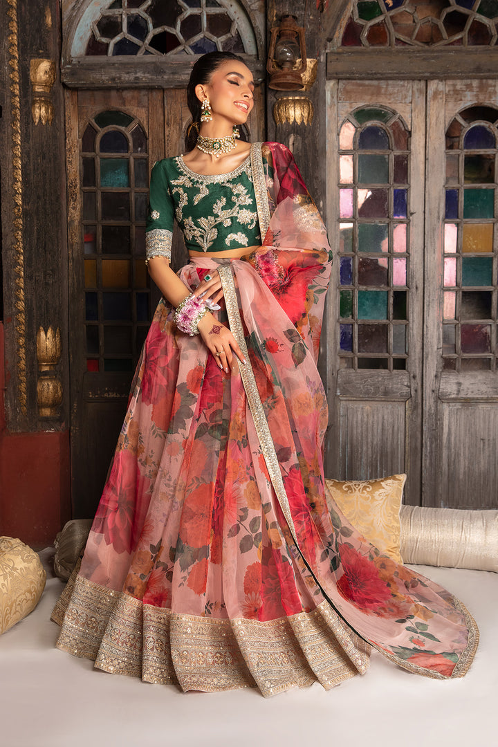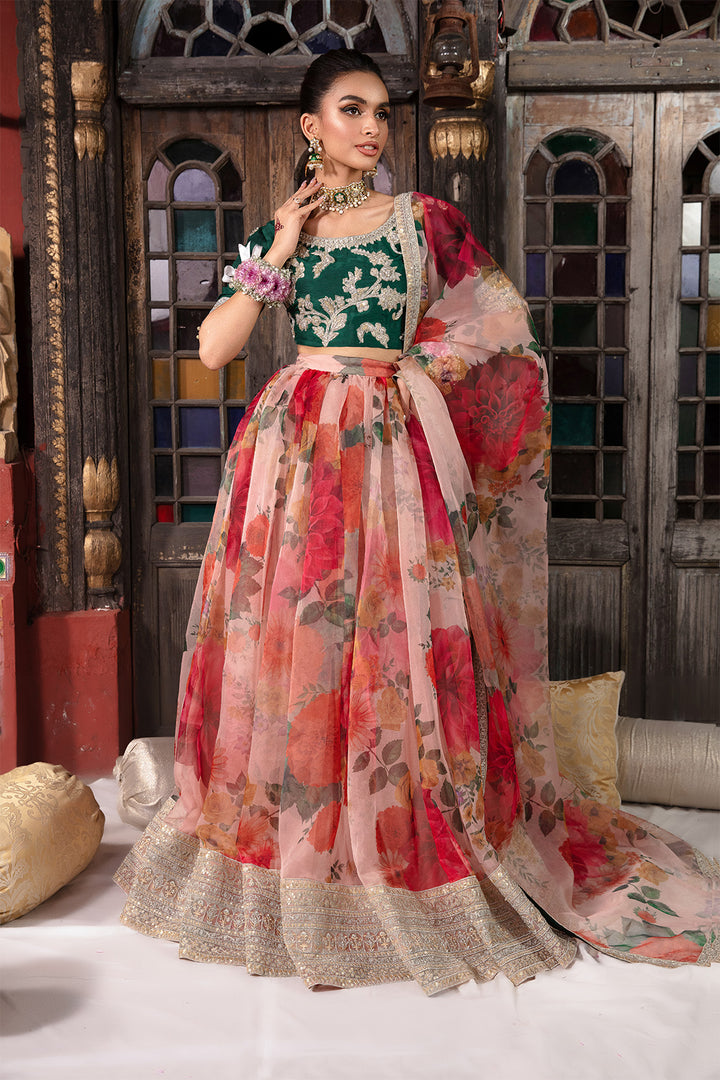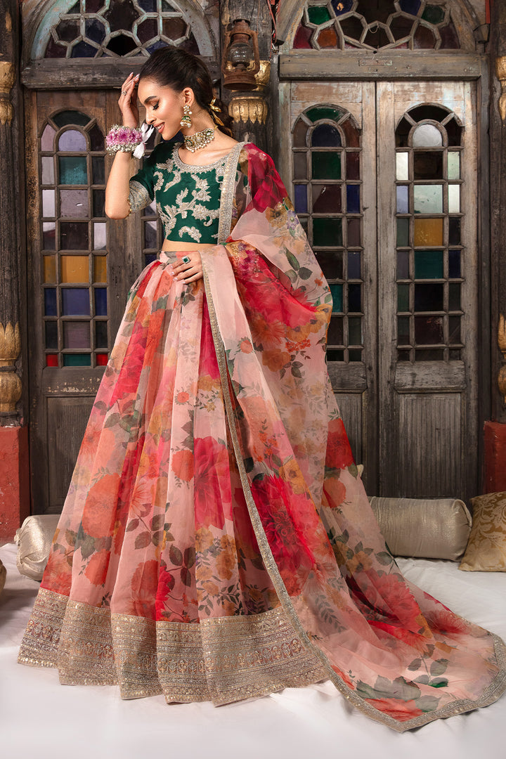 Timeless yet contemporary. Our lehnga set from ‘Tappe” are designed for the dholki nights of today. The emerald green raw silk choli, which is artfully embroidered and hand embellished in crystals along with zardozi work. This lehnga set comes with a flared digitally printed floral lehnga on a pastel organza base finished using heavy tilla and sequins embroidered border. Paired alongside same organza digitally printed floral dupatta finished thru embroidered border detailing’s. Perfect for any celebration, they combine exquisite detailing with comfort and style.