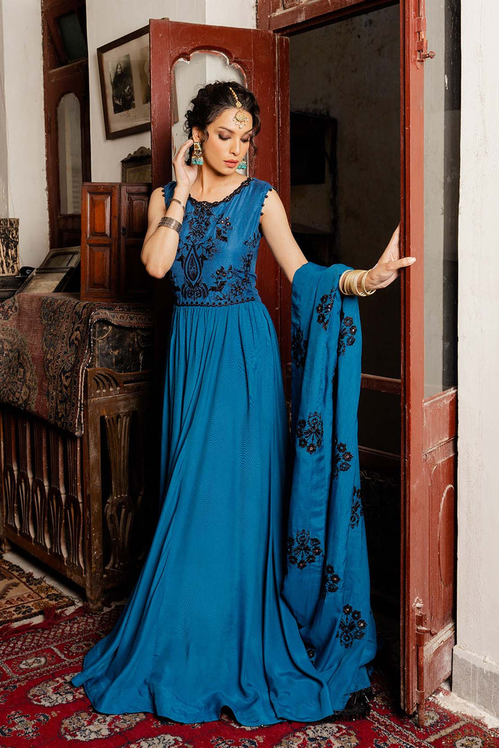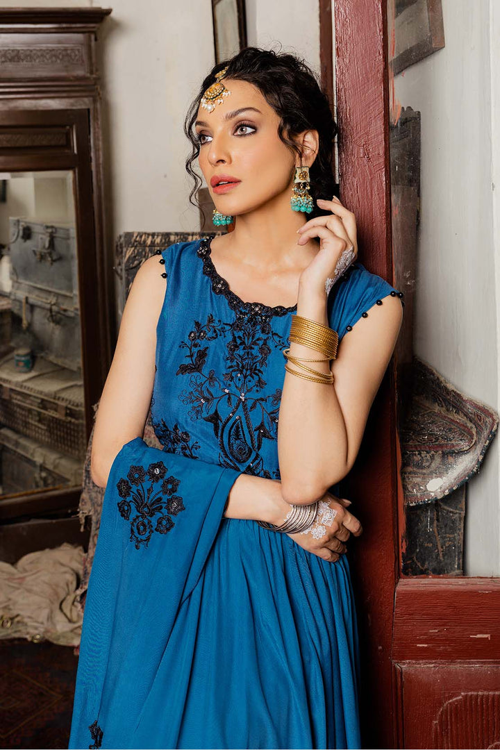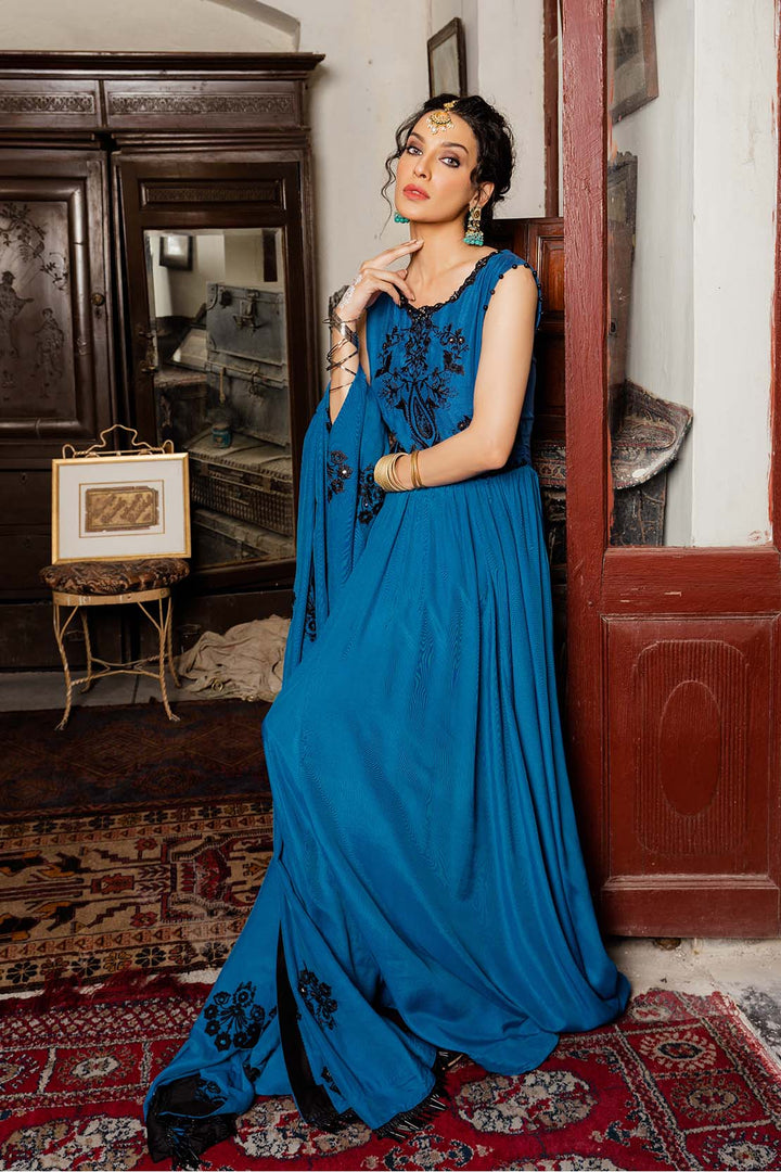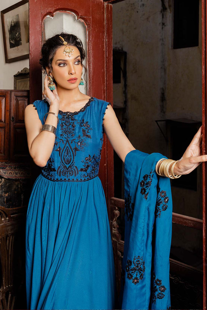 Rendered in Azure blue hue and laden with timeless black embroideries with panni embellishment grip bodice along with embroidered sleeves and embroidered composition with panni on a dazzling shawl creating a perfect evening festive look.