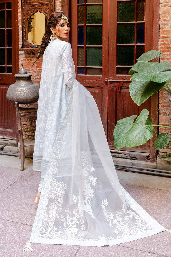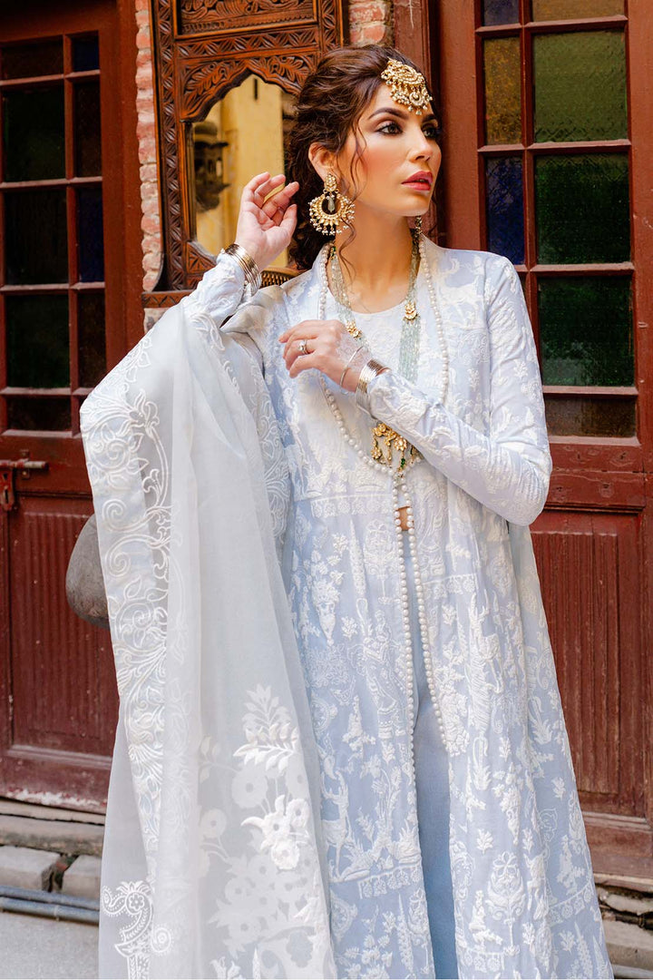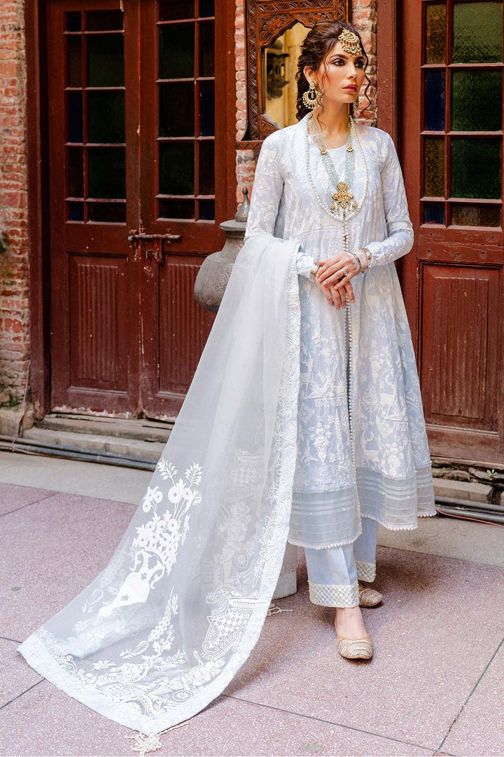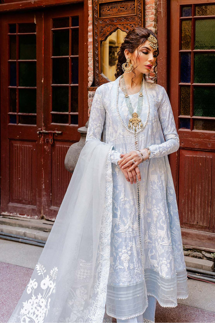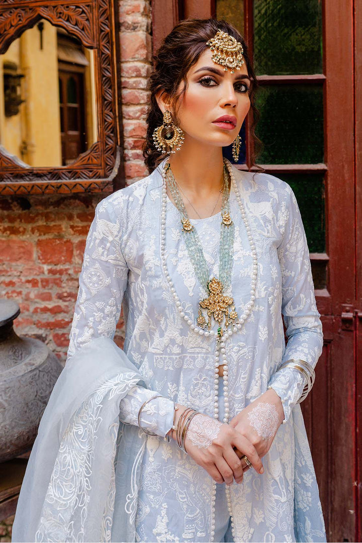 The essence of extravagance in this detailed powder blue ensemble created using flock printing technique on dyed cotton, designed to give an admirable look, paired with a similar toned organza dupatta with pearl lace to give a delicate finish to the ensemble.