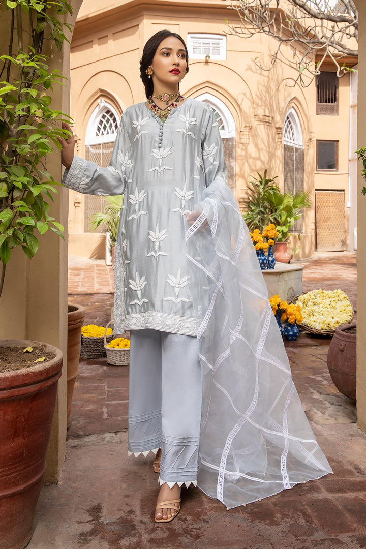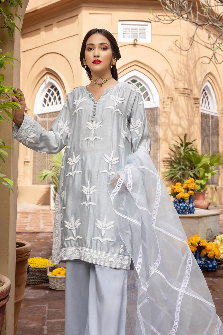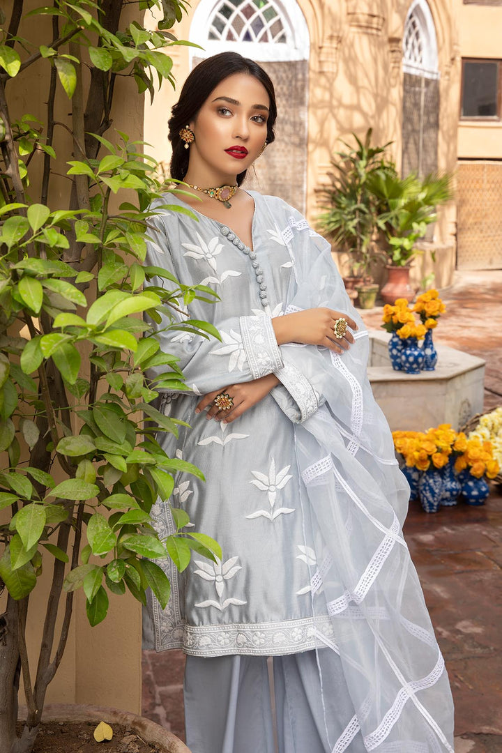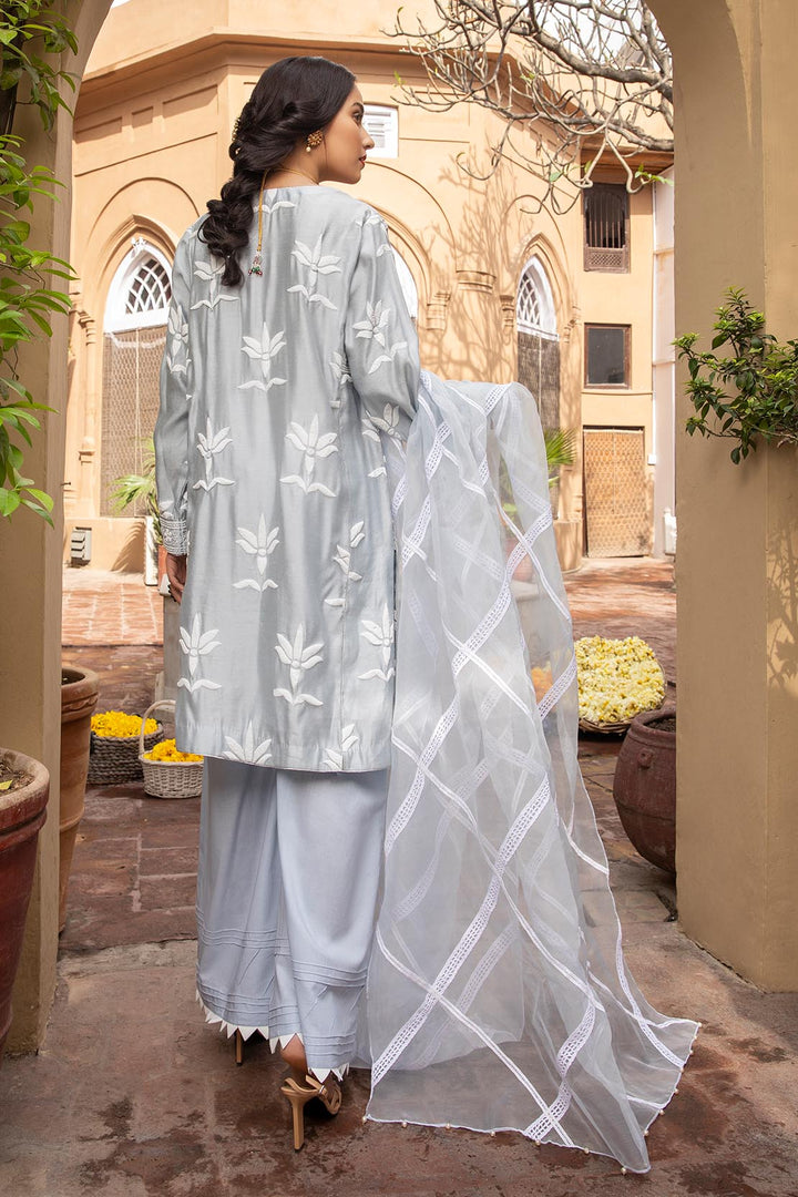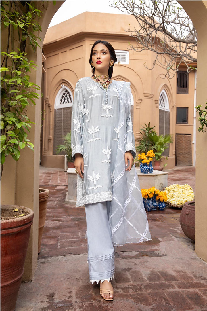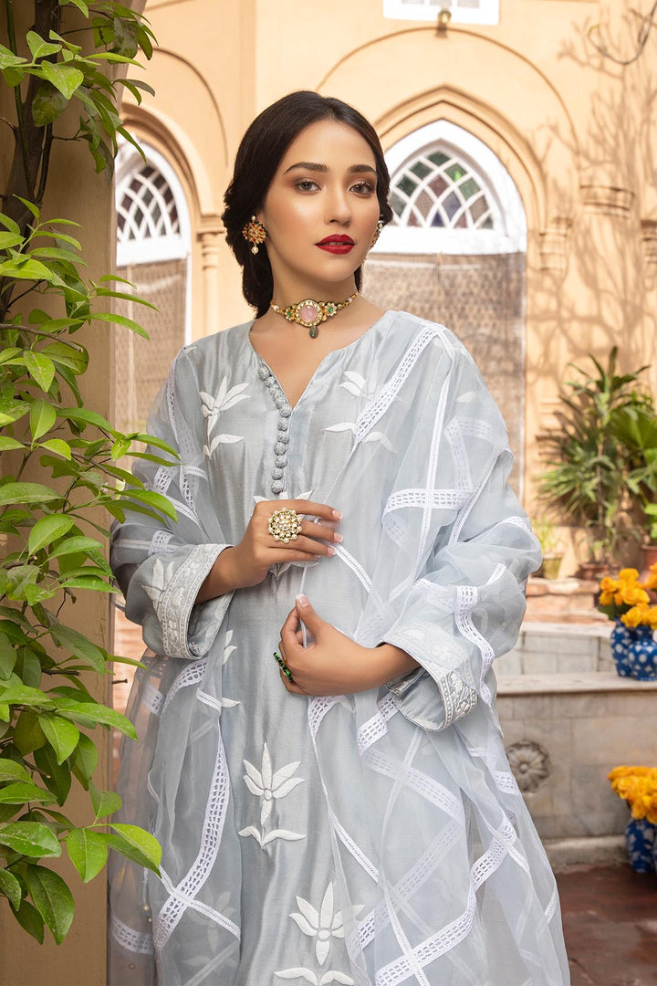 The ice blue khadi cotton net shirt is tastefully adorned with an elegant flock printed floral motifs keeping the shirt classic with an addition of tilla dorie and handmade tilla wrapped fabric buttons, this traditional garment is paired with a charming tonal organza dupatta enhanced with a criss-cross pattern made with range of different laces to create a finished look.