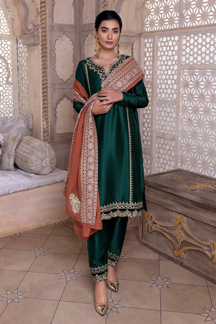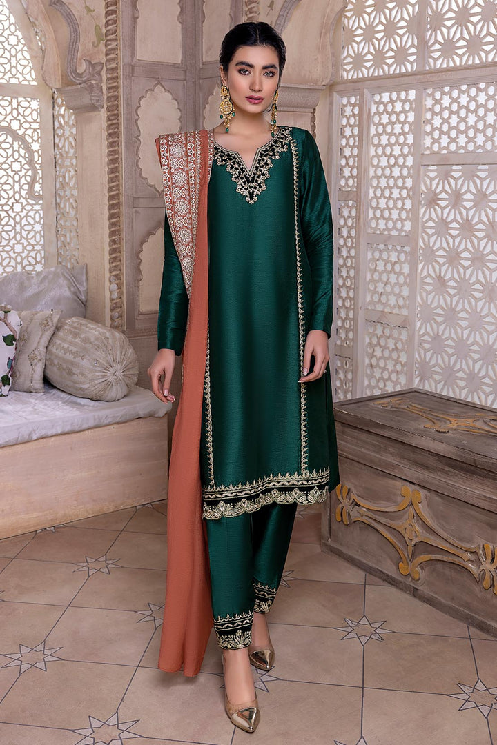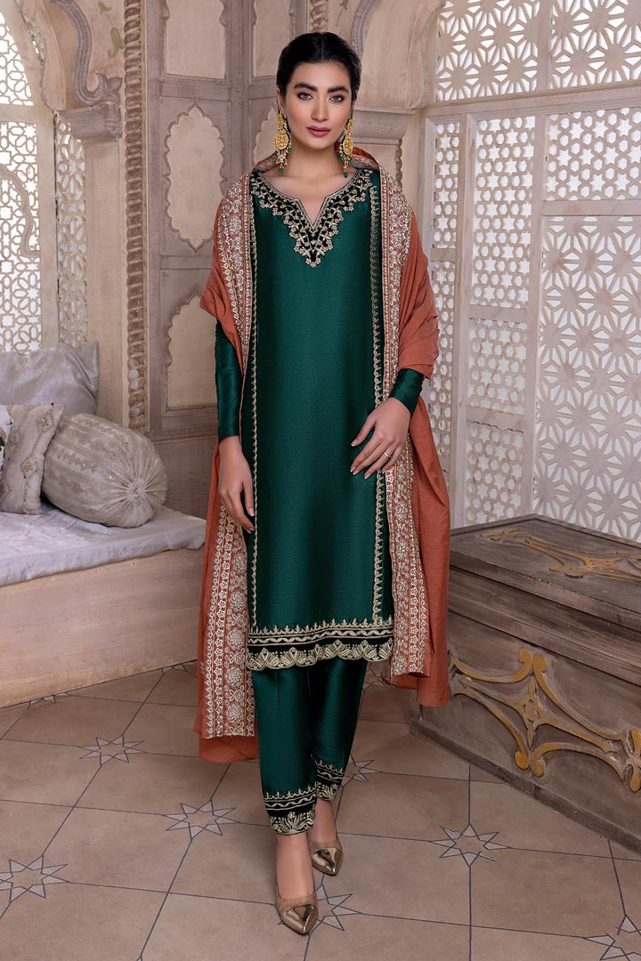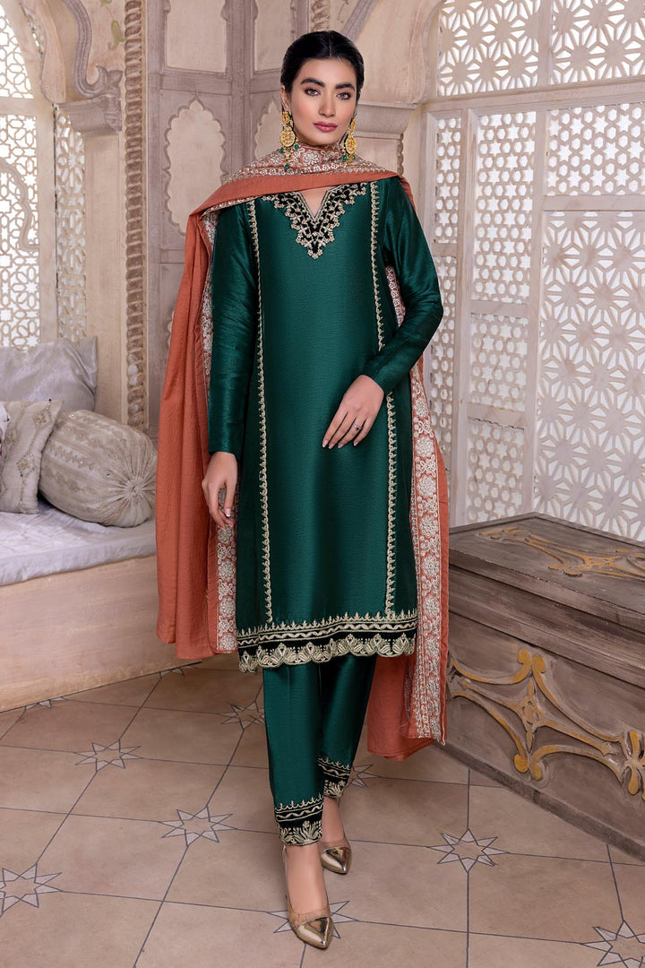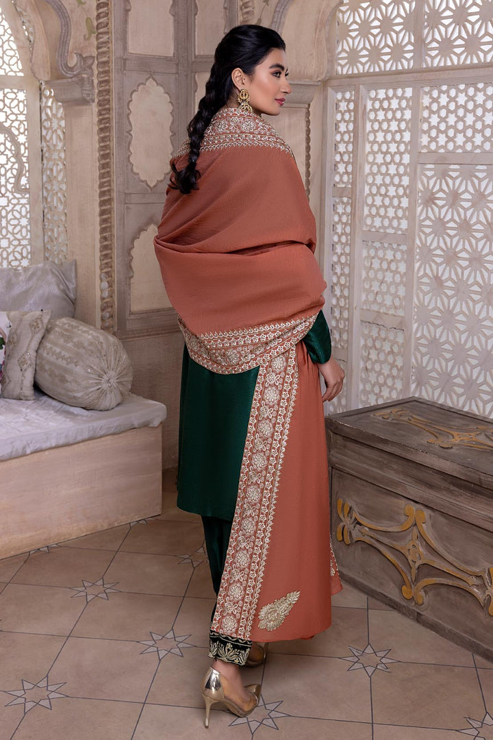 Look spectacularly graceful and elegant in our emerald green ensemble featuring patched velvet on the neckline with intricate details of tilla and sequence work. The look is further enhanced with an embroidered paper cotton dupatta that is perfectly modern yet a traditional look for the festive season.