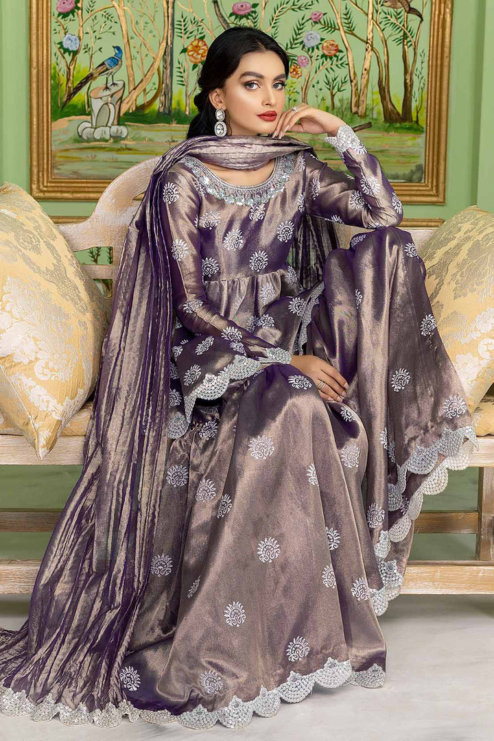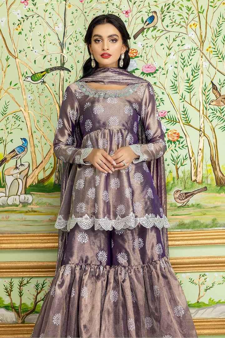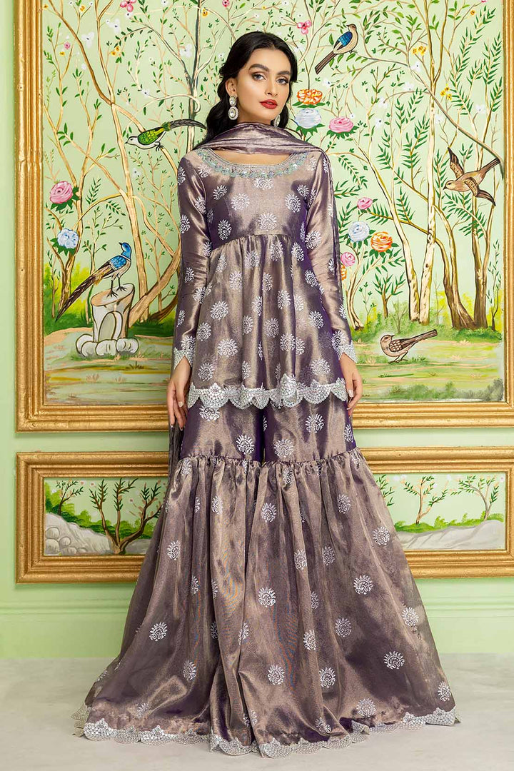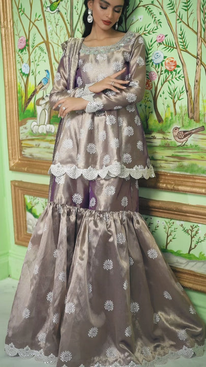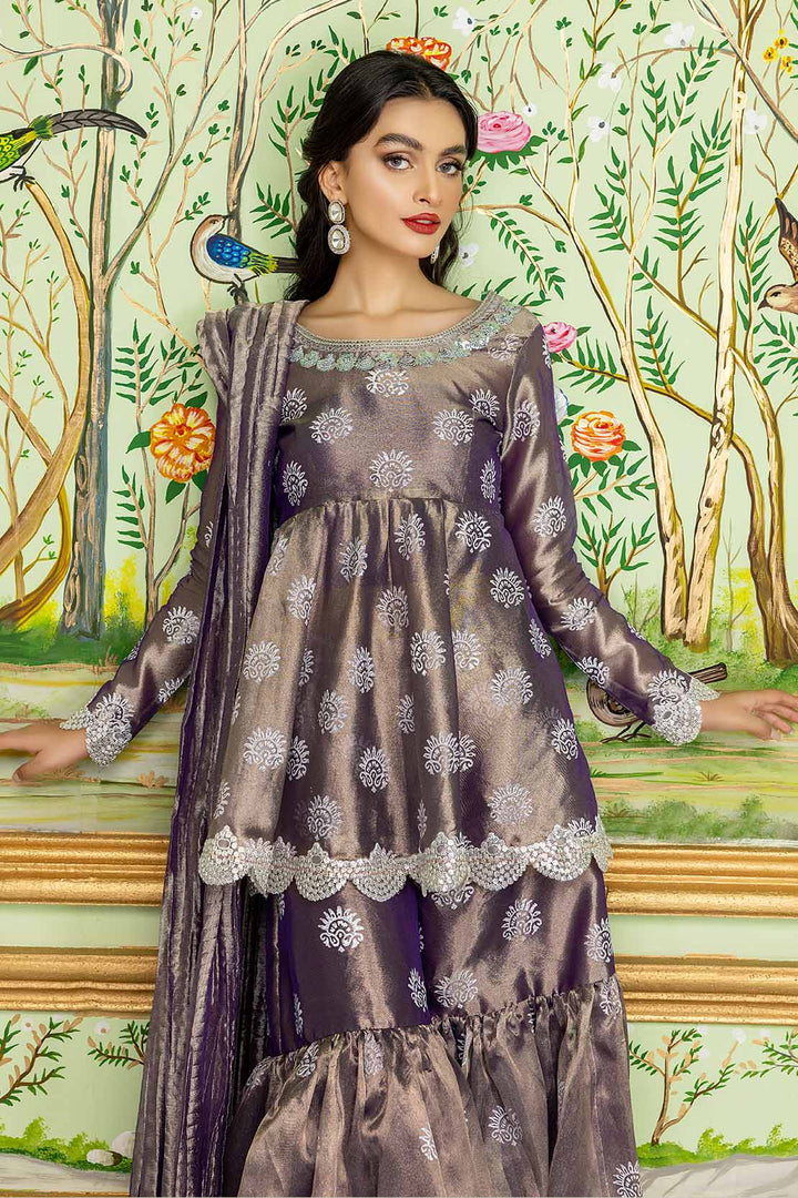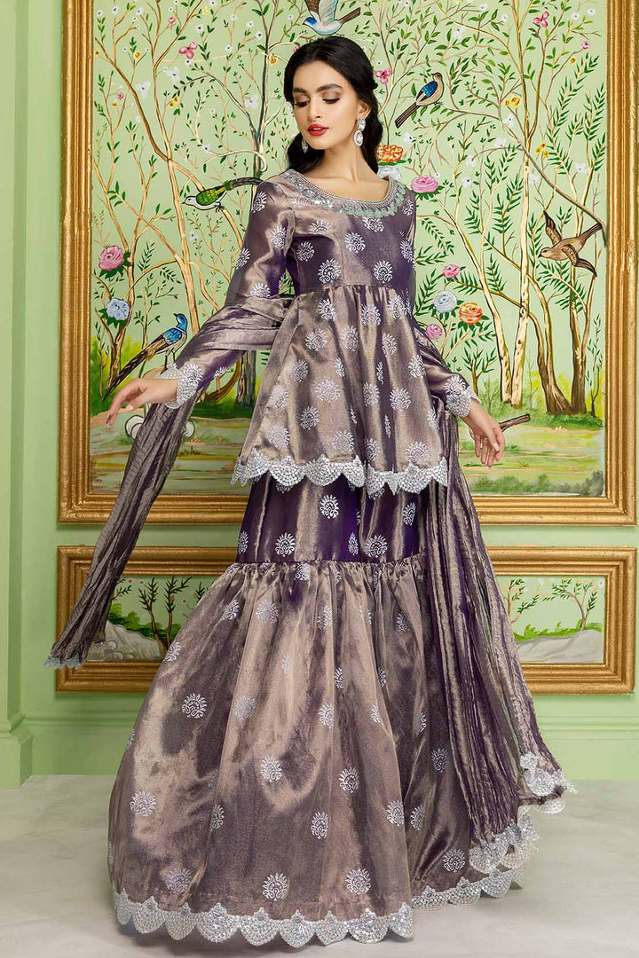 Royal tonal tissue having blue voilet base weaved with gold and silver threads is adorned with block printed motifs for shirt and pants. Further adorned with heavy sequence neckline and borders for hem. This look is completed with same tonal tissue dupatta. Perfect for any festive look.