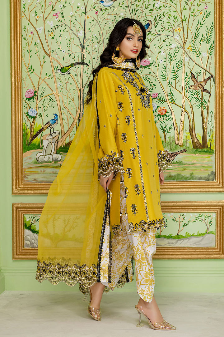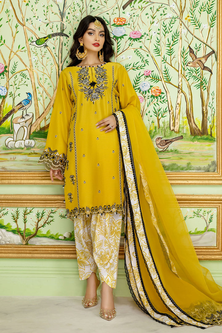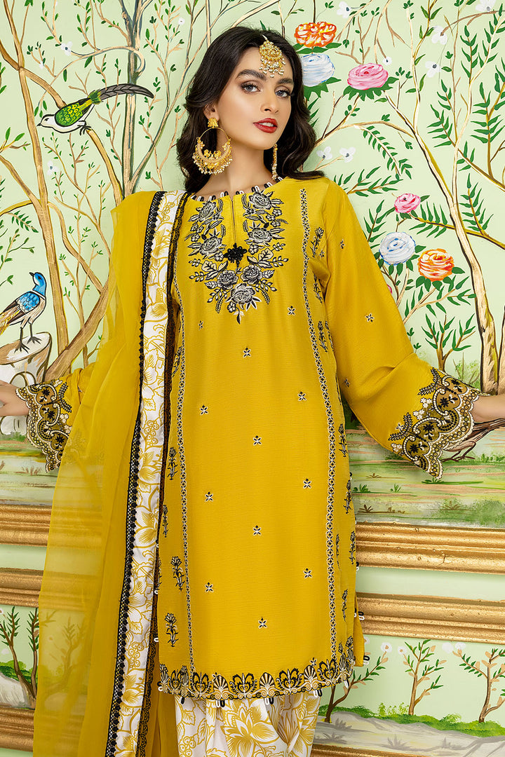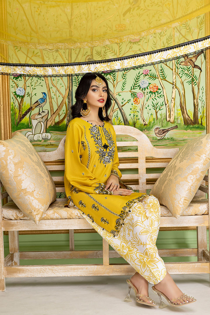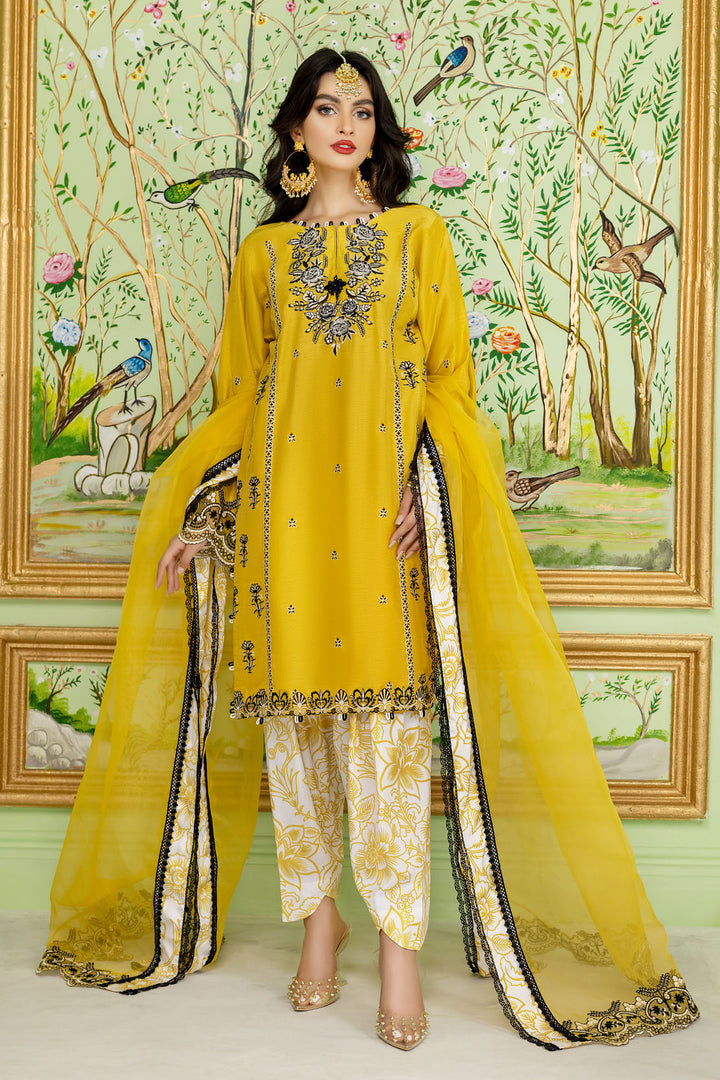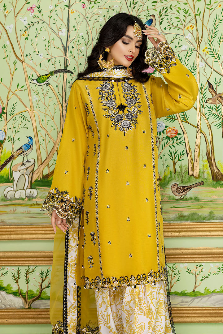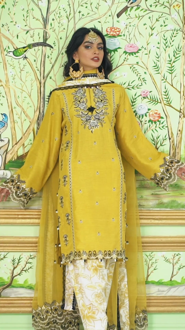 An understated and elegant kurta features delicate black and white kashmiri embroidery on a vibrant mustard gold base. Adorned with digitally printed bold floral grip pants along with solid organza dupatta with refined border details. this classic piece will never go out of style.