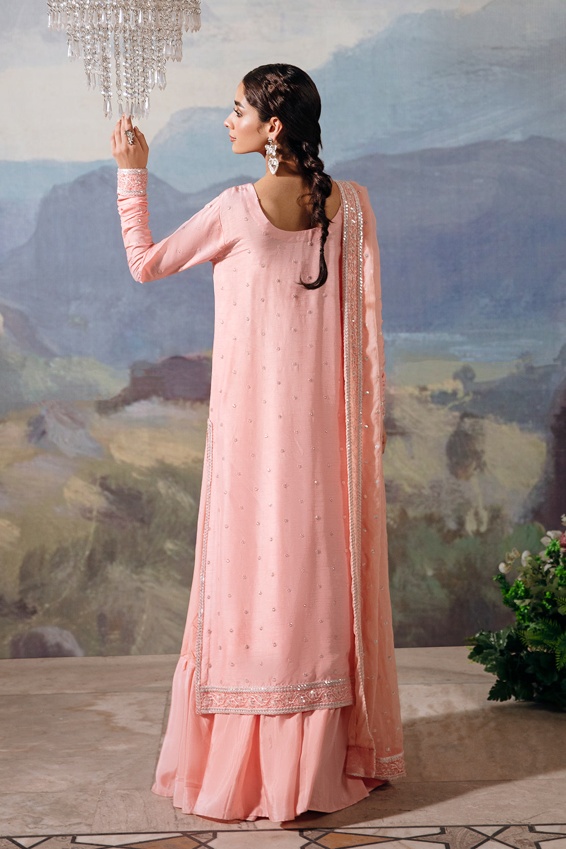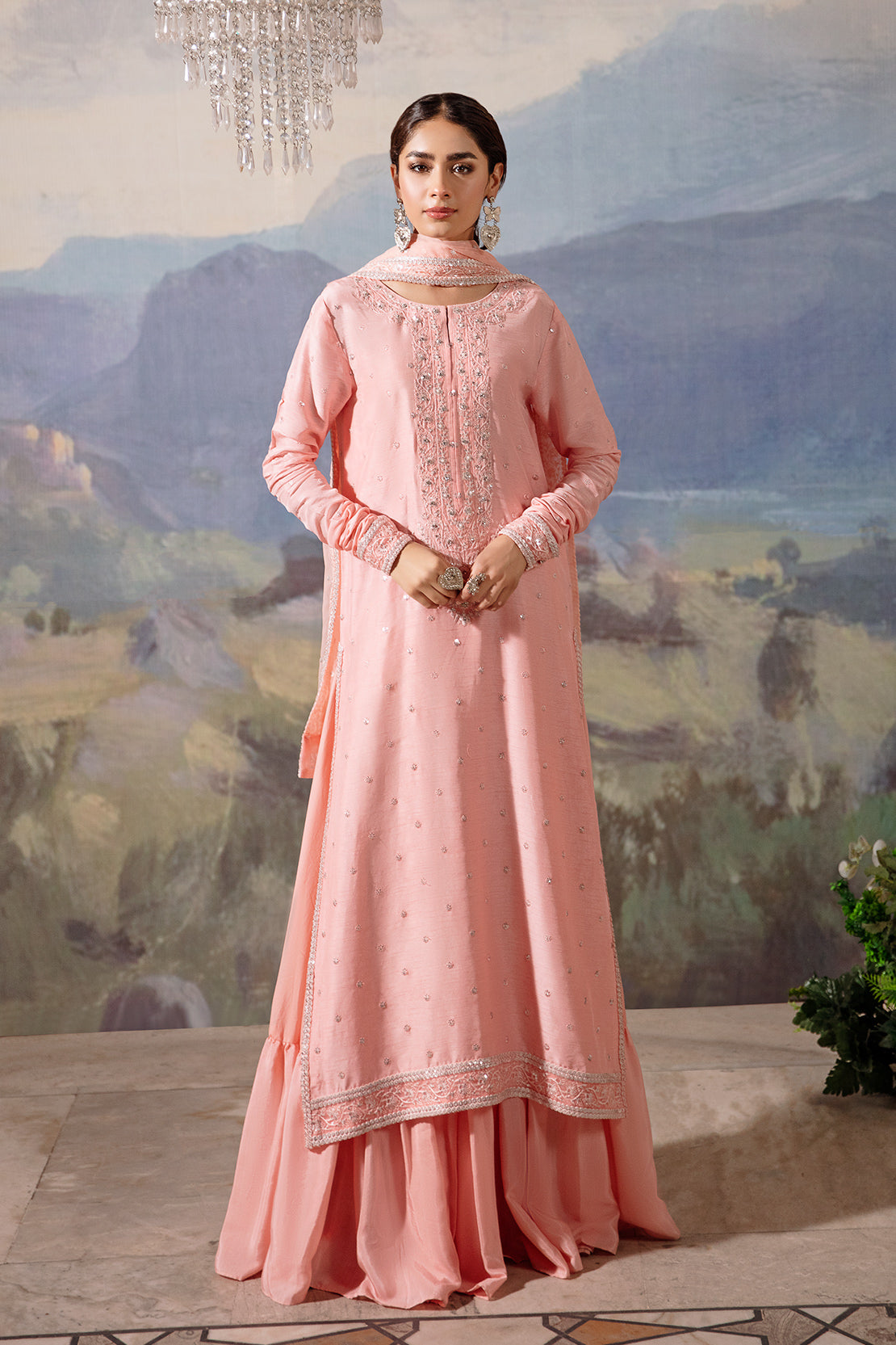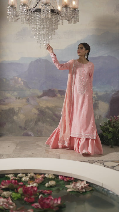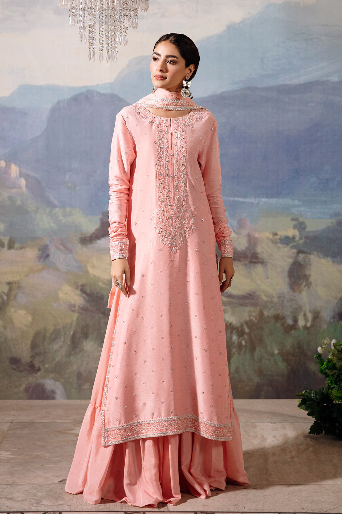 An elegant peachy pink raw silk shirt with that comes intricately and heavily embroidered with sequence and hand embellishment on shirt along with neckline sleeves and borders. It is paired with a khadi lawn lehnga. The look is completed with an embroidered and hand embellishment chiffon dupatta.