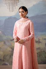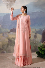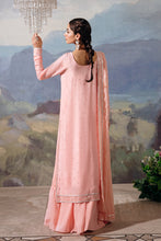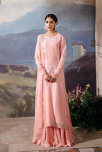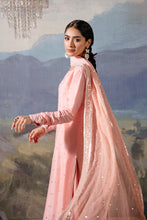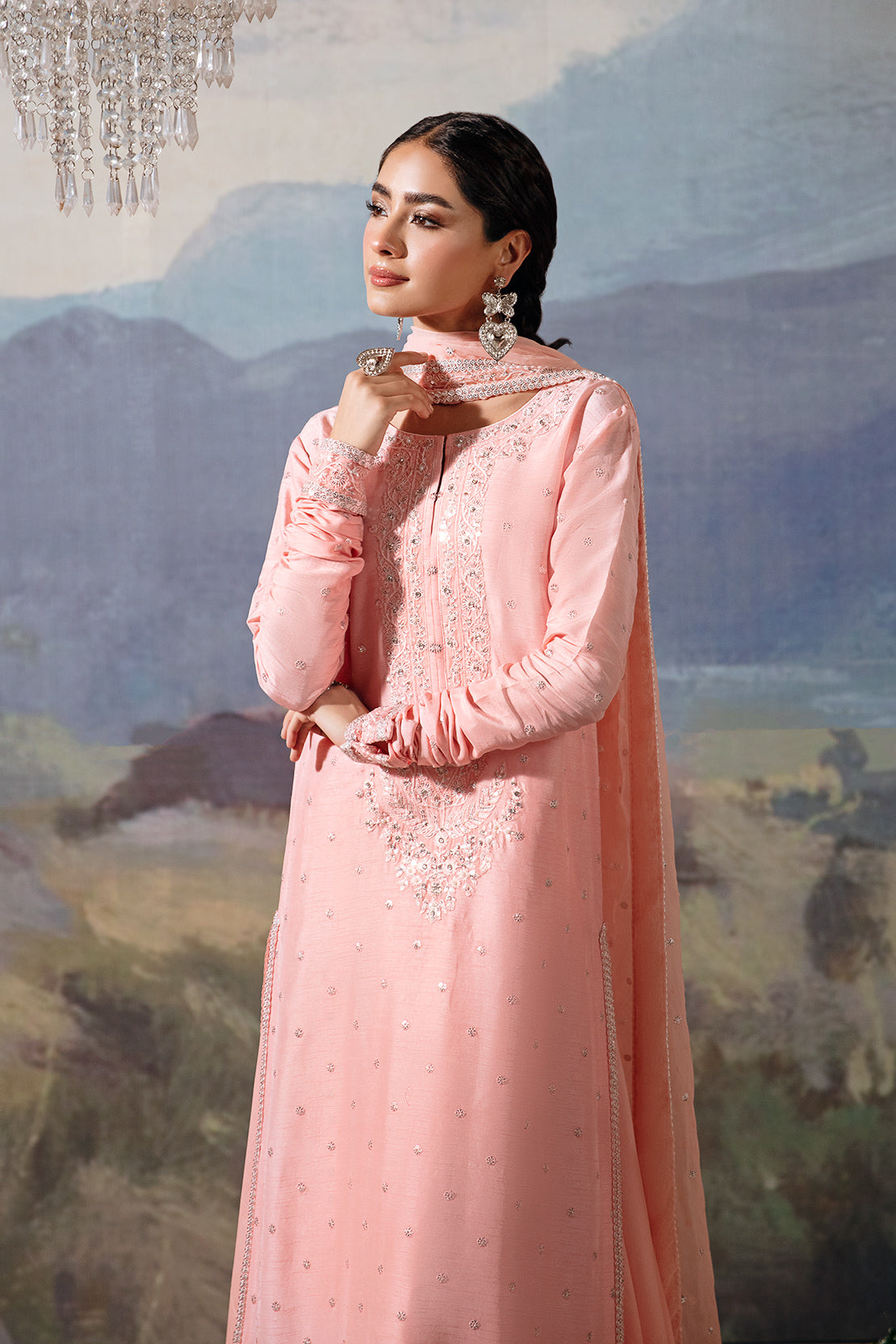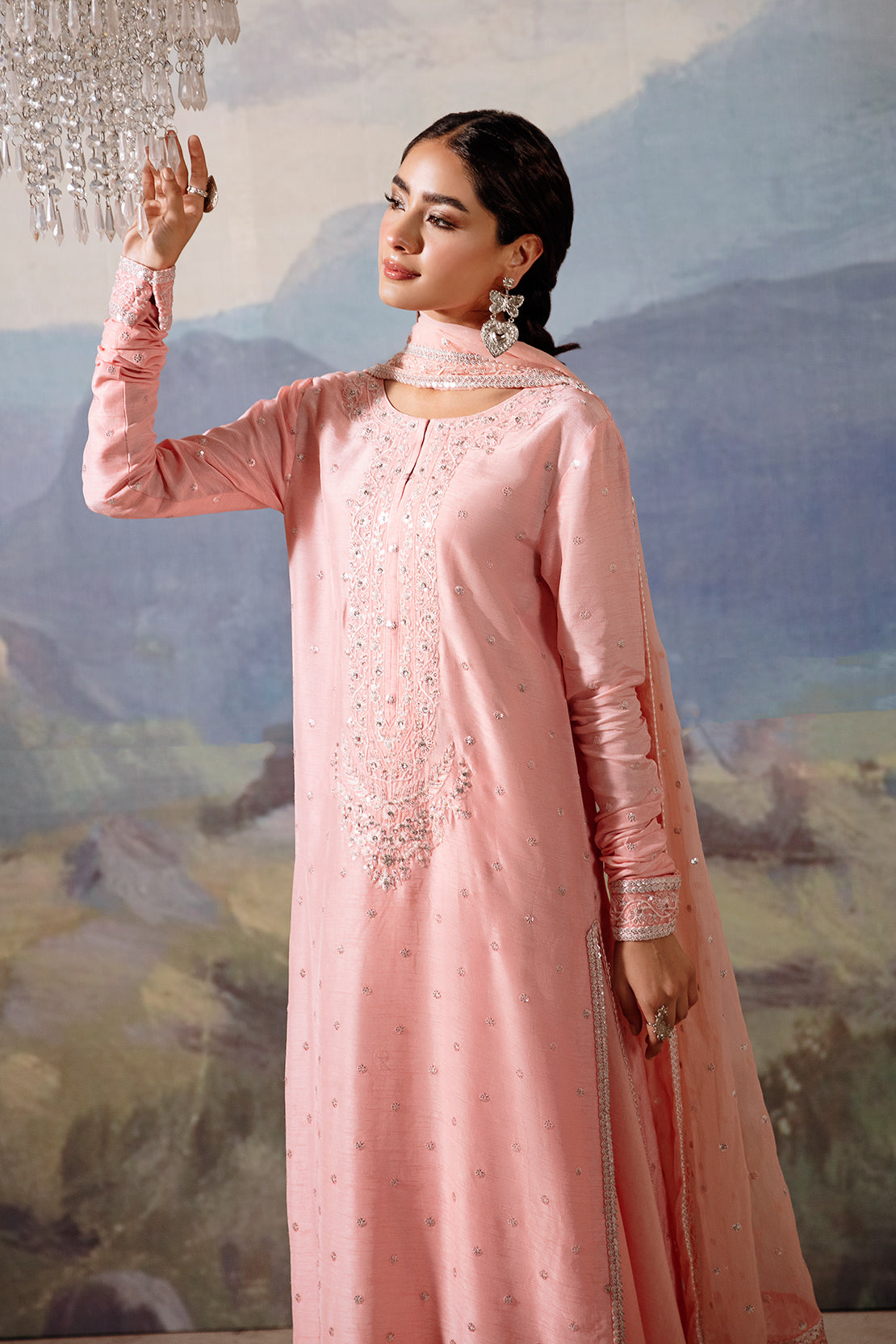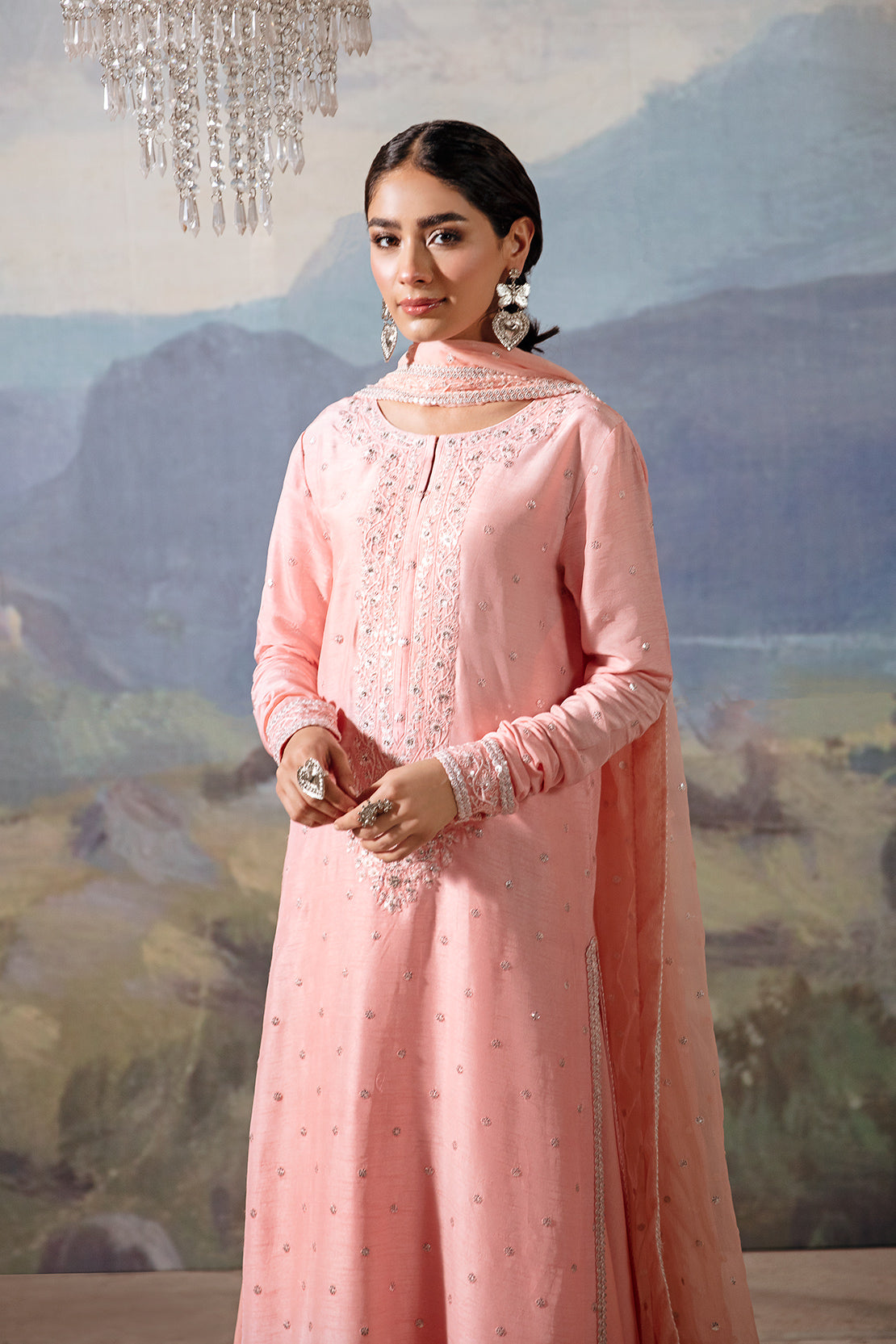 An elegant peachy pink raw silk shirt with that comes intricately and heavily embroidered with sequence and hand embellishment on shirt along with neckline sleeves and borders. It is paired with a khadi lawn lehnga. The look is completed with an embroidered and hand embellishment chiffon dupatta.