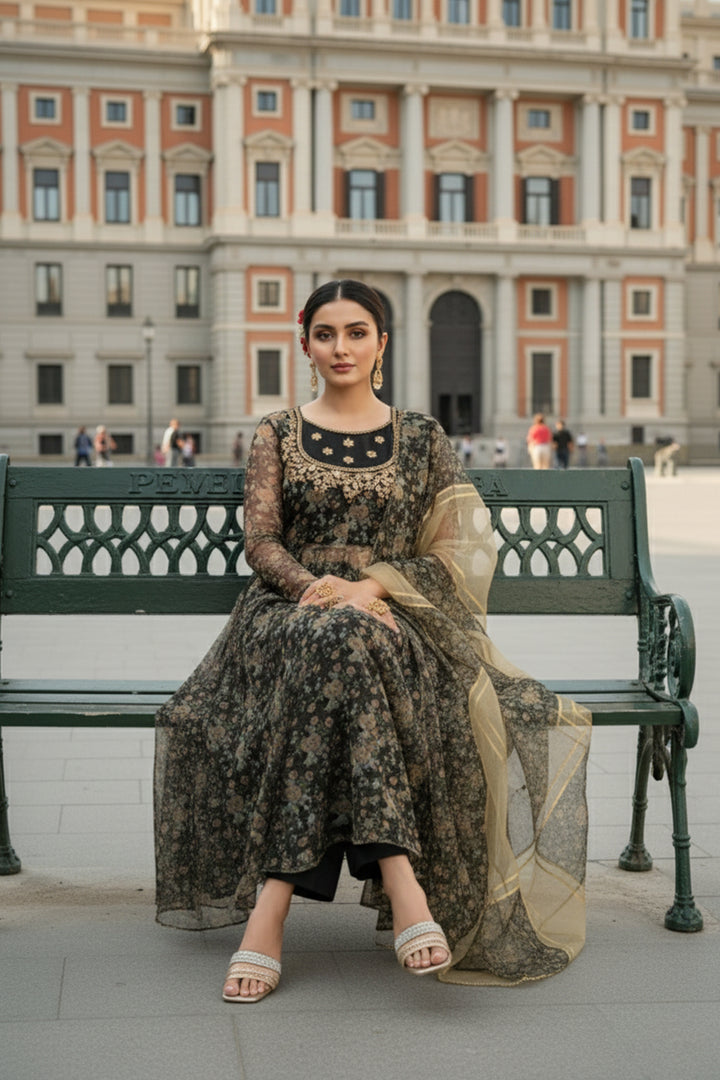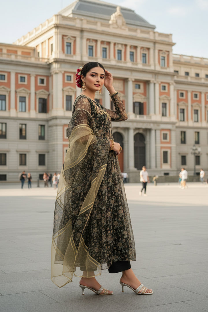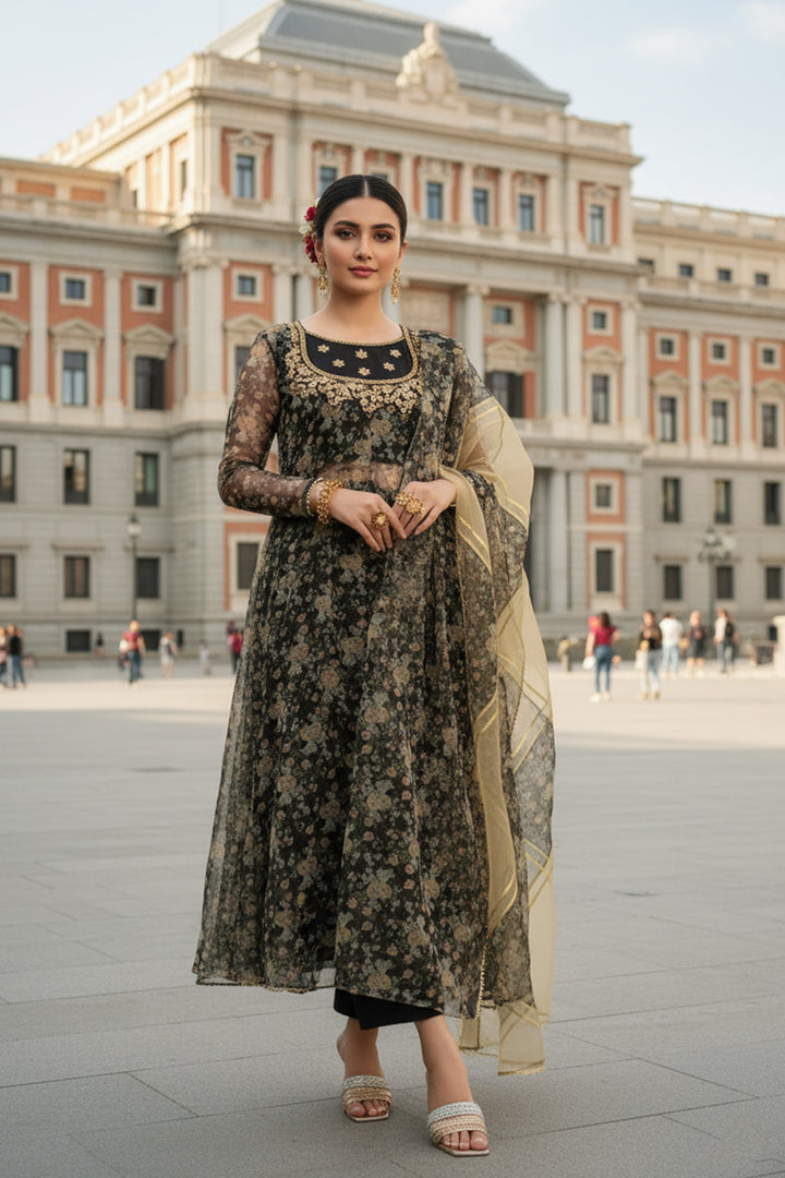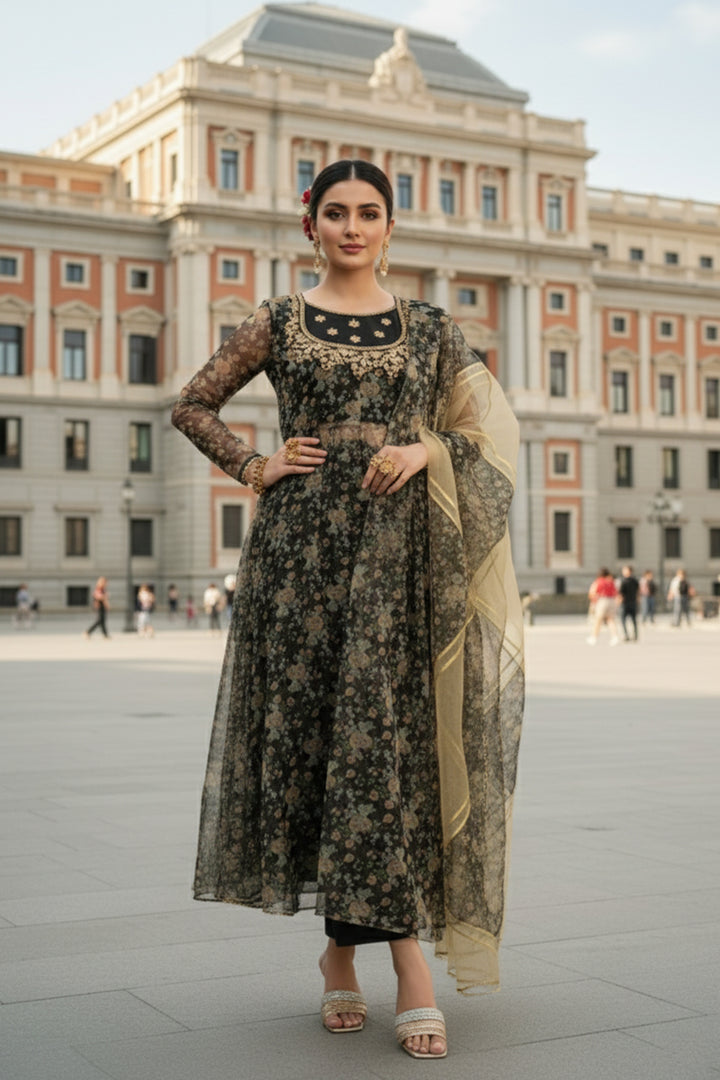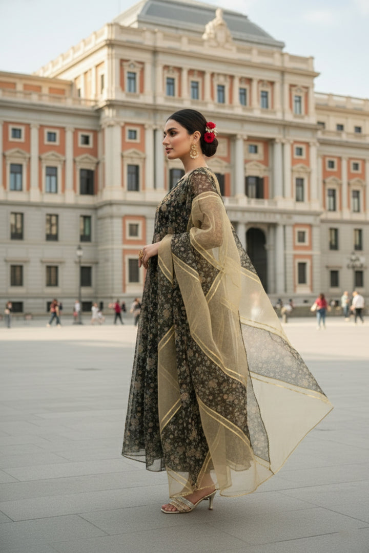 A fresh look for festivity in summer, bringing a contemporary update to your wardrobe with this subtle floral digitally printed shirt with stitched drapped dupatta. A unique silhouette uplifted with hand embellishment with tilla and zardozi work on neckline finished with solid organza along with gotta details on shirt and pallu. This ensemble comes with an inner along with black raw silk pants.