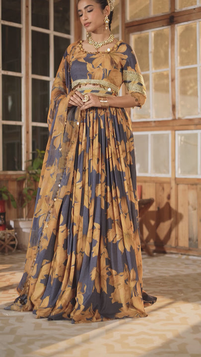 This stunning grip-printed lehenga choli in deep grey, adorned with warm brick-hued autumn florals, exudes elegance and charm. The choli features intricate tilla, resham, and sequin embroidery, while the pleated lehenga is cinched with a heavily embroidered belt for a flattering silhouette. A matching chiffon dupatta with an embroidered pallu adds a touch of luxury. A perfect fusion of tradition and modernity, this ensemble is ideal for Eid celebrations and festive occasions.