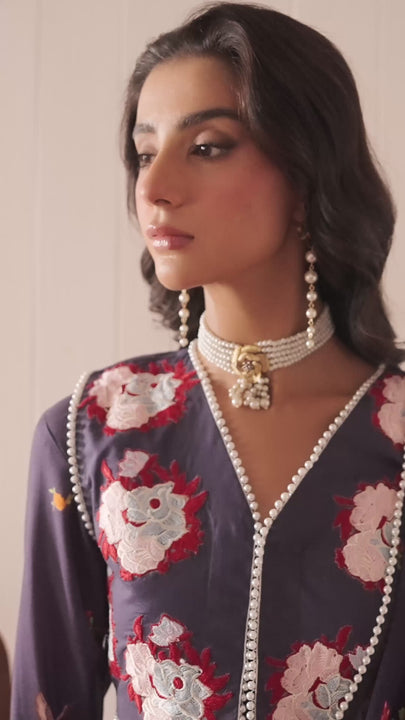 Our classic flared printed ensemble that blends playful elegance with traditional charm. The midnight blue lawn base features flowing, vibrant print with flora’s, butterflies that add movement and flair, while the look is elevated by an intricately embroidered jacket with floral bunches. The jackets detailed craftsmanship contrasts beautifully with the sleek silhouette underneath, creating a balanced, statement-worthy outfit. Completing the look in a flowy chiffon draped stitched dupatta, mirroring the same floral print, perfect for festive gatherings or daytime celebrations.