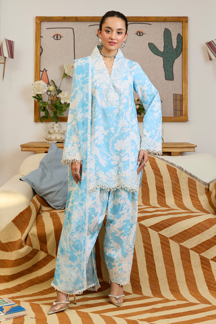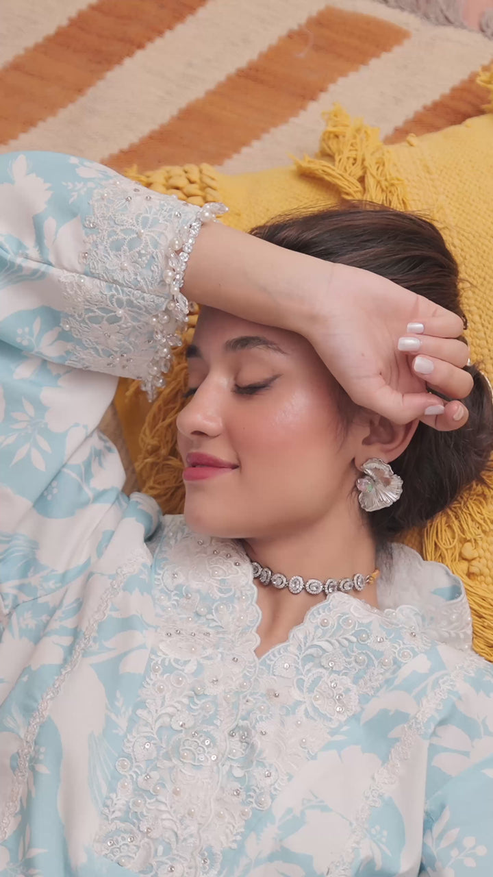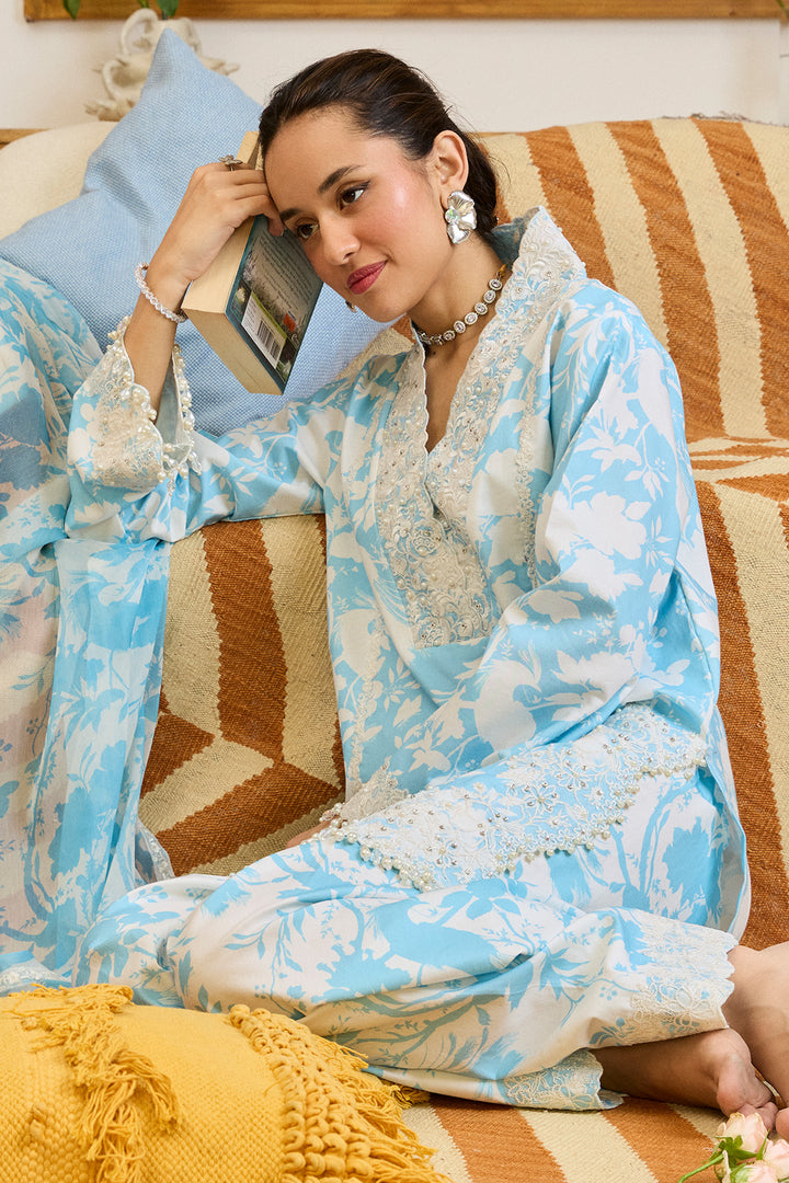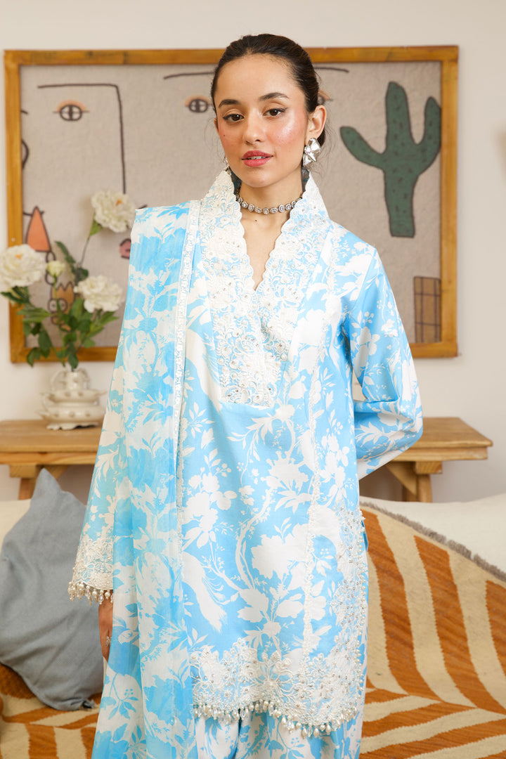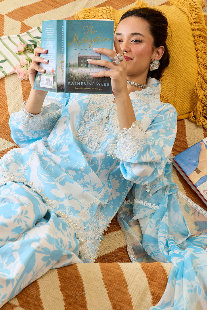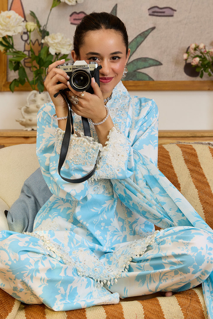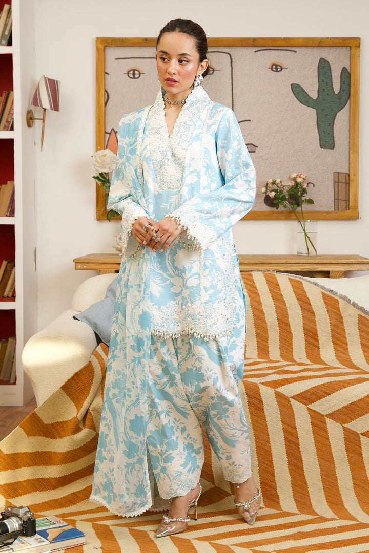 A rhyme to artistic symmetry, this ensemble features a stunning toile-inspired print with a creative twist, a positive-negative interplay that brings visual balance. The shirt, set on a soft light blue base, carries the positive print with embroideries on the panel , while the shalwar echoes the same imagery in reverse on a crisp white canvas. The outfit is elevated with beautifully embroidered and hand embellished detailing on the neckline, hem, and sleeves using pearls and crystals. Paired with a matching digitally printed chiffon dupatta. Perfect for any summer festivities.