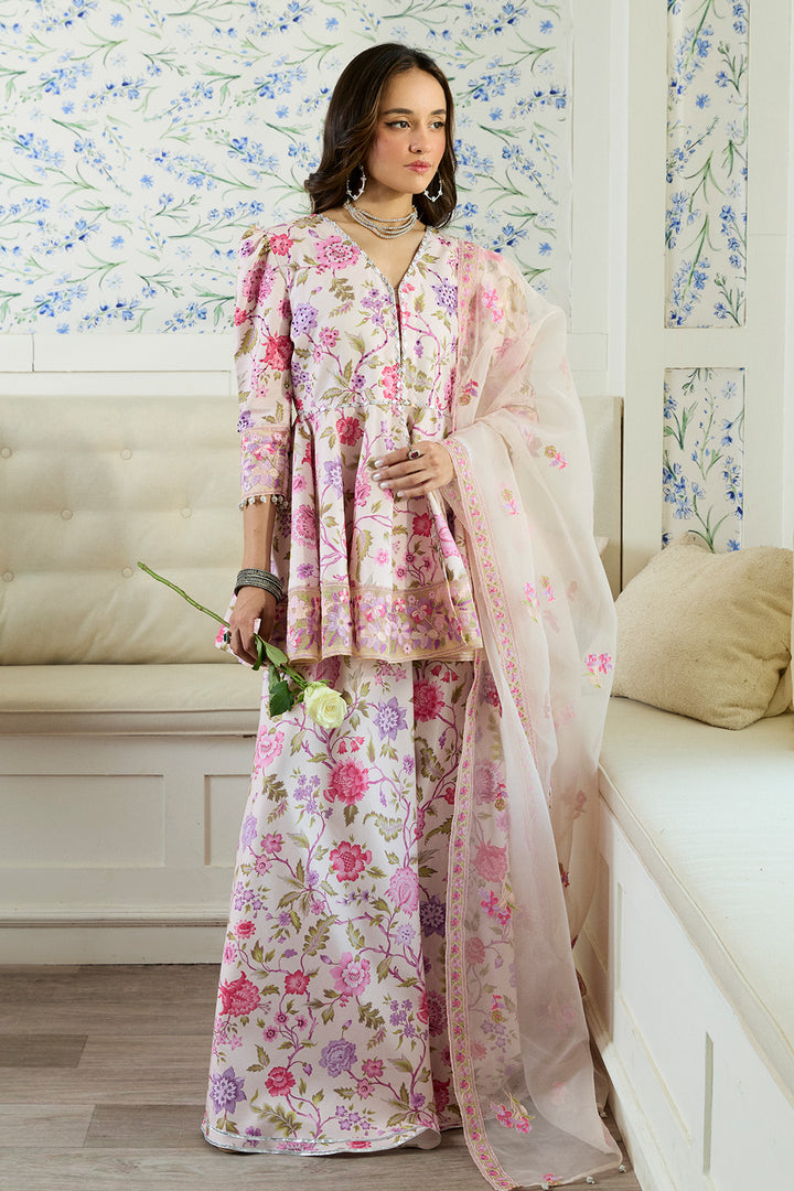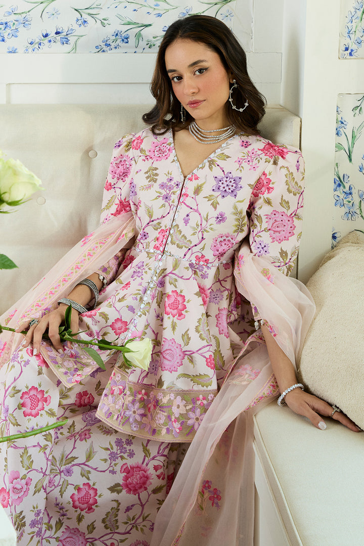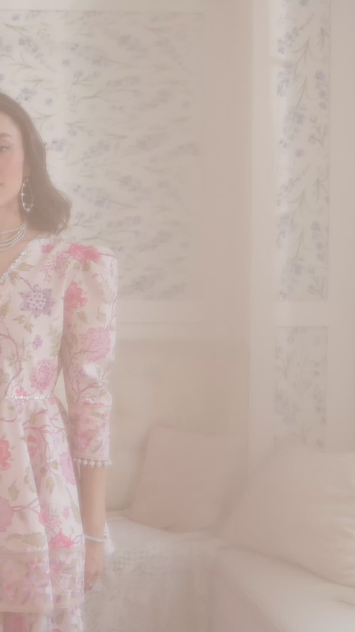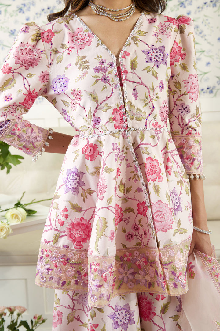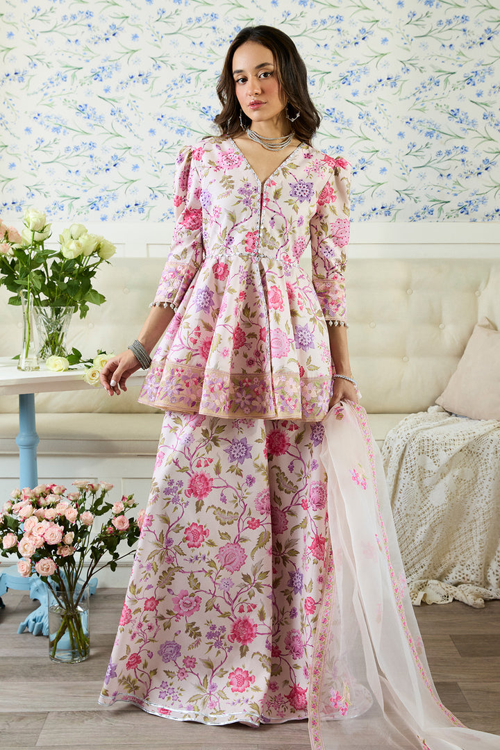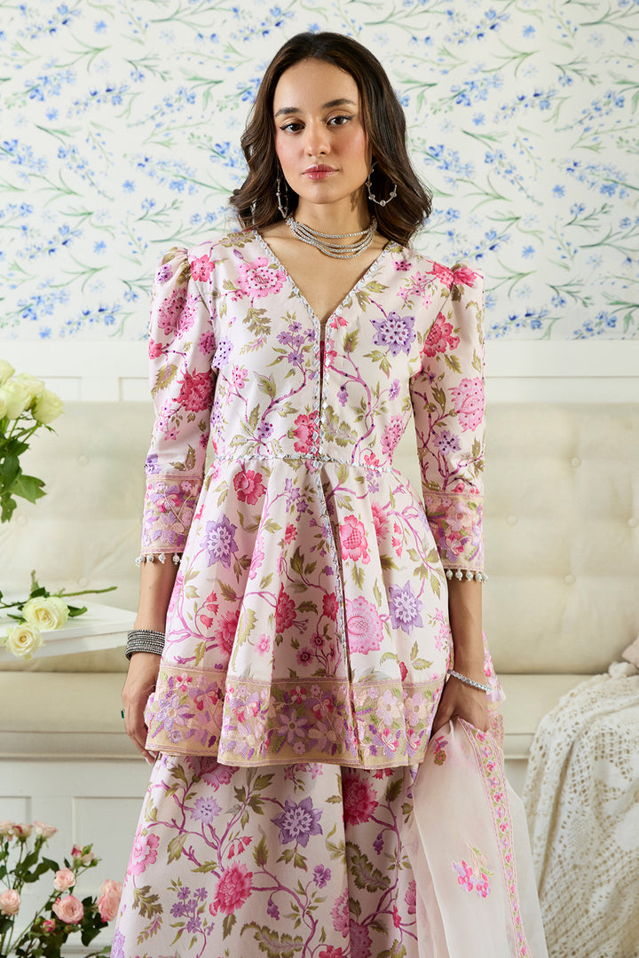 A celebration of color and craftsmanship, this signature peach-based peplum and sharara set is a true showstopper. Drenched in a vibrant floral print with pinks, peaches, lilacs, and soft purples, intertwined with green leaves and stems. The peplum features a beautifully flared silhouette with poofy sleeves, creating an effortlessly dramatic shape. The bodice is richly embellished with gota and colorful stone work, adding texture and sparkle to the print. Detailed embroidery on the hemline adds the perfect finishing touch. The set comes with same printed sharara finished with gotta details. It is paired with beautifully embroidered organza dupata in the hues of print. Making it a perfect pick for eid celebrations.
