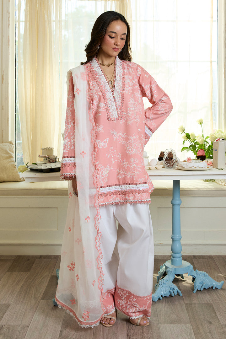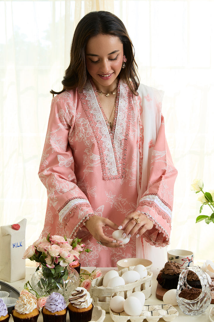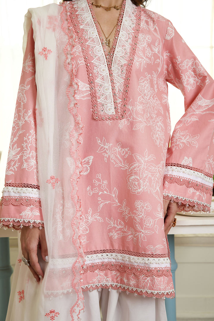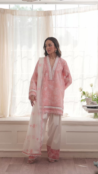 Inspired by timeless artistry, this peach-beige ensemble features an embossed chinoiserie-inspired print, adorned with delicate birds and hints of butterflies, evoking a serene garden scene. Accented with intricate lace detailing on the neckline, hemline, and sleeves, each element adds depth and softness to the design. Hand embellishments lend a subtle sparkle, enhancing the textured base with artisanal charm. Paired with a contrasting white shalwar finished with refined flock borders, and a beautifully embroidered chiffon dupatta on a pearl white base, this ensemble is a poetic blend of tradition and modern sophistication.