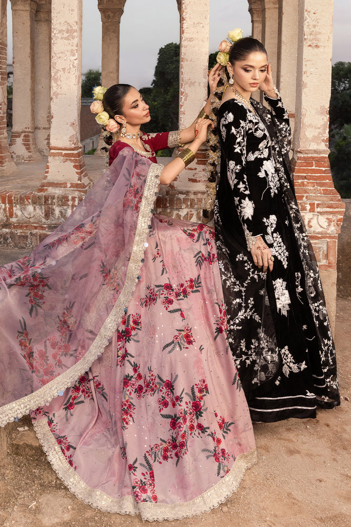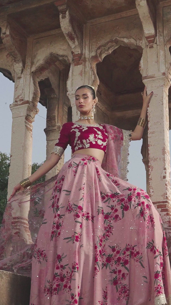 Timeless yet contemporary. The choli of our signature lehnga set from ‘Wedding Festive” in deep maroon raw silk is intricately embroidered with tilla and threadwork along with embellishments of sequins, exuding timeless elegance. It is paired with a flared dusty pink organza lehenga, adorned with delicate digital floral prints. Complemented by a matching organza dupatta featuring printed florals and embroidered borders. Further the outfit is enhanced with coin sequins on dupatta.