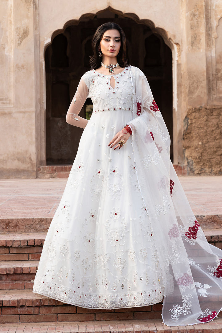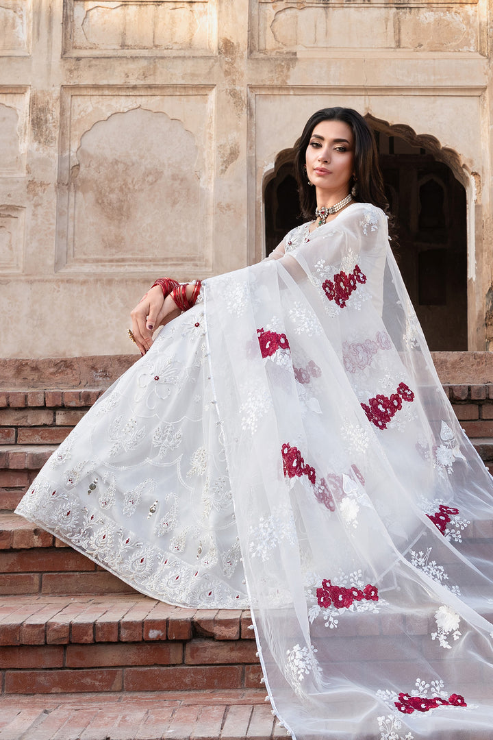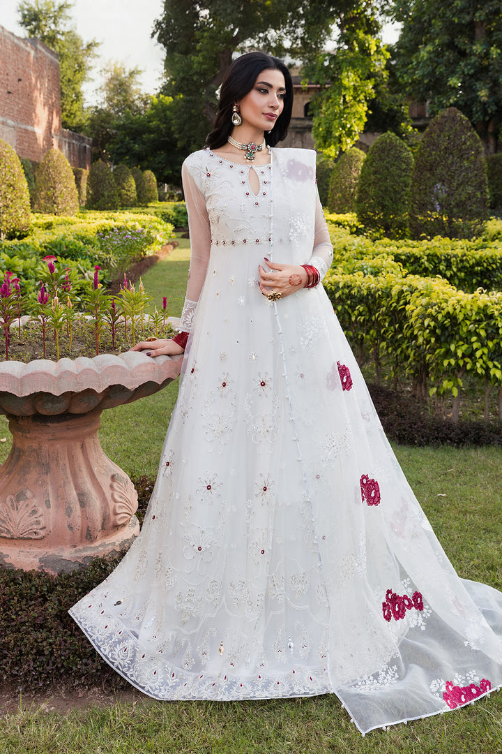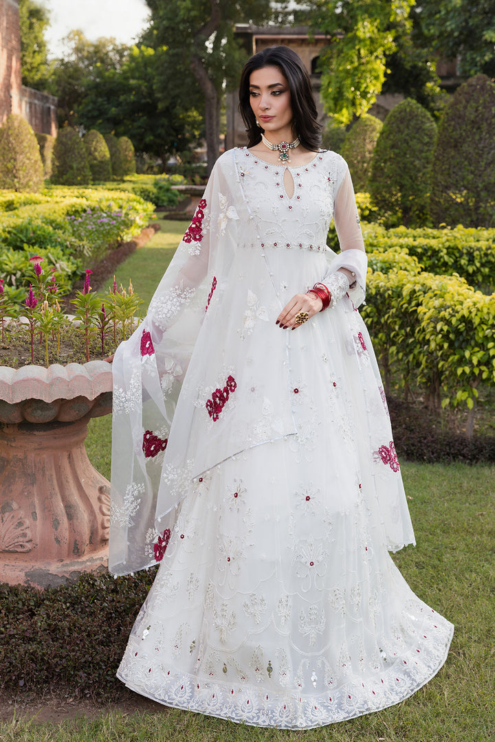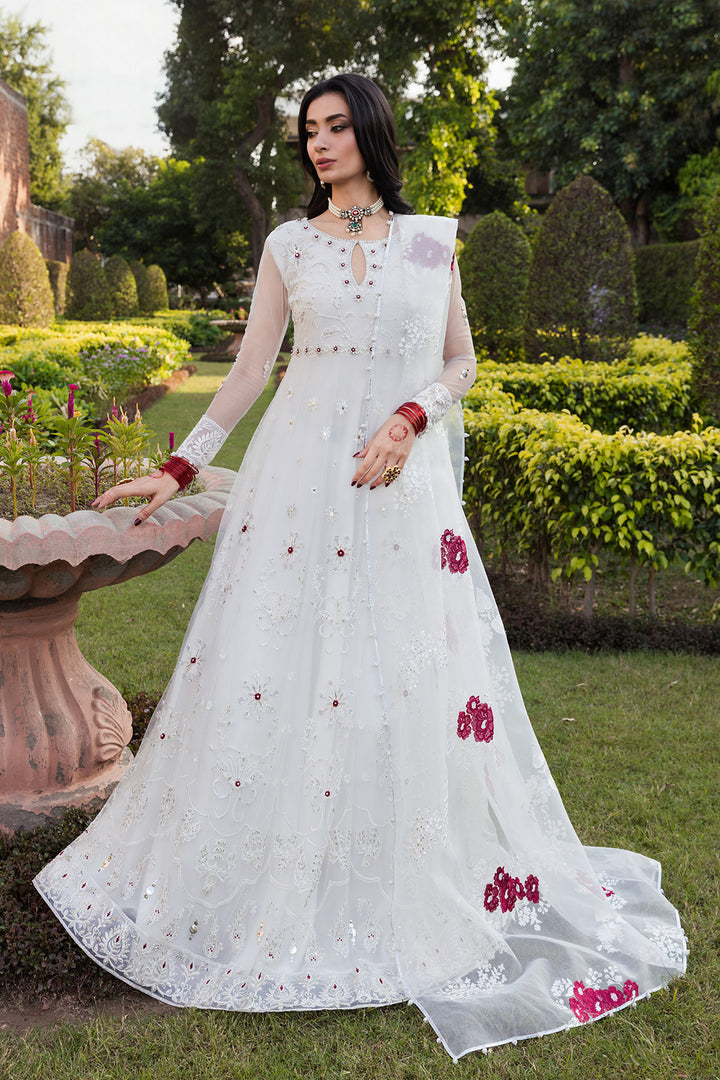 This elegant ensemble features a timeless white Anarkali-style dress crafted on a delicate net base, adorned with intricate embroidery and hand embellishments. Fine threadwork is beautifully complemented by the shimmer of hand-applied crystals, pearls, and mukesh, while rich maroon thread knots add depth and contrast. The keyhole neckline and sheer sleeves enhance its feminine appeal bringing a touch of luxury. Paired with an embroidered organza dupatta showcasing floral bunches in resham and tilla, the flowy silhouette creates a regal and graceful look—ideal for festive or formal occasions, radiating sophistication with subtle charm.