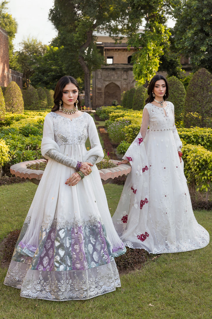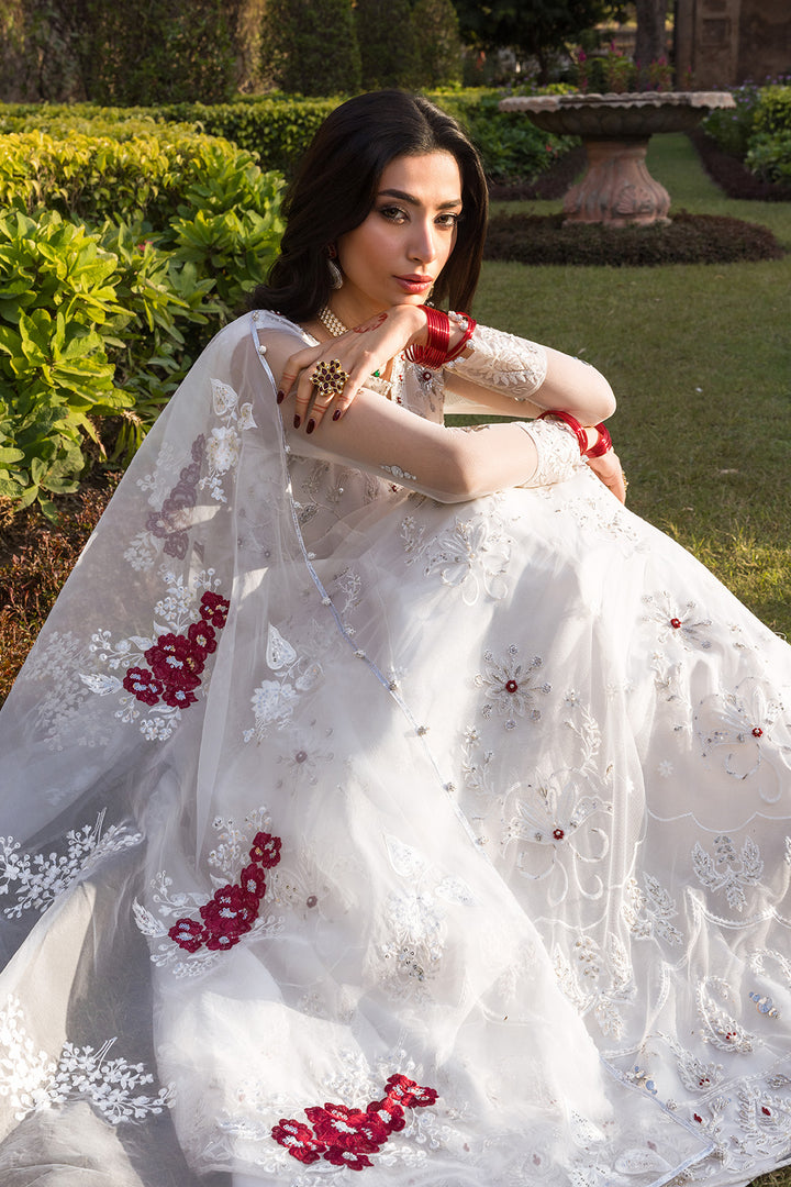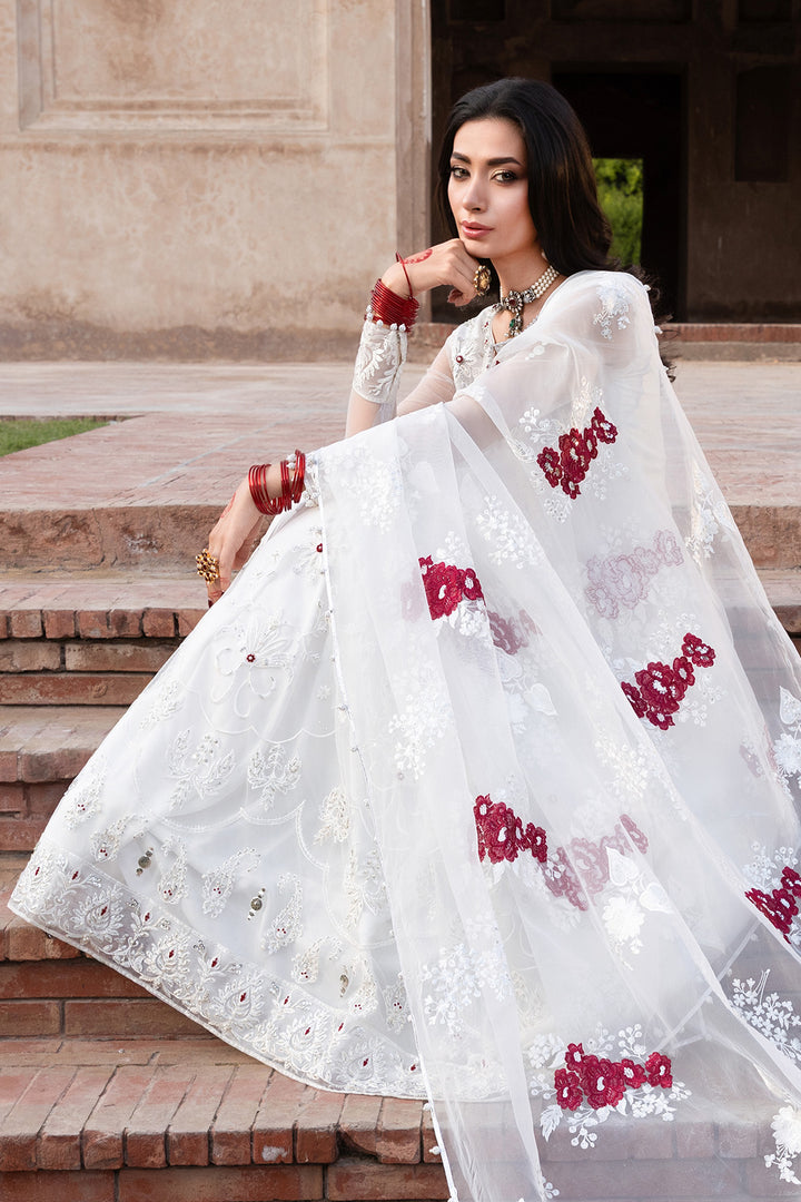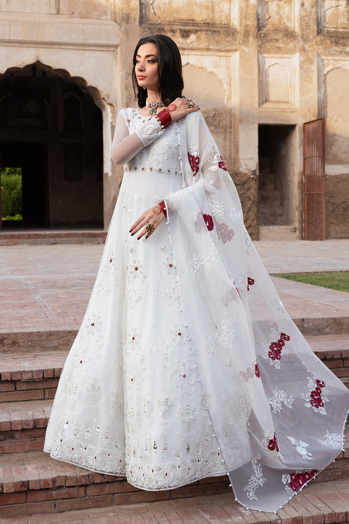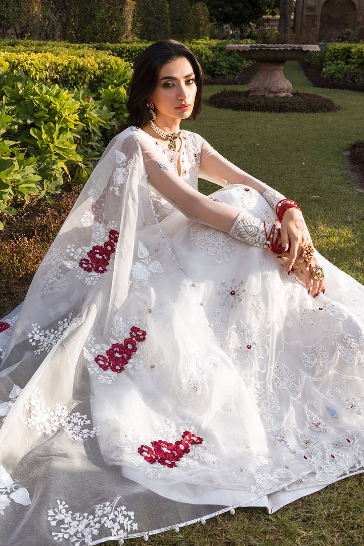 This elegant ensemble features a timeless white Anarkali-style dress crafted on a delicate net base, adorned with intricate embroidery and hand embellishments. Fine threadwork is beautifully complemented by the shimmer of hand-applied crystals, pearls, and mukesh, while rich maroon thread knots add depth and contrast. The keyhole neckline and sheer sleeves enhance its feminine appeal bringing a touch of luxury. Paired with an embroidered organza dupatta showcasing floral bunches in resham and tilla, the flowy silhouette creates a regal and graceful look—ideal for festive or formal occasions, radiating sophistication with subtle charm.