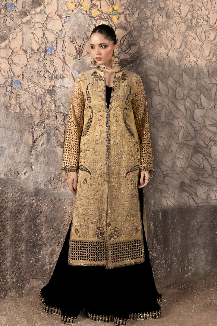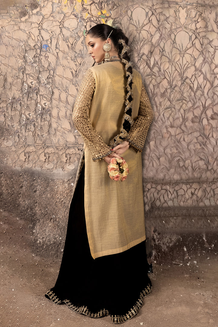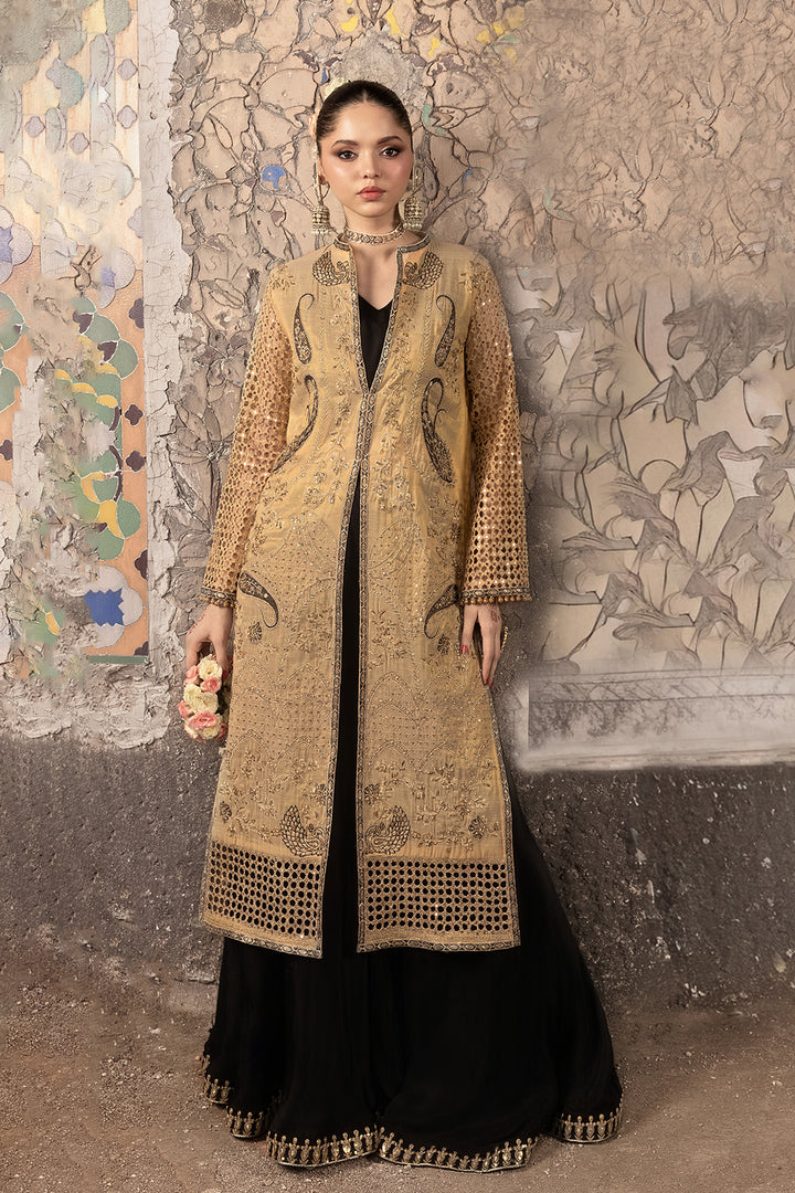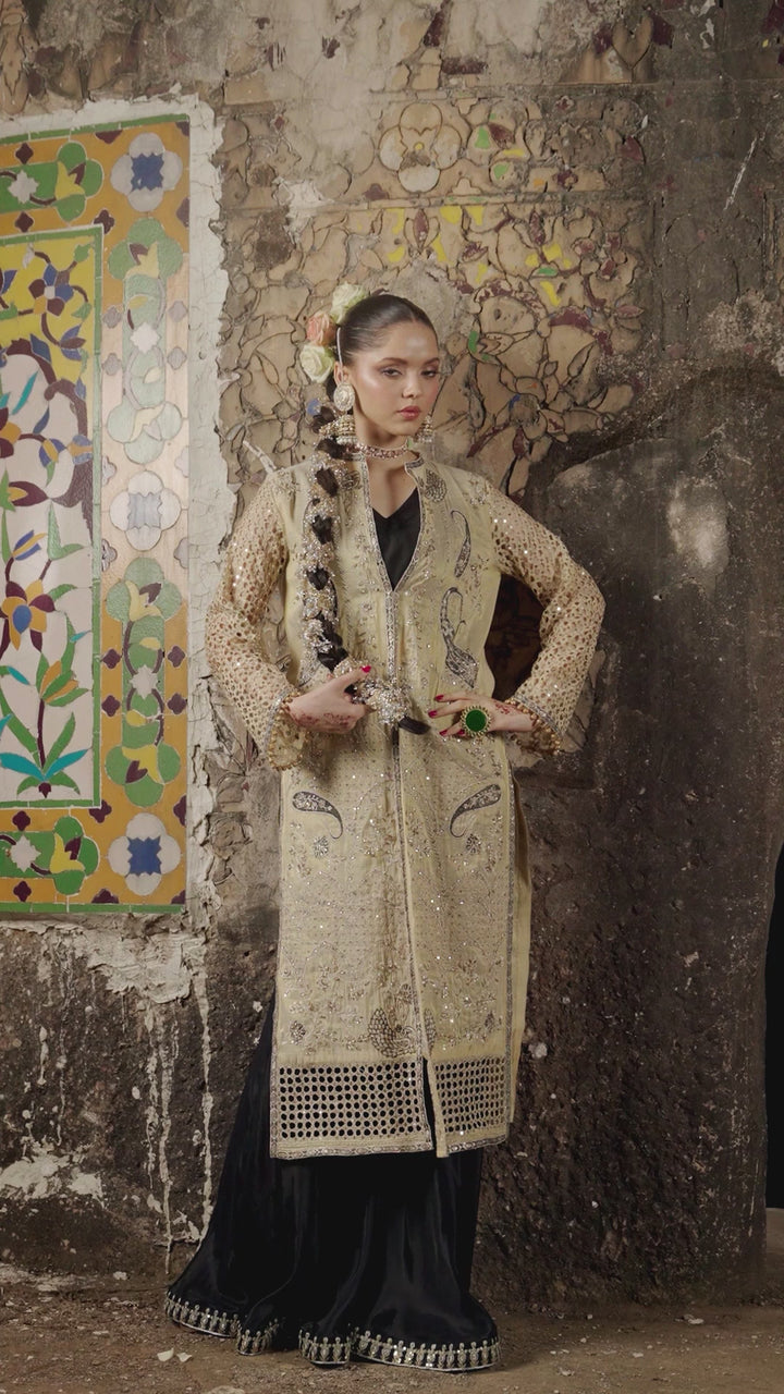 This outfit features a regal long zari jacket-style ensemble that beautifully blends traditional craftsmanship with modern elegance. The jacket is richly detailed with intricate embroidery of rehsam, tilla creating a luxurious, textured look. The embellishments include zardozi, sequins, and beadwork, meticulously arranged in ornate motifs and cut work along the front, sleeves, and hemline. The structured cutline enhances its royal silhouette, while the black rawsilk under layer of camisole and sharara pants provides a striking contrast, highlighting the opulence of the gold-toned jacket