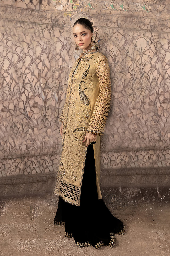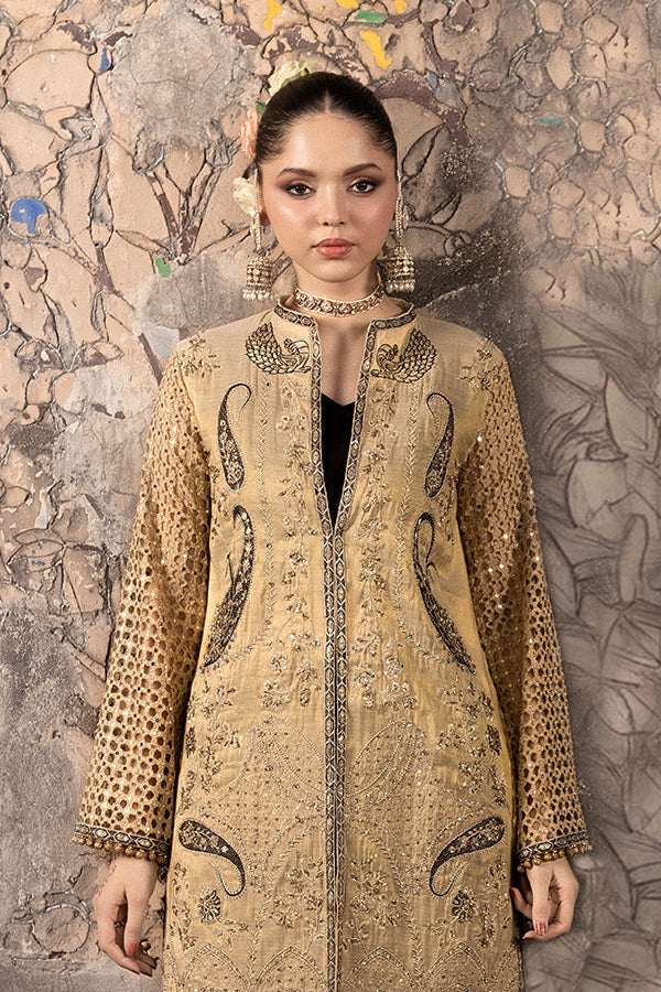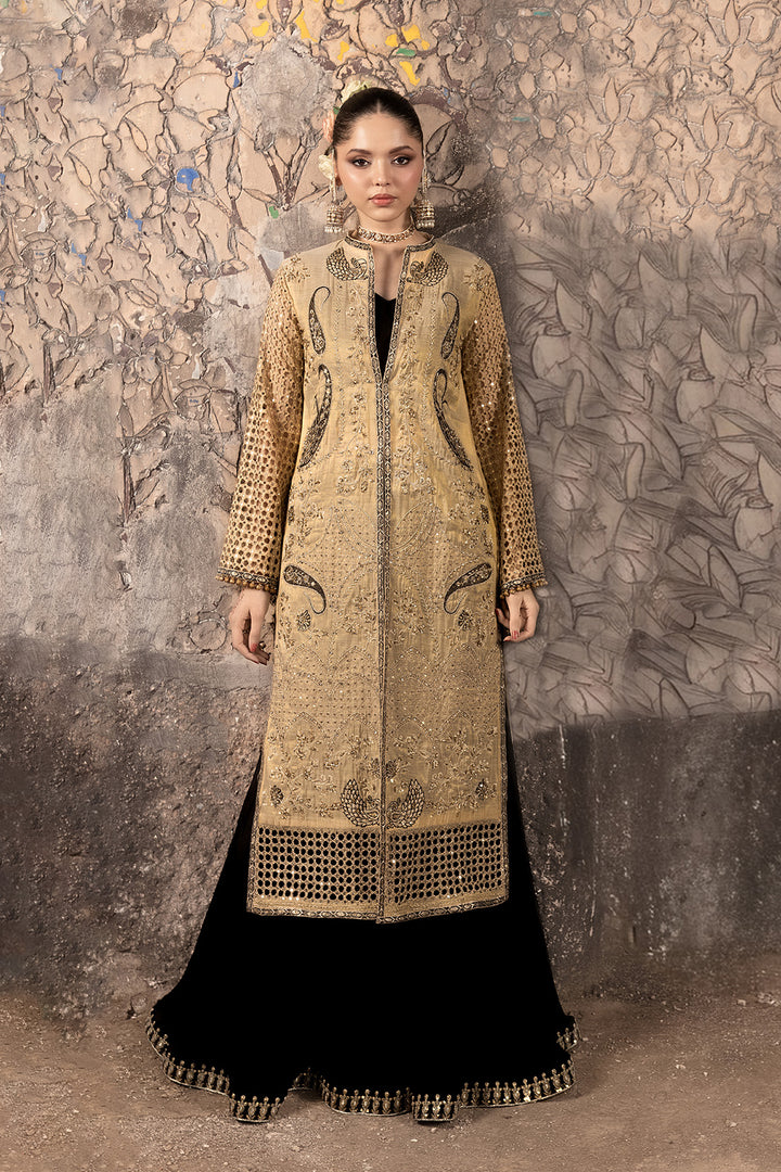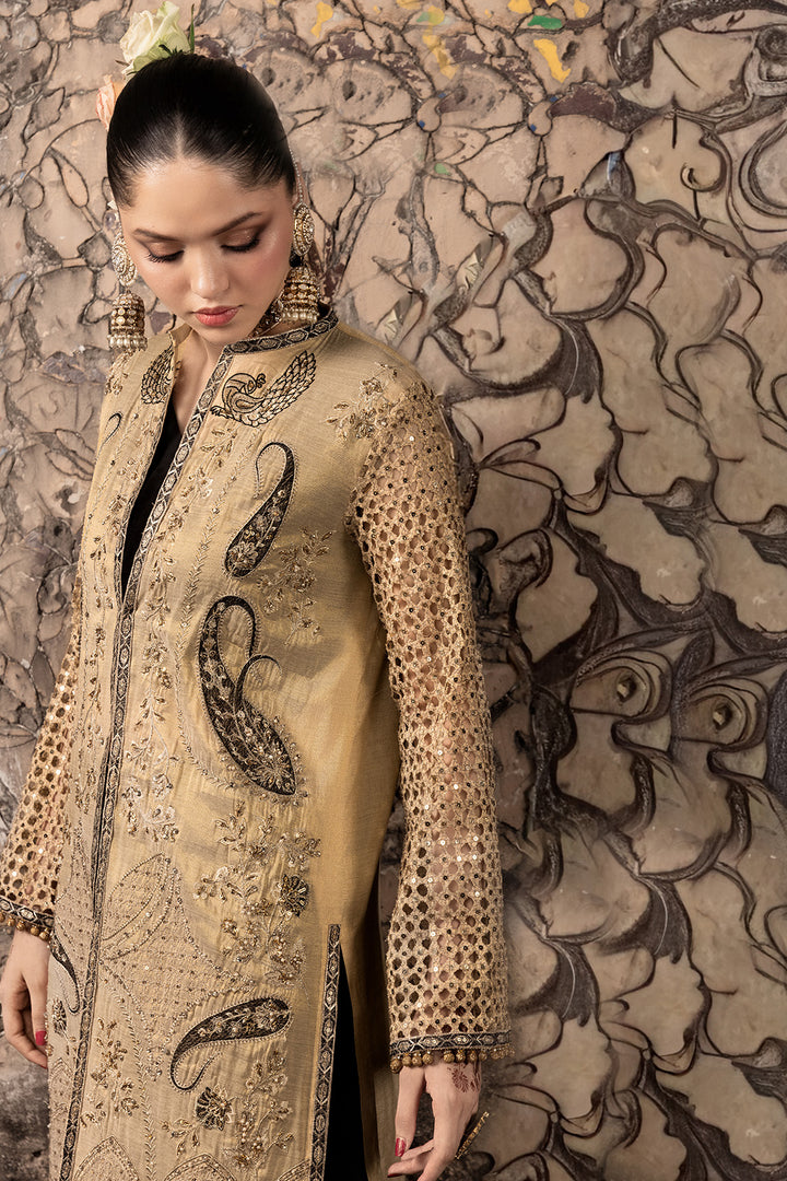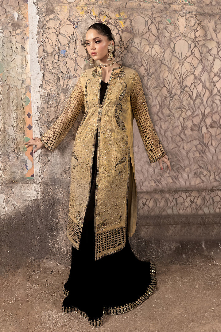 This outfit features a regal long zari jacket-style ensemble that beautifully blends traditional craftsmanship with modern elegance. The jacket is richly detailed with intricate embroidery of rehsam, tilla creating a luxurious, textured look. The embellishments include zardozi, sequins, and beadwork, meticulously arranged in ornate motifs and cut work along the front, sleeves, and hemline. The structured cutline enhances its royal silhouette, while the black rawsilk under layer of camisole and sharara pants provides a striking contrast, highlighting the opulence of the gold-toned jacket
