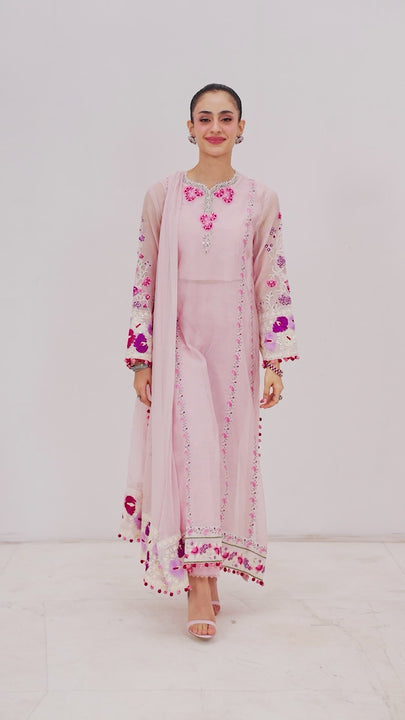 A classic rose pink ensemble crafted from a lightweight khaadi net fabric that drapes effortlessly. The outfit features striking floral embroidery in pinks, purple, and soft green threads, accentuating the neckline, sleeves, panels and hem. Neckline and sleeves are uplifted with hand embellishments of tonal crystals. Silhouette is finished with matching chiffon dupata with embroidered boarders. Creating a look that is both modern and timeless.