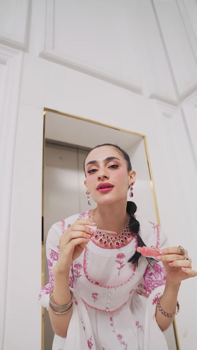 A graceful full-length Anarkali crafted in soft voile, adorned with delicate block print–inspired motifs that lend it a timeless, artisan charm. The flowing, paneled silhouette is enhanced with intricate floral embroidery and statement cutwork that create a striking fabric design. Delicately detailed borders and contrasting motifs add depth and visual interest. Borders on the hemline and sleeves adds depth and refined detail. Paired with a voile heavy embroidered dupatta finished with scalloped borders, the ensemble moves with effortless elegance. Rooted in traditional craftsmanship yet styled for modern wear, it captures a soft, festive allure—perfect for celebrating Eid with understated sophistication.