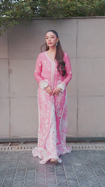 A long-length, front-open blush pink Angarkha meticulously crafted from premium khaadi silk. The shirt features extensive resham embroidery in a delicate white shade, showcasing a blend of floral vines patterns that create an intricate "Jal" effect across the entire silhouette. Designed with a sophisticated front-open style, it features a central slit bordered by dense, lace-like floral embroidery. The clean V-neckline allows the ornate craftsmanship to remain the focal point while elegantly elongating the frame. Full-length sleeves with dense cuff embroidery ensure the look remains modest. On the reverse, a decorative toile print serves as a stunning inner piece (lehnga choli) is crafted from soft lawn fabric. Perfect for festivities.
