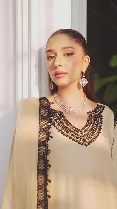 A mid length ensemble crafted from a gold-beige raw silk fabric elevated with striking black ari embroidery, featuring dramatic paisley and floral motifs that flow across the silhouette. The design is enriched with heavy embroidered borders along the hem, neckline, slits and sleeves, adding depth and elegance. The shirt is hand embellished with delicate black crystals. It is paired with a lightweight organza dupatta with embroidered borders that completes the look with a soft, graceful contrast.