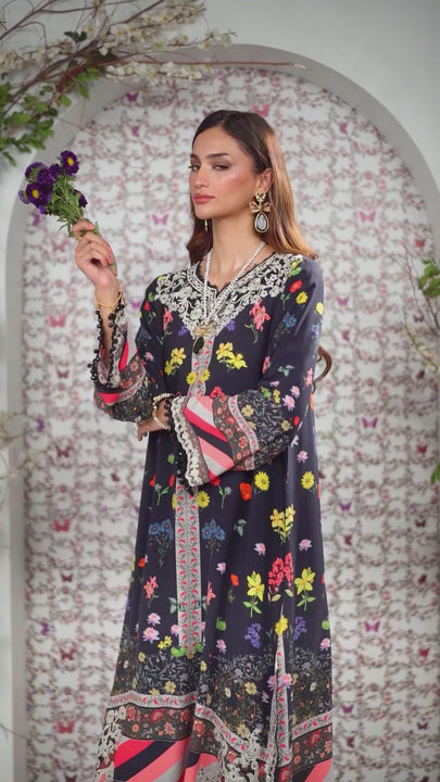 This elegant grip outfit showcases a rich blend of contemporary design. The dark base is beautifully adorned with a vibrant floral print in shades of red, yellow, pink, and green, creating a striking contrast. Intricate beige embroidery on neckline, hem and slits with hand embellishments on neckline and hem motifs, adding a delicate touch of sophistication. The hem and neckline are enhanced with lace detailing, giving the ensemble a refined finish, paired with same printed pants.From our latest silk collection, this graceful grip silk ensemble blends tradition and trend, making it a must-have for lovers of refined silk dresses.
