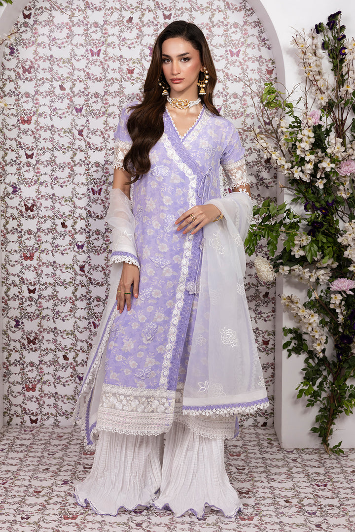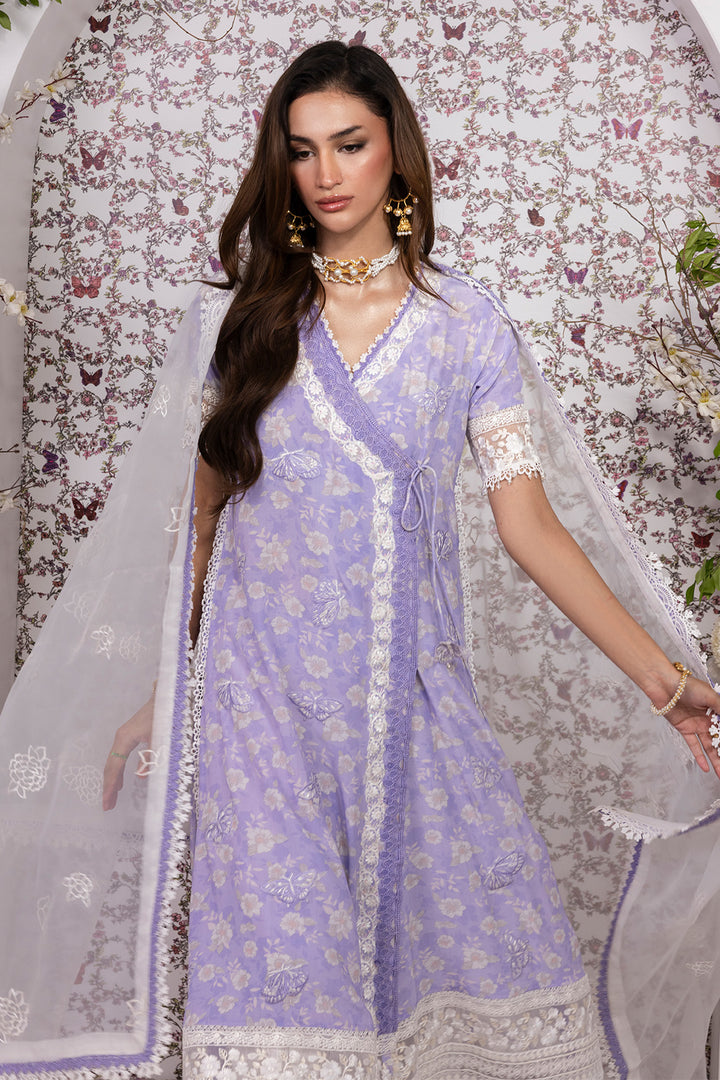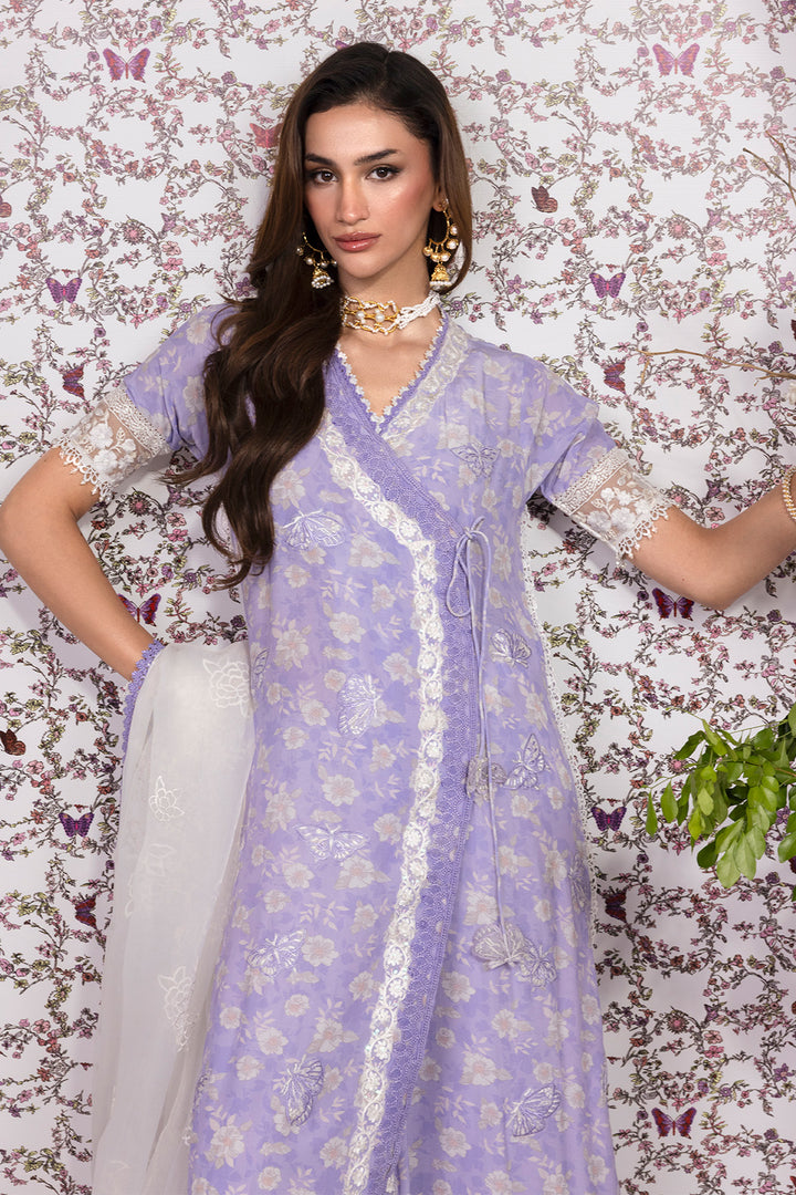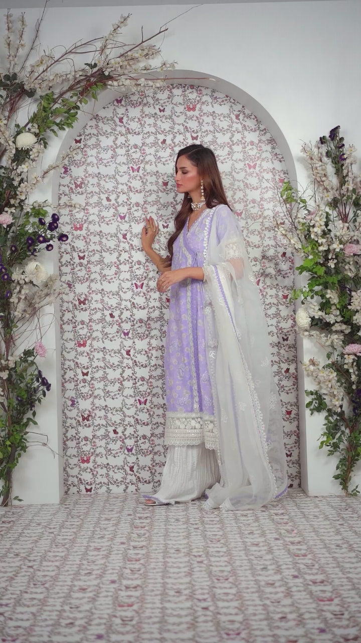 This ethereal outfit on a grip silk base features a soft lavender adorned with delicate white floral print and embroidered butterfly motifs, creating a dreamy and feminine look. The wrap-style shirt is beautifully accented with fine lace trims along the neckline and front. Intricate embroidery on front, neck, hem and sleeves enhances its grace, with lace detailing giving it a refined finish. Paired with a white organza floral embroidered dupatta finished with two tone lace edgings and flowy crushed sharara, This beautifully crafted silk suit on grip fabric captures the essence of luxury silk dresses, straight from our exclusive silk collection.