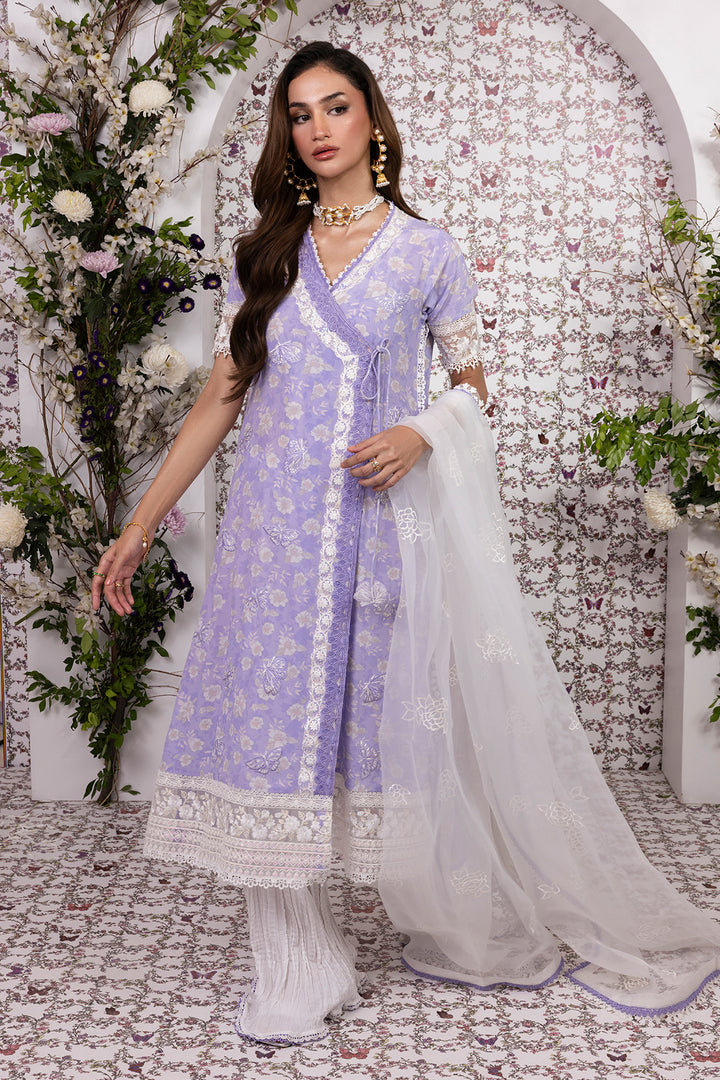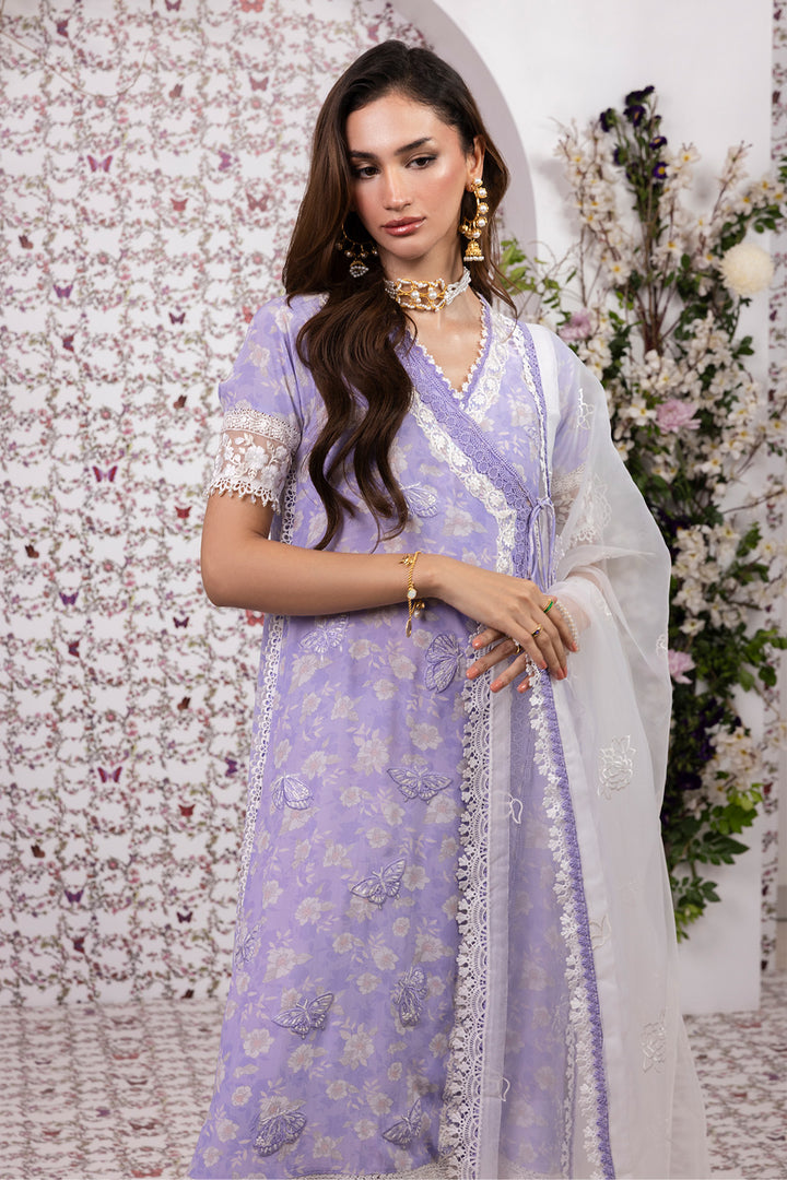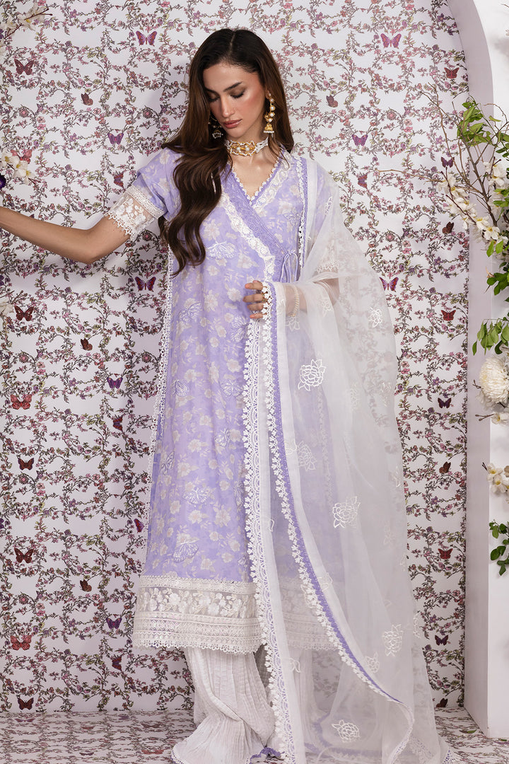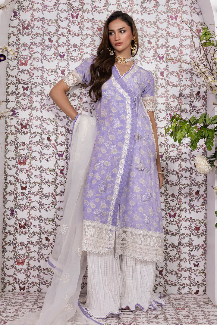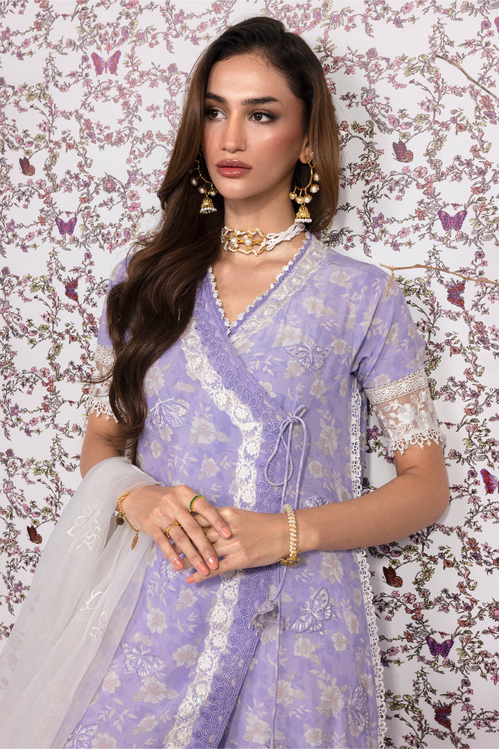 This ethereal outfit on a grip silk base features a soft lavender adorned with delicate white floral print and embroidered butterfly motifs, creating a dreamy and feminine look. The wrap-style shirt is beautifully accented with fine lace trims along the neckline and front. Intricate embroidery on front, neck, hem and sleeves enhances its grace, with lace detailing giving it a refined finish. Paired with a white organza floral embroidered dupatta finished with two tone lace edgings and flowy crushed sharara, This beautifully crafted silk suit on grip fabric captures the essence of luxury silk dresses, straight from our exclusive silk collection.