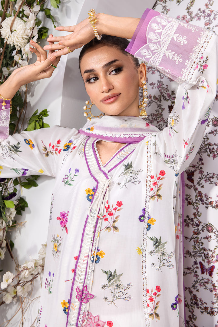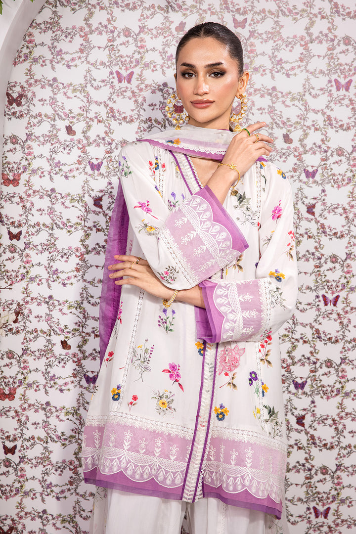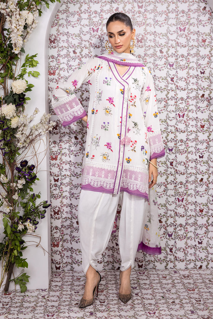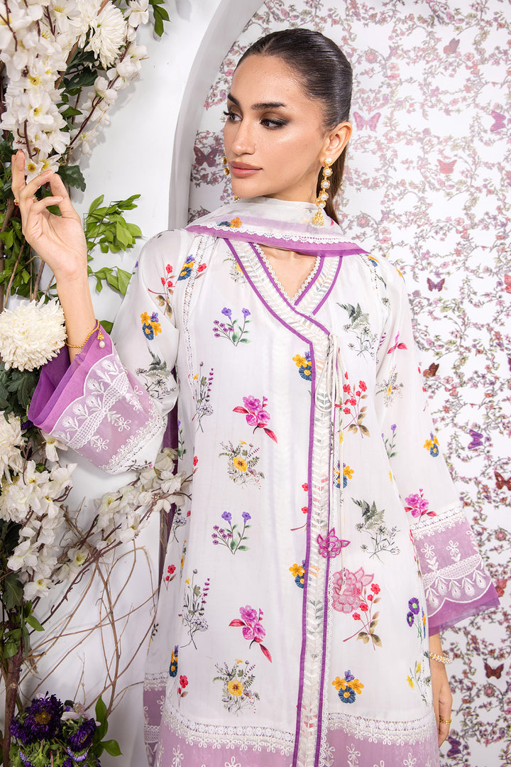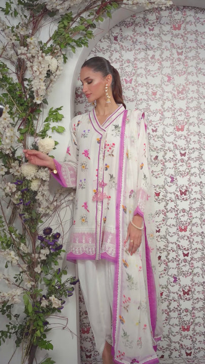 A nod to modern day glamour with our wrap, perfect to carry you from brunch to fancy dinners. This fresh and feminine outfit features a soft white base adorned with a charming multicolored floral print patterned with lavender, yellow and pink flowers, all over. The wrap style shirt is detailed with delicate embroidery along the hem and front, enhanced by lavender piping and lace borders for a pop of contrast. Subtle embroidery border on the sleeves and hem adds a touch of elegance with tonal organza facing, while the flowy chiffon dupatta mirrors the same floral pattern with tonal organza borders edged with lace, completing the look. Paired with classic white tulip pants finished with lace. Effortlessly elegant, this grip-based silk suit is a standout choice for anyone seeking versatile silk dresses in a curated silk collection.