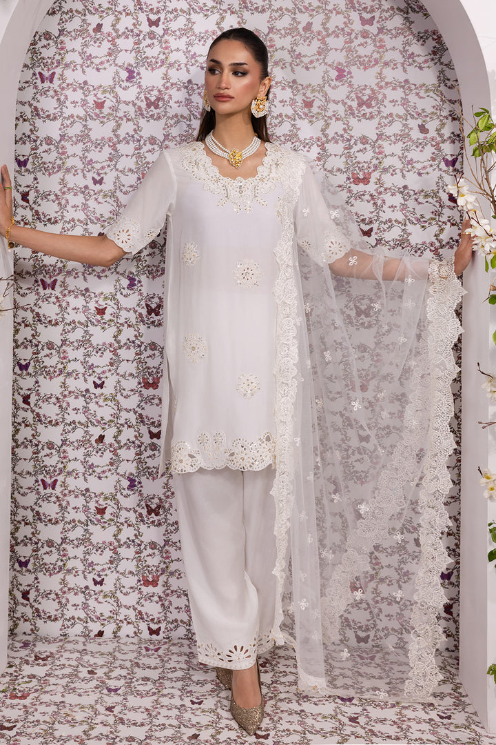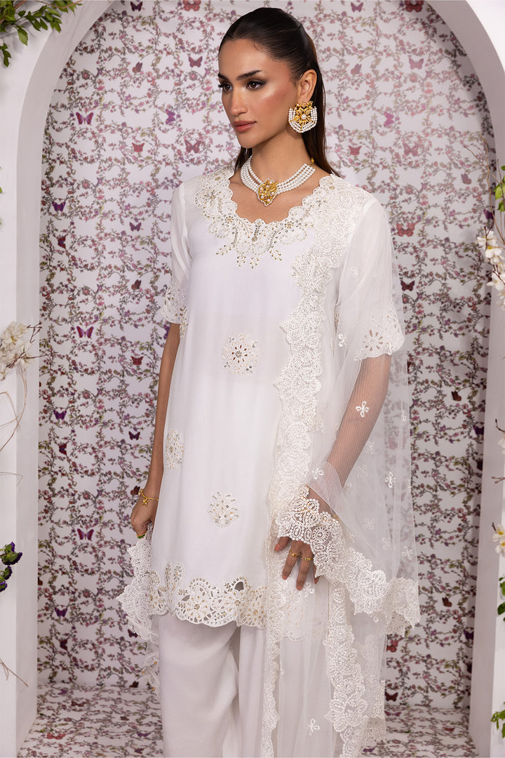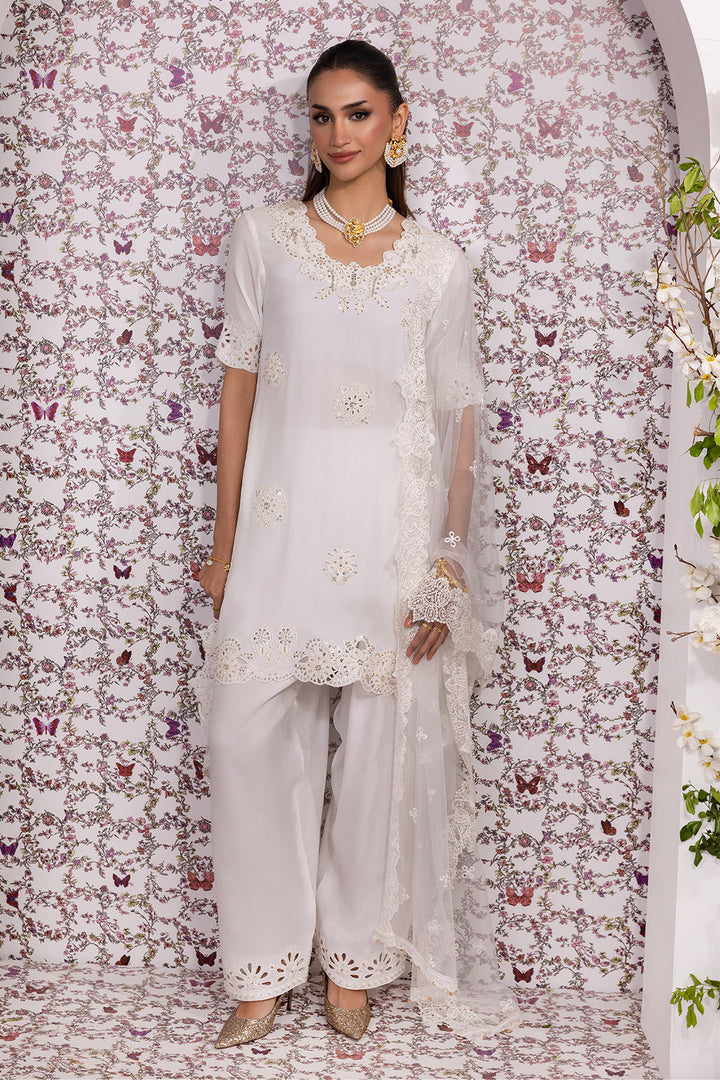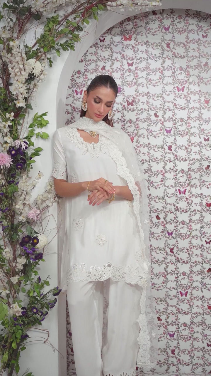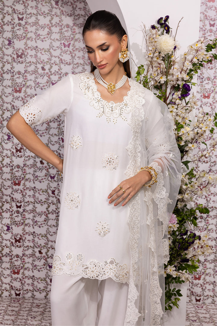 This white Farshi set includes a stunning rawsilk shirt adorned with intricate flower design motifs. The shirt is beautifully embroidered and hand embellished with pearls and crystals, along with cut work detail on hemline and spray. The farshi shalwar features raw silk material adorned with similar embroidered and embellished border. The net dupatta is heavily embroidered with borders and spray for a complete look. Designed on luxurious silk this outfit reflects the charm of classic silk dresses. This elegant raws silk suit, tailored on soft grip fabric, is a highlight from our raw silk collection—perfect for those who love raw silk dresses with timeless flair.