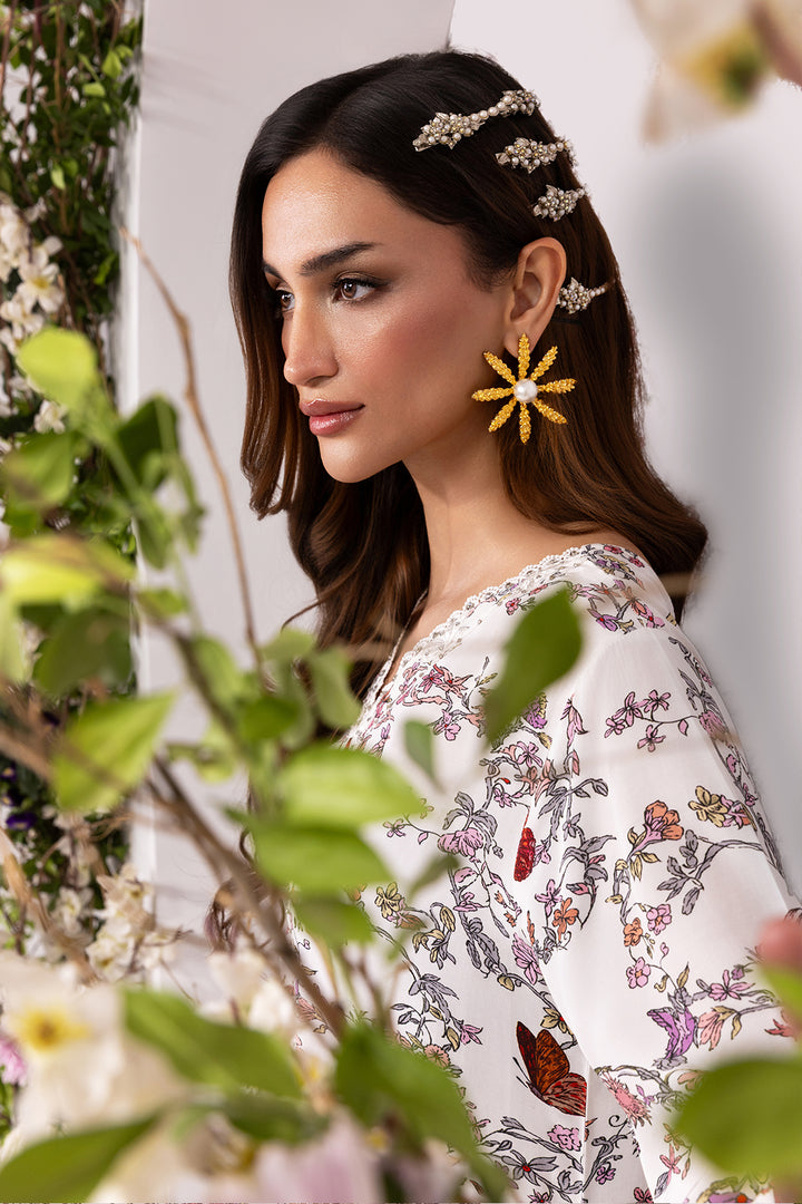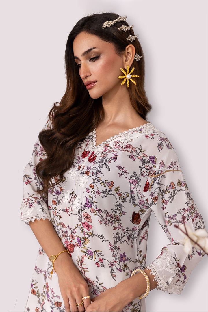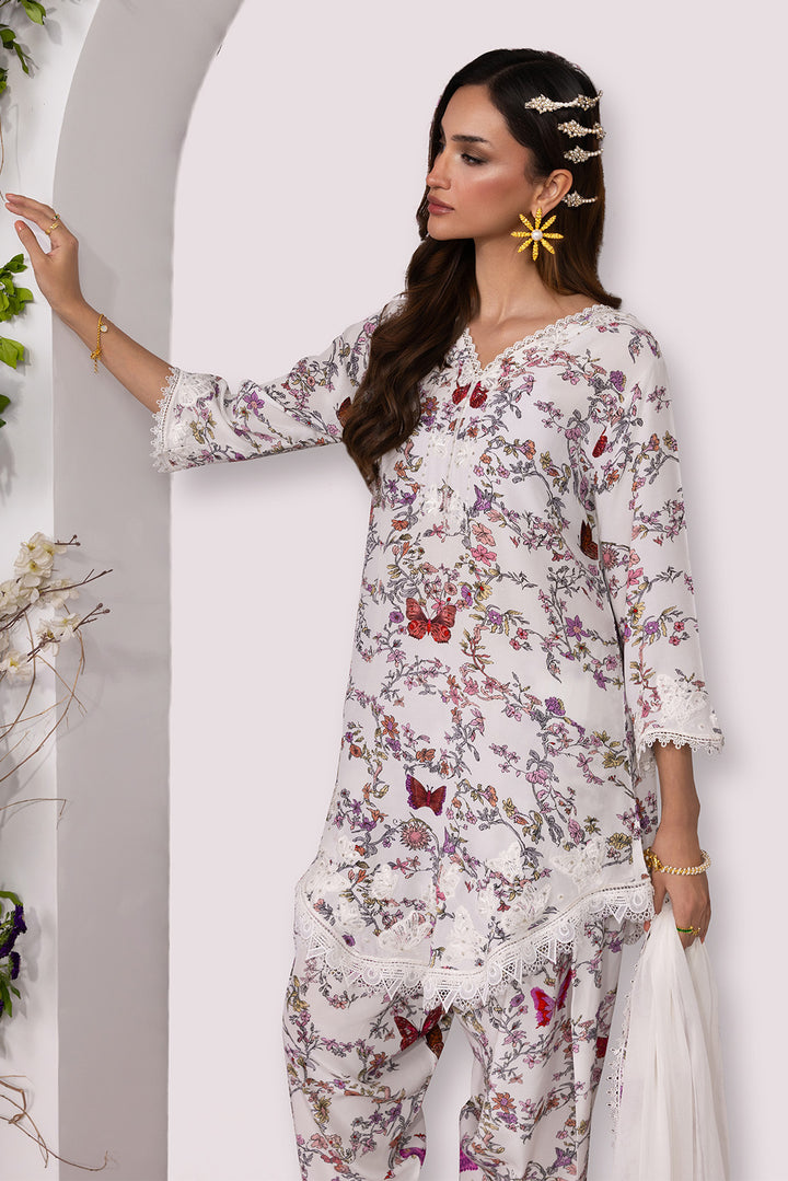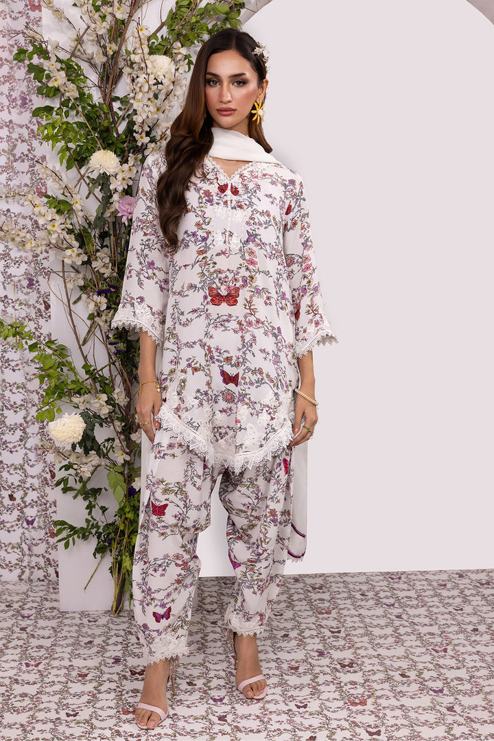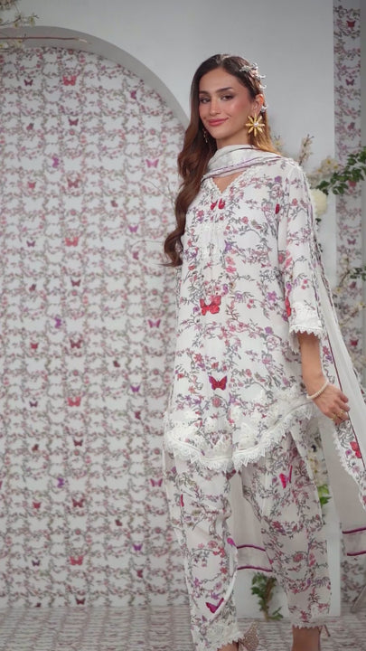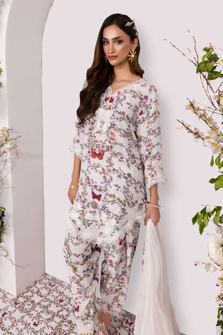 This enchanting grip silk outfit embraces a whimsical charm with its all-over butterfly print on both the shirt and pants, creating a soft, nature-inspired aesthetic. The delicate embroidery on the neckline, sleeves and hemline features butterfly motifs, adding dimension with hand embellishments and elegance to the design. Accented with lace detailing on neck, hem and sleeves the ensemble strikes a perfect balance between playful and graceful. The set is paired with same printed skinny shalwar, and white chiffon edged embroidered dupatta finished with lace details. A signature piece from our silk collection, this silk suit brings a fresh take to silk dresses with its vibrant print and feminine detailing.