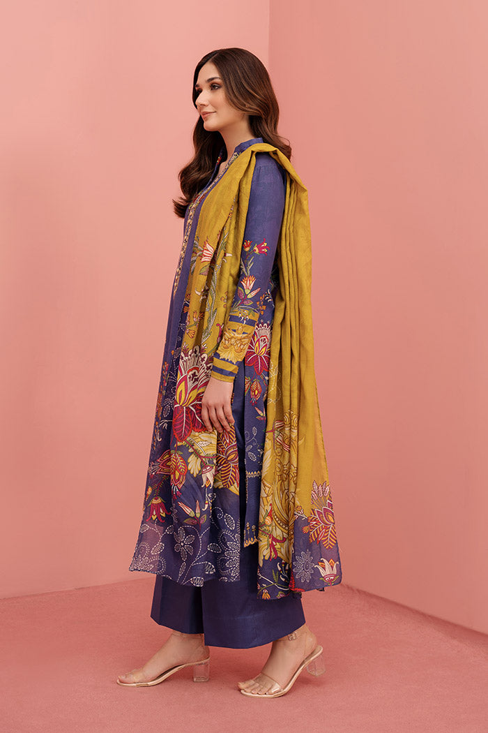 Description: Embody the fusion of sophistication and style with this printed purple shirt and trousers with yellow dupatta.
