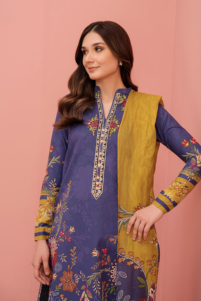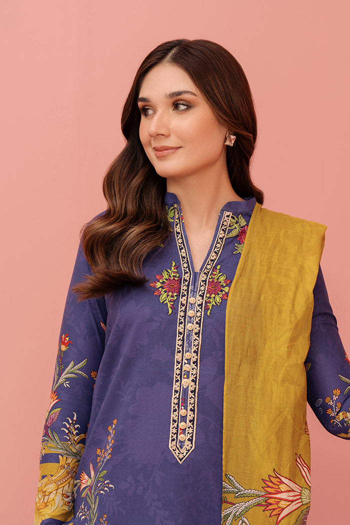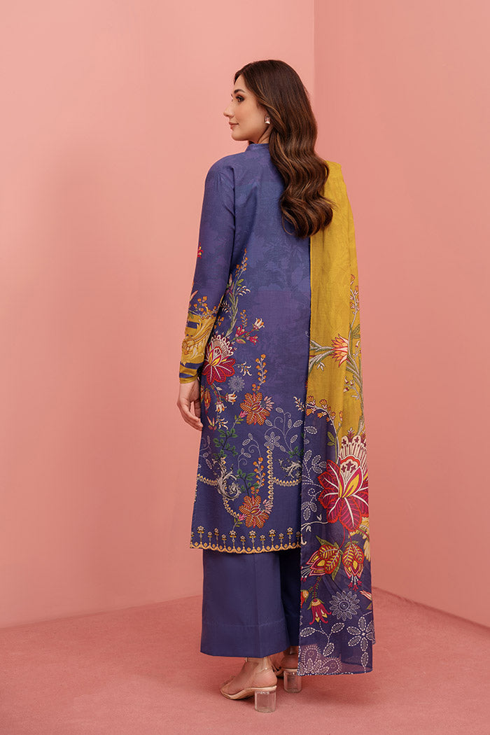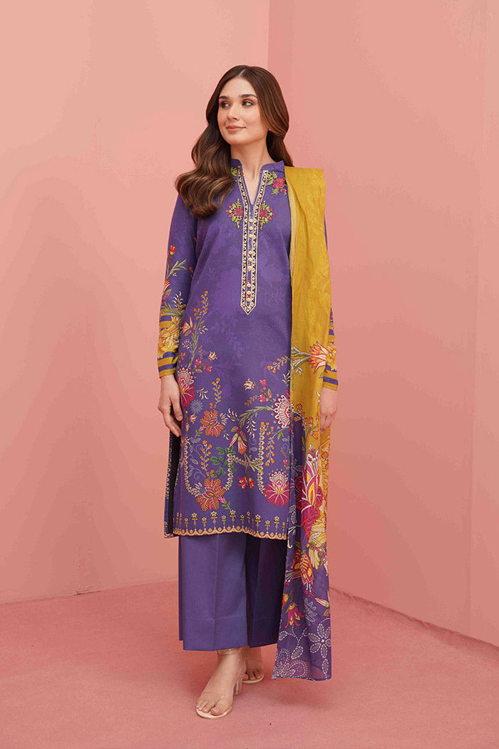 Digital printed Front, Back, Full Sleeves, Band Neckline with Placket paired with Dyed Trousers & edged Dupatta – Embroidered Neckline.