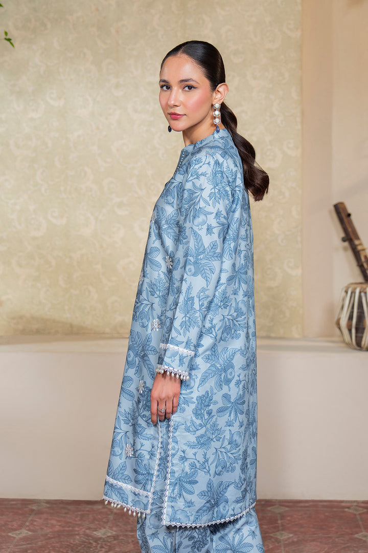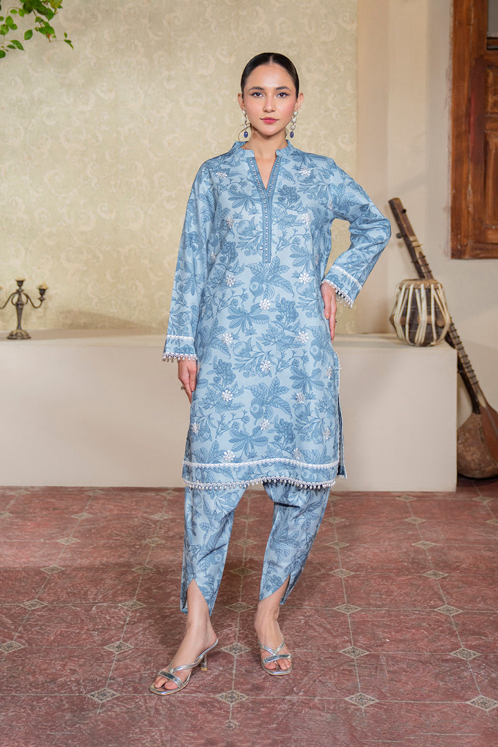 Upgrade your style closet with our two-piece printed embroidered suit, featuring a digital printed lawn shirt paired with printed trousers for a contemporary look.