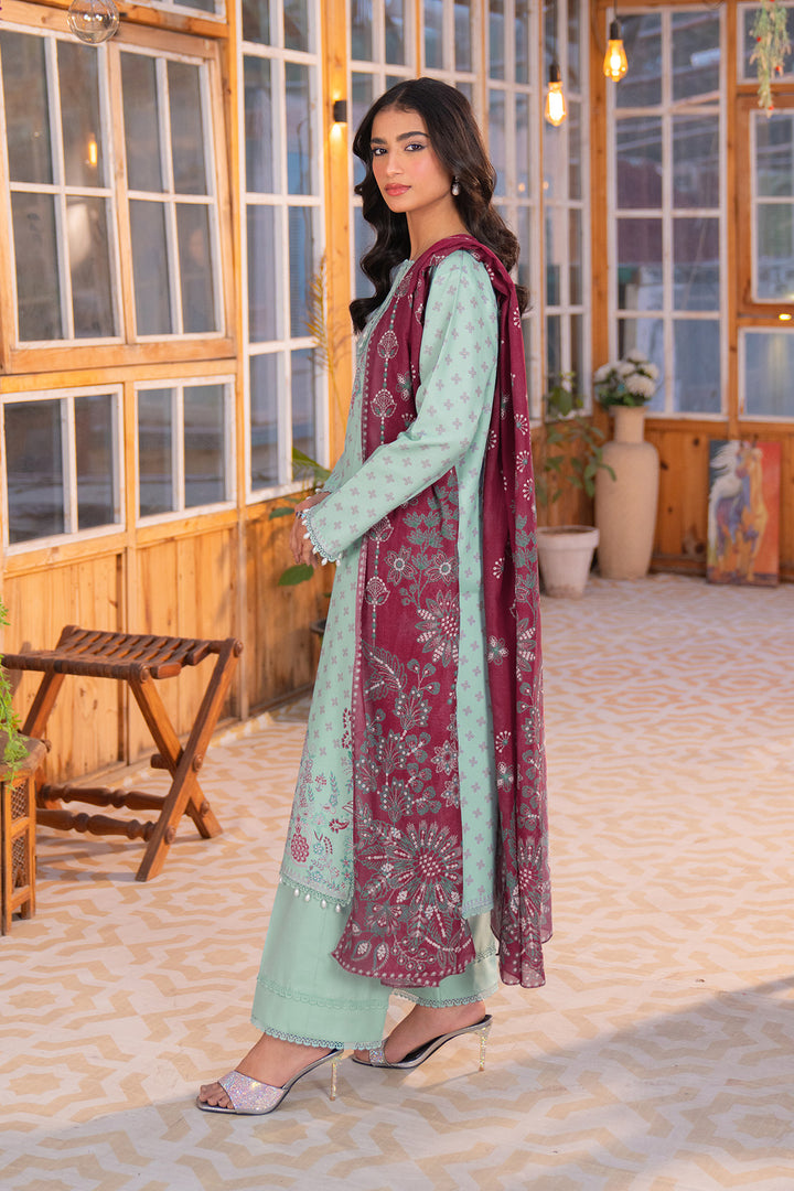 Refine Your Wardrobe with this stunning 3-piece suit, featuring a Digital Printed Lawn suit with a dyed Lawn trouser. Perfect addition to your Lawn collection.