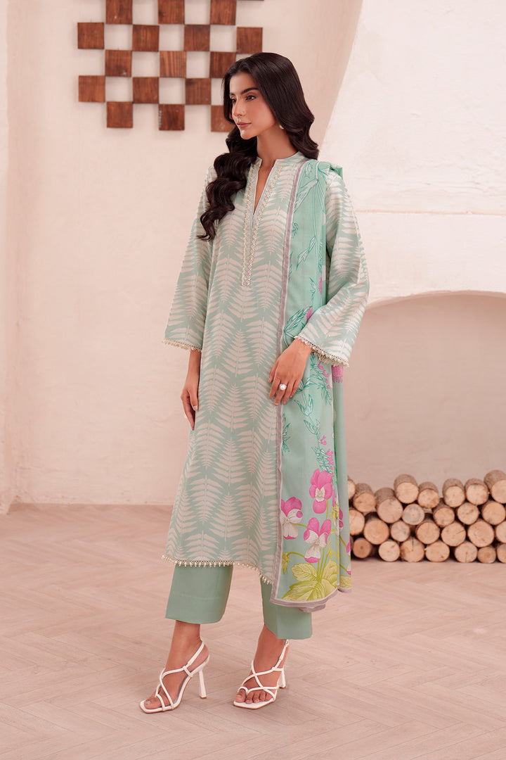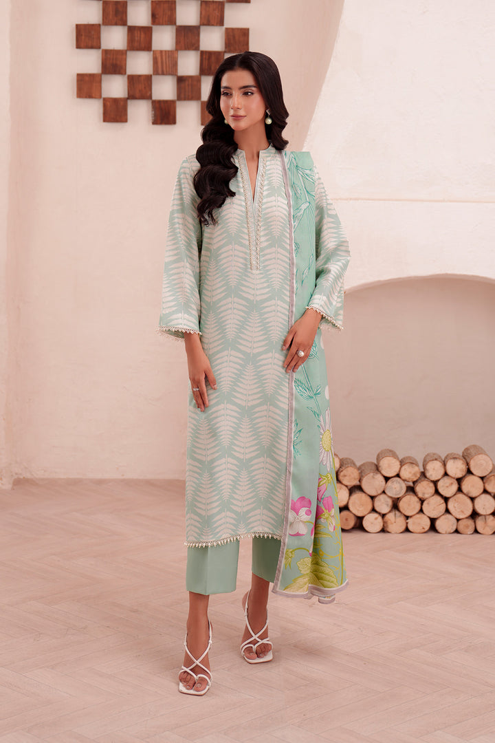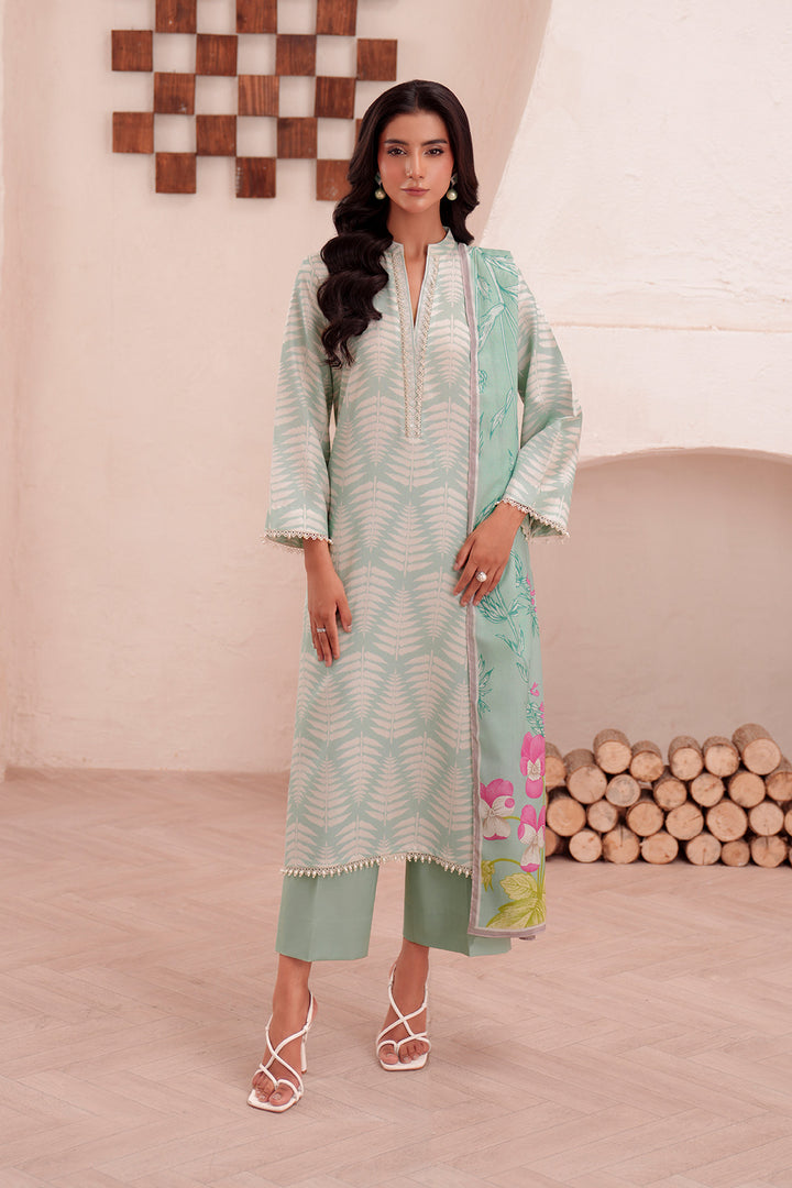 This ensemble features a lawn shirt paired with a printed lawn dupatta and dyed trousers. Perfect to upgrade your lawn suit collection.