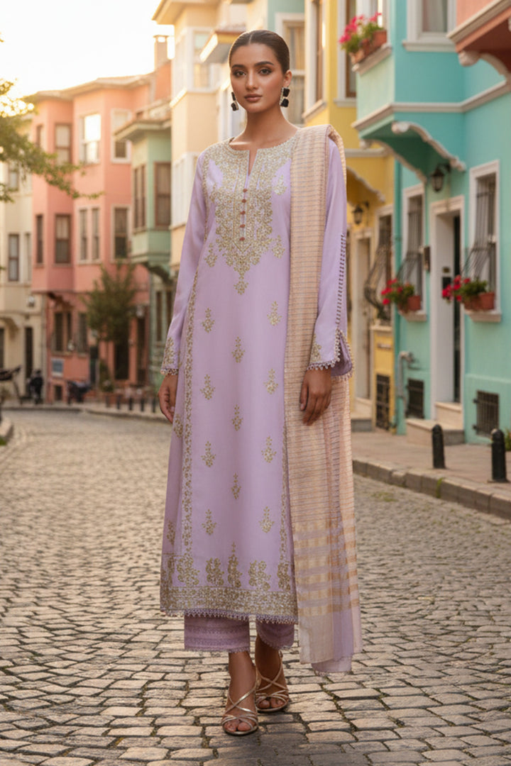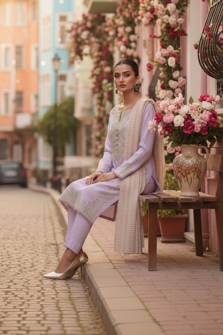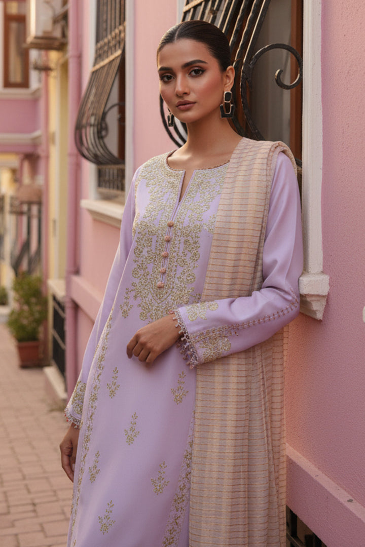 Make a perfect impression this season with our three-piece embroidered Cotton suit design in pastel lilac tone featuring a Cotton dyed shirt, paired with jacquard sequenced dupatta and dyed Cotton trousers. Perfect for your wardrobe!