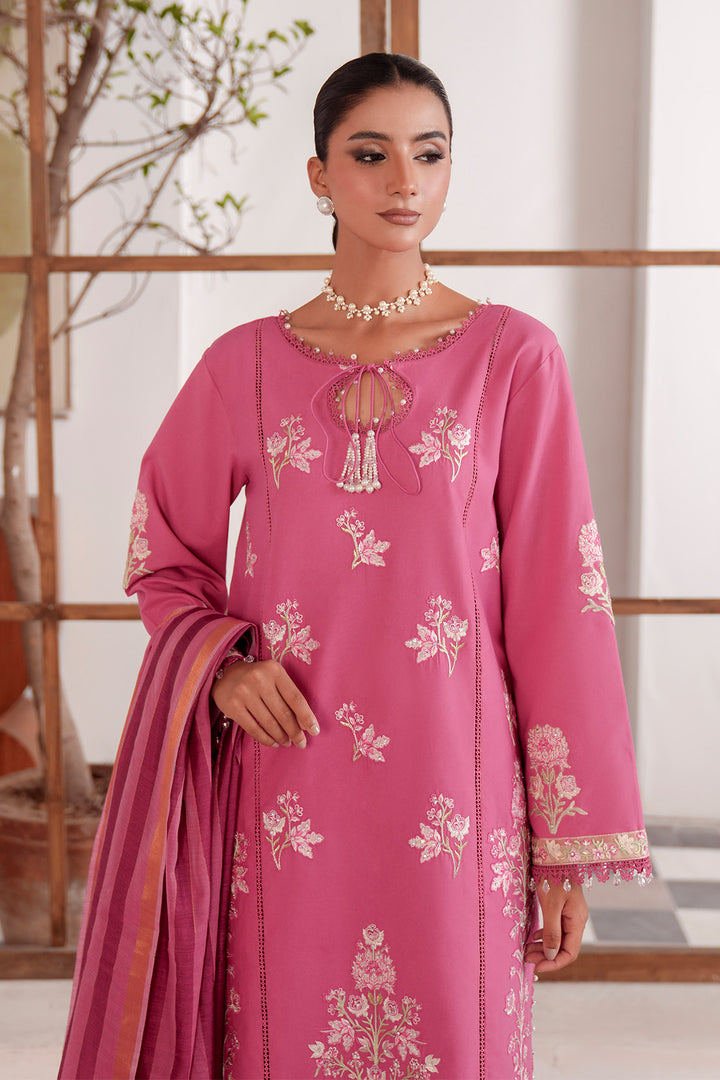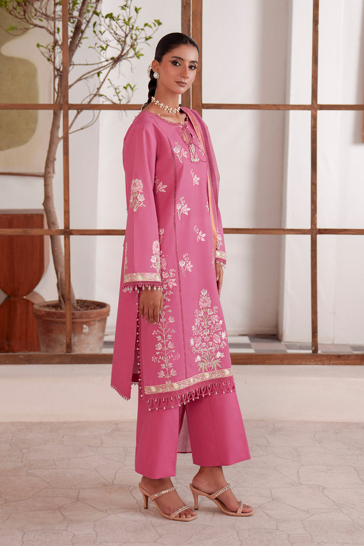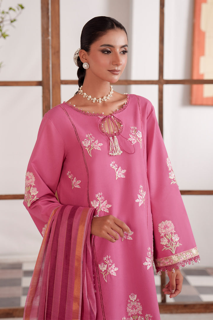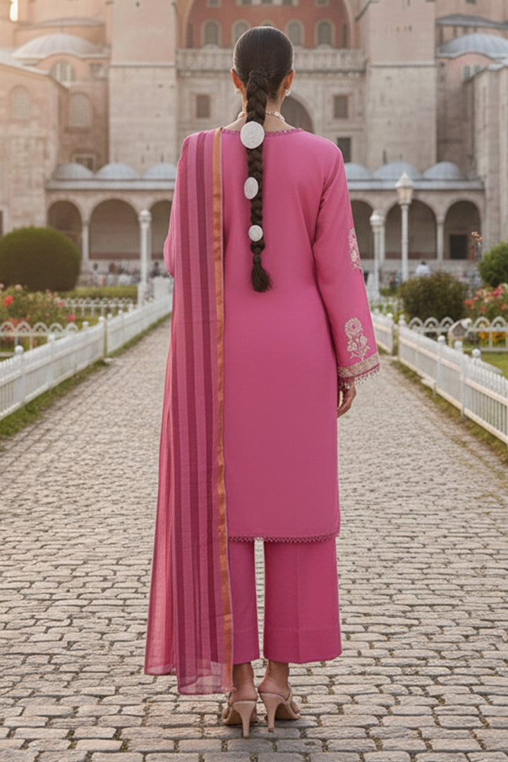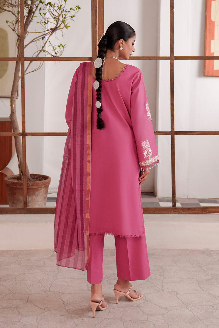 Make the perfect statement with our three-piece embroidered Cotton suit design in hot pink color featuring a Cotton dyed shirt, paired with a jacquard sequenced dupatta and dyed Cotton trousers. Perfect for your wardrobe!
