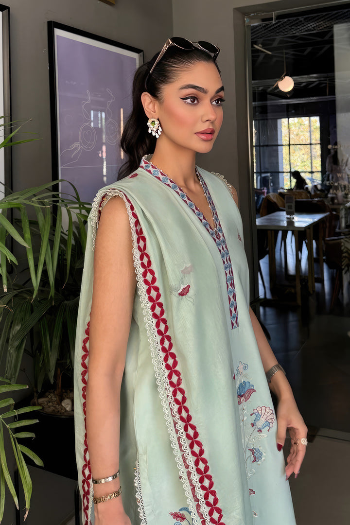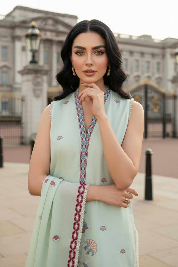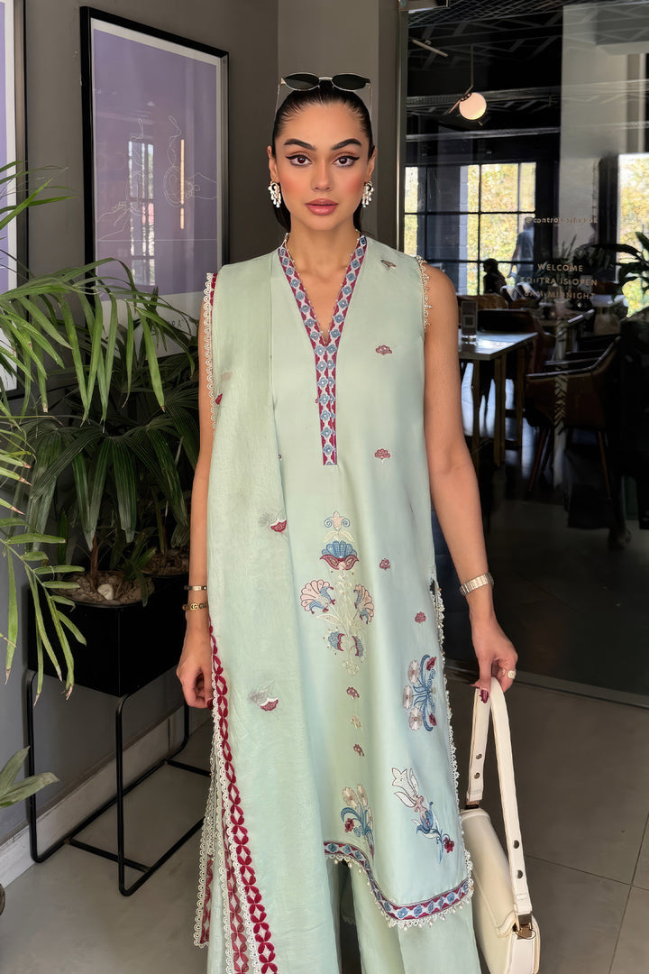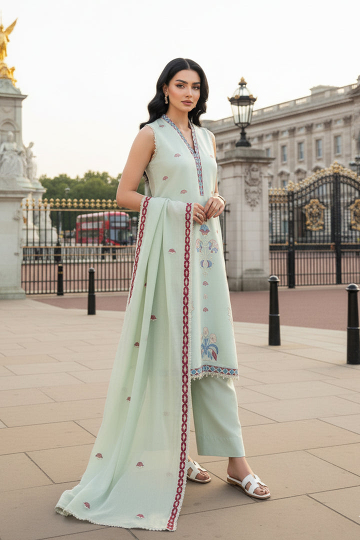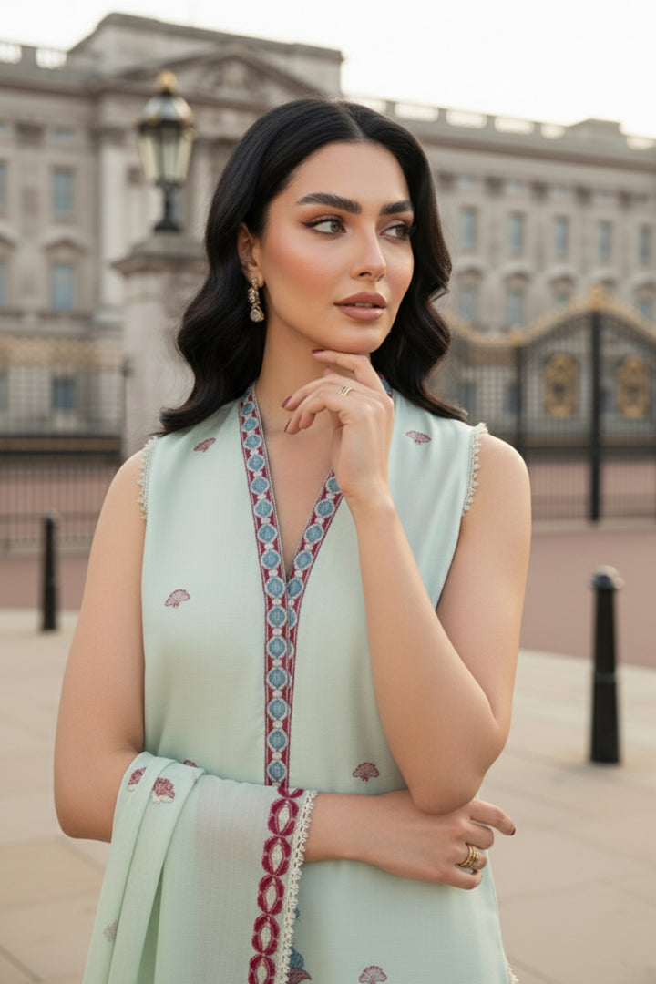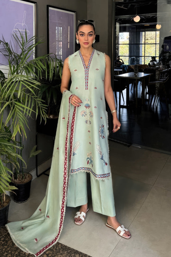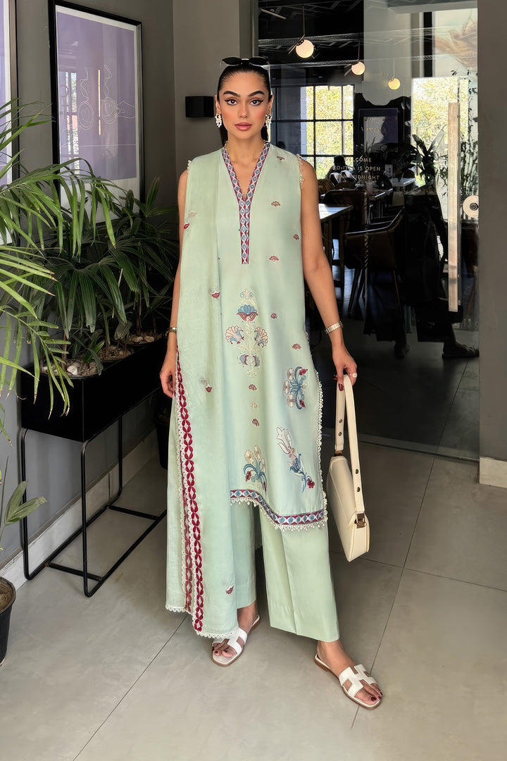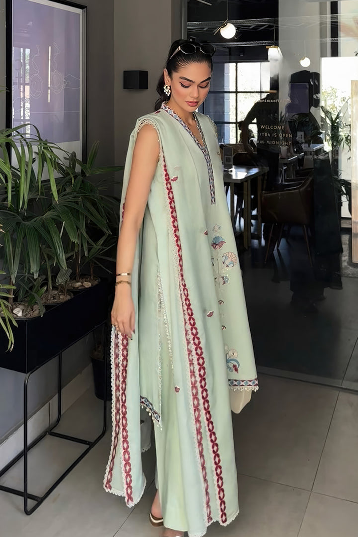 Cotton collection with a perfect blend of comfort and elegance. A soft shimmer that wraps you in quiet grace. A modern classic 3 - piece Cotton suit design : embroidered dyed Cotton shirt and Lawn duppata, complemented by dyed Cotton trousers adding a fashionable edge to your wardrobe