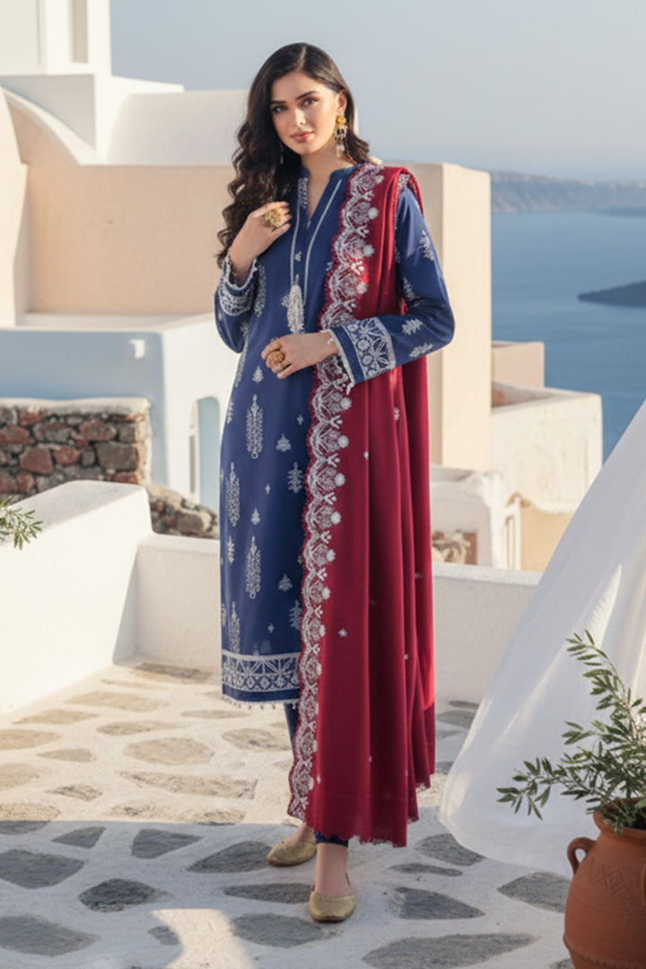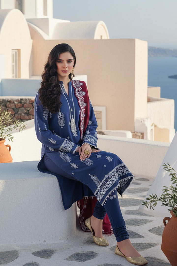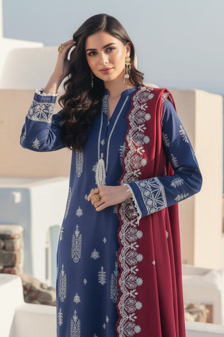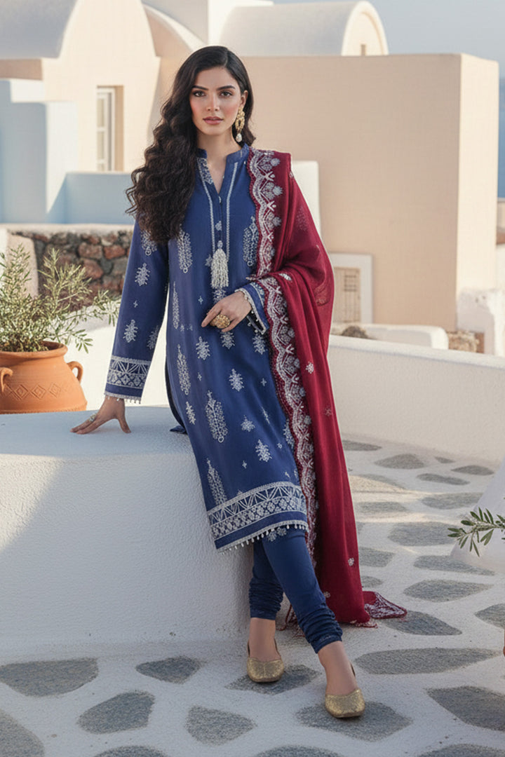Amp up your winter fashion with our three-piece printed khaddar shirt and trouser with embroidered dupatta.