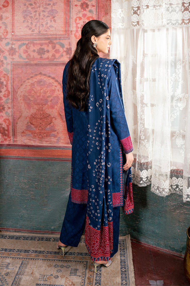 Elevate your everyday style in our Printed embroidered three-piece featuring Printed Khaddar Shirt, trousers & dupatta.